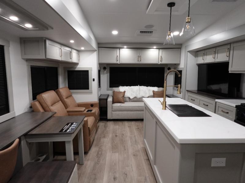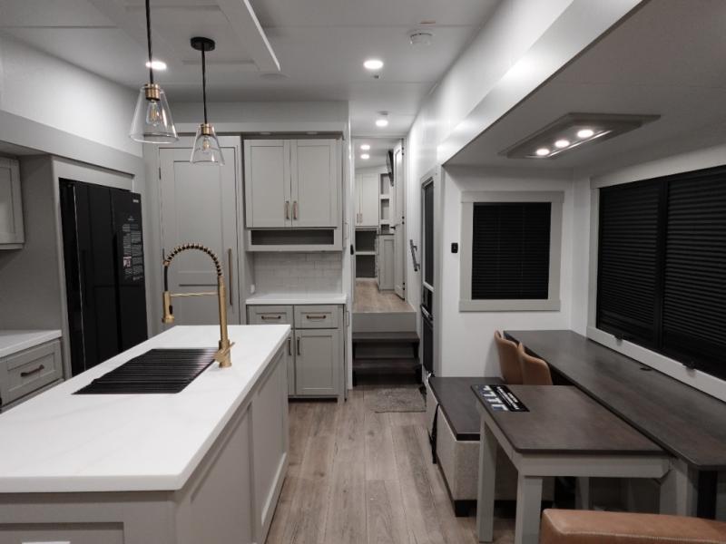 This Model Z luxury fifth wheel is bright and modern on the inside, with loads of amenities that will have you dreaming of your next trip! Enter and find a spacious combined living/kitchen space thanks to dual opposing slides. There is ample seating with a sliding desk/dining table, 62" theater seating, and a 72" tri-fold sofa along the rear wall. You can easily relax and enjoy the 50" Smart telescoping TV with a cozy fireplace below. The kitchen offers all that you need to prepare and cook meals just like home with a 16 cu. ft. refrigerator for your perishables, a 30" microwave oven, and three burner range top and oven. You will love the integrated spice rack, and the kitchen island all outfitted with dog bowls and double pull out trash bins with an integrated Stow 'N Go paper towel holder. There is also an 84" pantry with adjustable shelves for all of your canned and dry goods. Head up the steps to a private master suite with king bed slide. A sliding dresser top features hidden storage which is perfect for jewelry and other personal belongings. The front wardrobe features mirrored doors and the corner closet has been prepped for a stackable washer and dryer if you choose to add that. Relax and enjoy a large bath featuring a linen cabinet, a 30" x 42" shower, and vanity with sink, plus medicine cabinet.