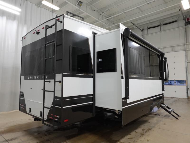 The Brinkley mid-profile Model Z fifth wheels bring you clean lines and an upscale look with plenty of style and exciting new features like the industry first brass plumbing connections. These units also feature an automotive grade front cap, plenty of exterior storage, dual exterior hot and cold showers, and wide stance leveling jacks for easy set up. Residential frameless windows provide a clean look and beautiful views, and ample electrical outlets and 6 USB/USB-C outlets allow all of your electronics and appliances to easily be used and charged.