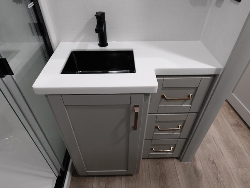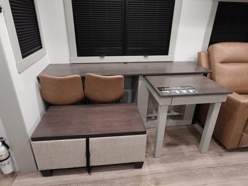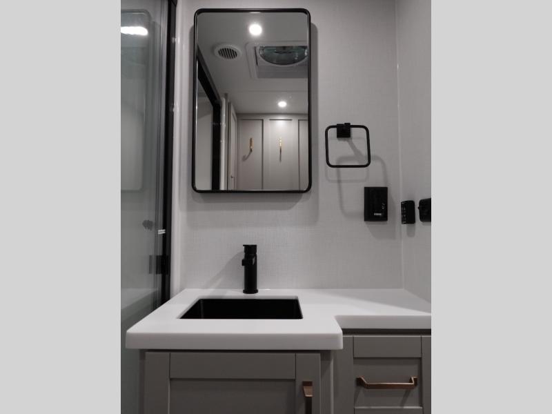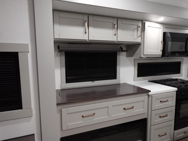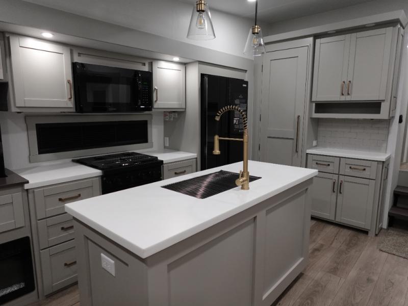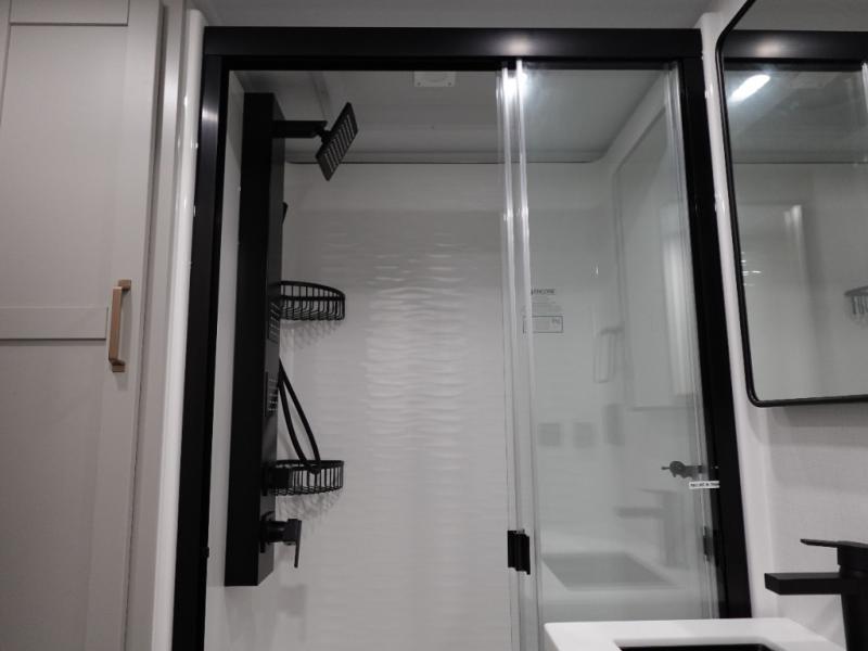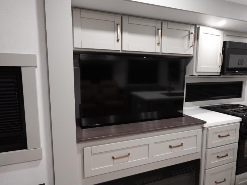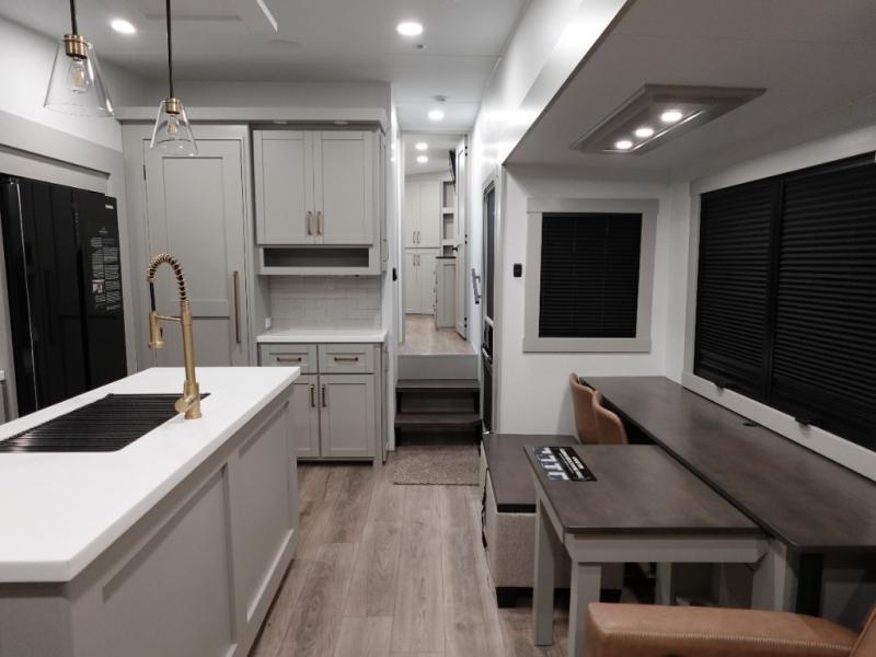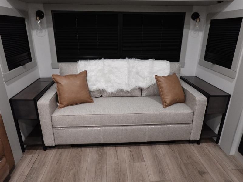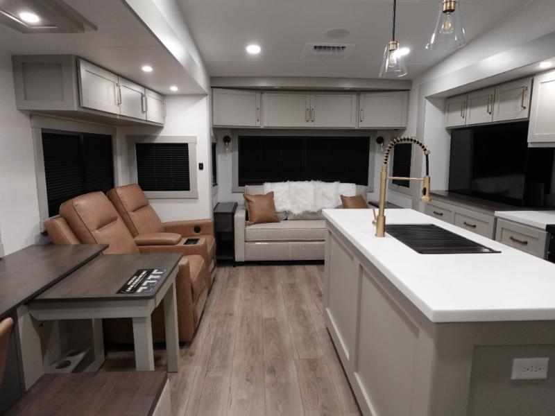This Model Z luxury fifth wheel is bright and modern on the inside, with loads of amenities that will have you dreaming of your next trip! Enter and find a spacious combined living/kitchen space thanks to dual opposing slides. There is ample seating with a sliding desk/dining table, 62" theater seating, and a 72" tri-fold sofa along the rear wall. You can easily relax and enjoy the 50" Smart telescoping TV with a cozy fireplace below. The kitchen offers all that you need to prepare and cook meals just like home with a 16 cu. ft. refrigerator for your perishables, a 30" microwave oven, and three burner range top and oven. You will love the integrated spice rack, and the kitchen island all outfitted with dog bowls and double pull out trash bins with an integrated Stow 'N Go paper towel holder. There is also an 84" pantry with adjustable shelves for all of your canned and dry goods. Head up the steps to a private master suite with king bed slide. A sliding dresser top features hidden storage which is perfect for jewelry and other personal belongings. The front wardrobe features mirrored doors and the corner closet has been prepped for a stackable washer and dryer if you choose to add that. Relax and enjoy a large bath featuring a linen cabinet, a 30" x 42" shower, and vanity with sink, plus medicine cabinet.