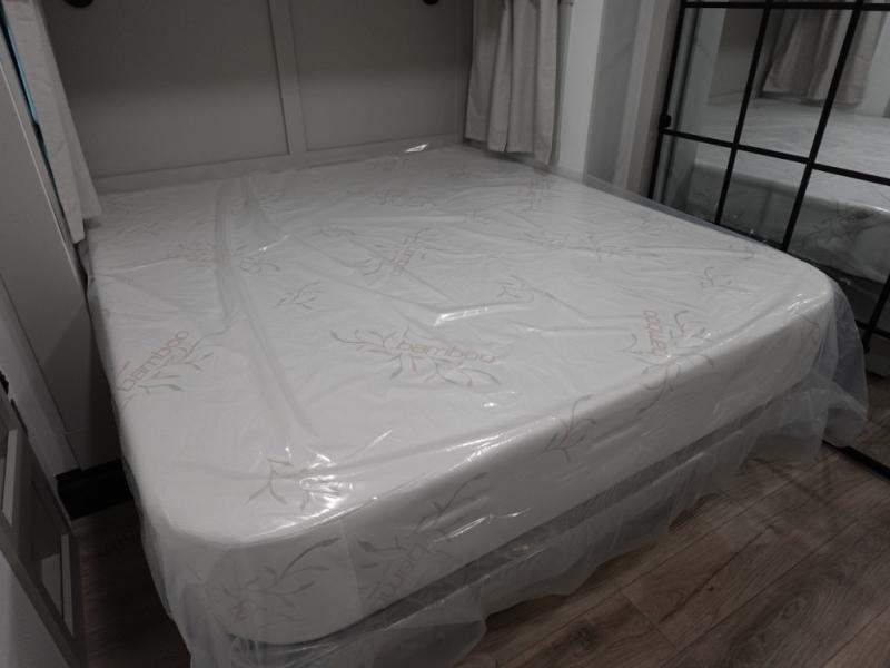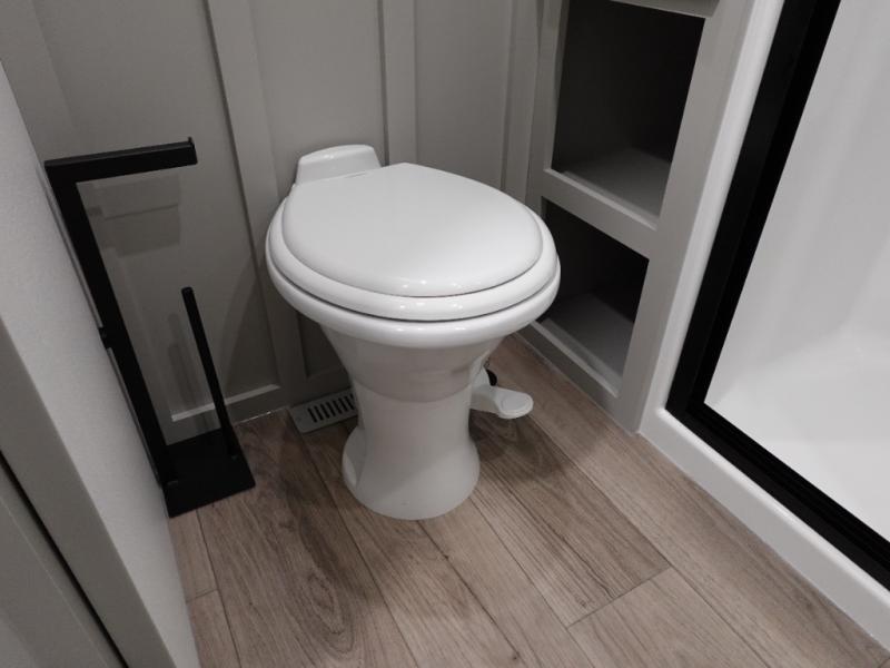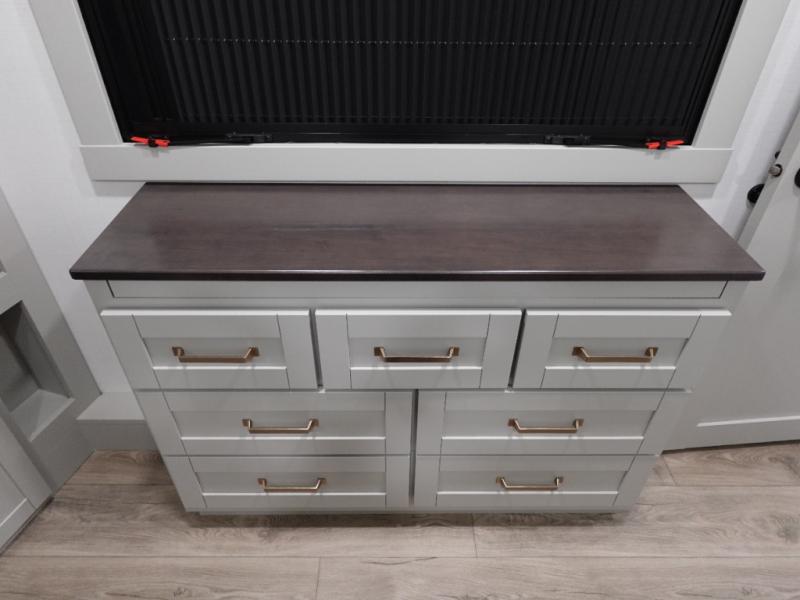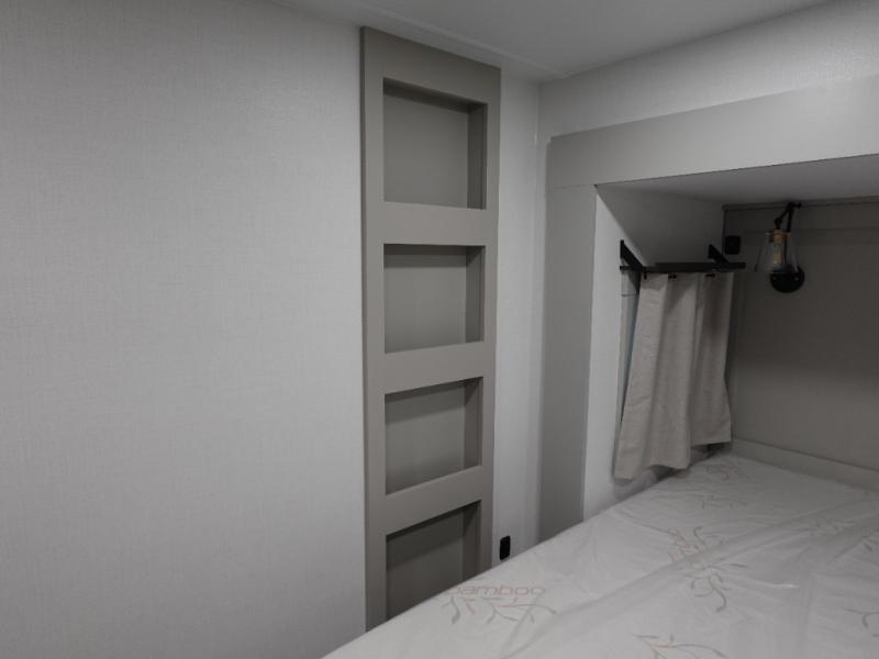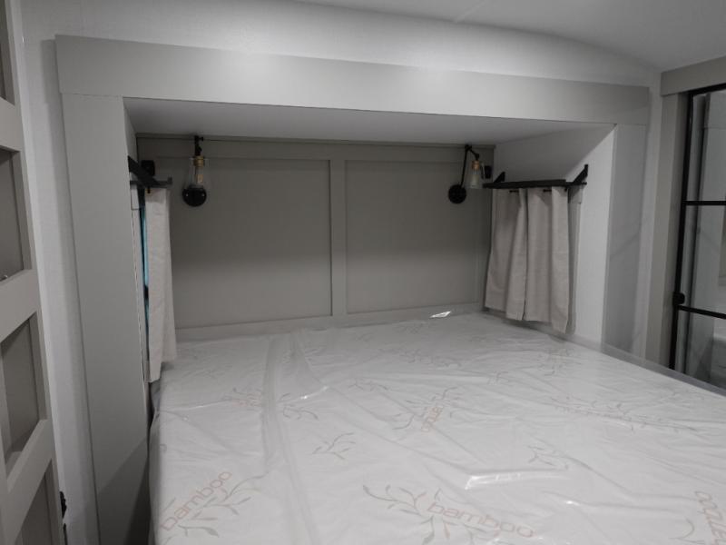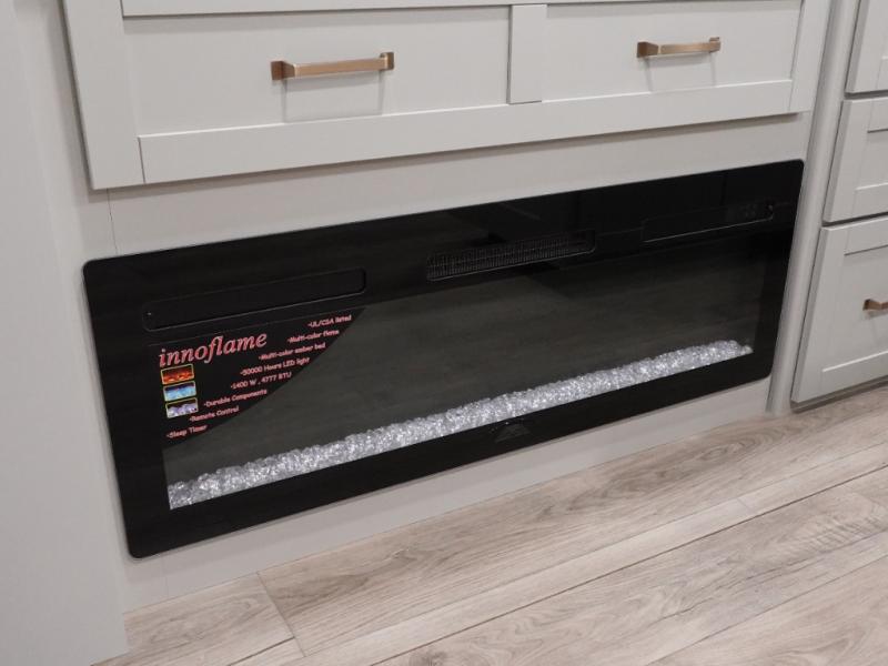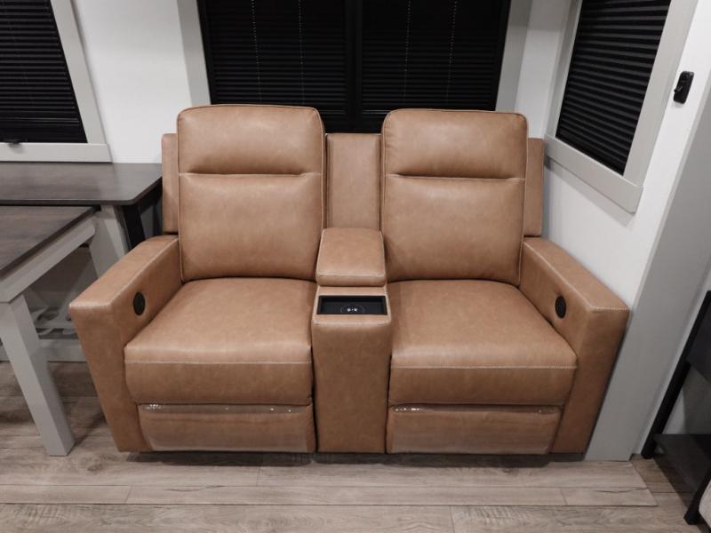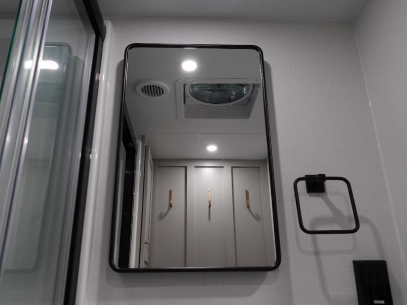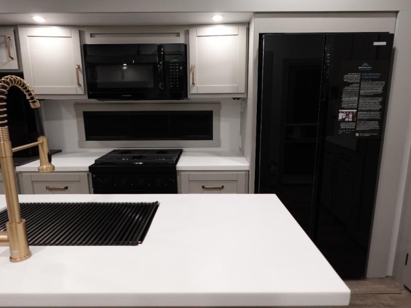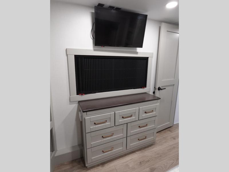 This Model Z luxury fifth wheel is bright and modern on the inside, with loads of amenities that will have you dreaming of your next trip! Enter and find a spacious combined living/kitchen space thanks to dual opposing slides. There is ample seating with a sliding desk/dining table, 62" theater seating, and a 72" tri-fold sofa along the rear wall. You can easily relax and enjoy the 50" Smart telescoping TV with a cozy fireplace below. The kitchen offers all that you need to prepare and cook meals just like home with a 16 cu. ft. refrigerator for your perishables, a 30" microwave oven, and three burner range top and oven. You will love the integrated spice rack, and the kitchen island all outfitted with dog bowls and double pull out trash bins with an integrated Stow 'N Go paper towel holder. There is also an 84" pantry with adjustable shelves for all of your canned and dry goods. Head up the steps to a private master suite with king bed slide. A sliding dresser top features hidden storage which is perfect for jewelry and other personal belongings. The front wardrobe features mirrored doors and the corner closet has been prepped for a stackable washer and dryer if you choose to add that. Relax and enjoy a large bath featuring a linen cabinet, a 30" x 42" shower, and vanity with sink, plus medicine cabinet.