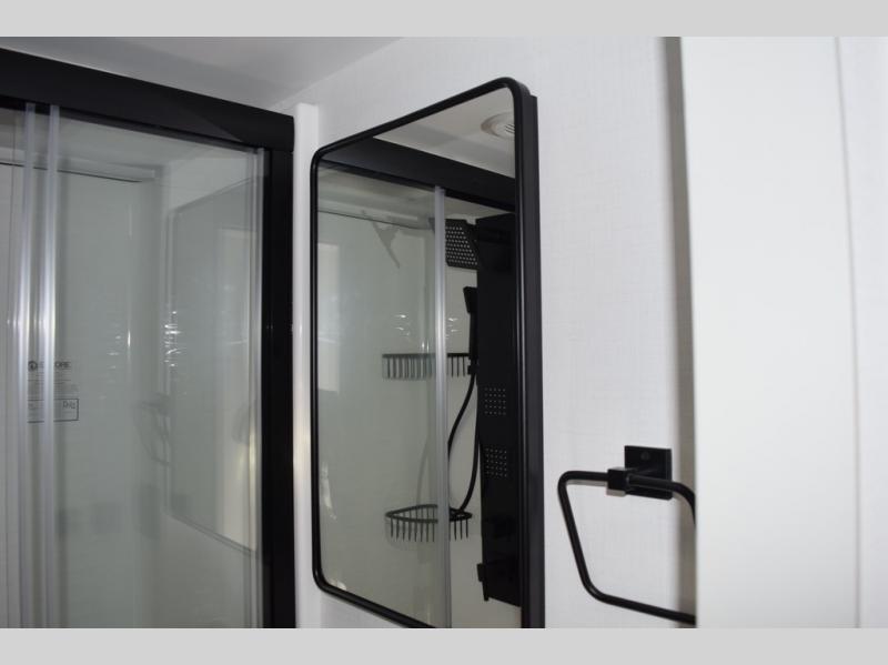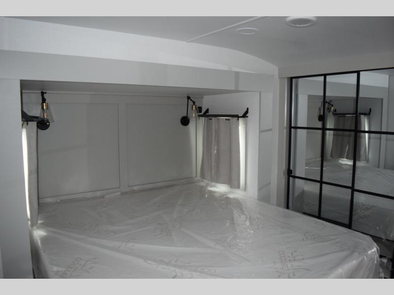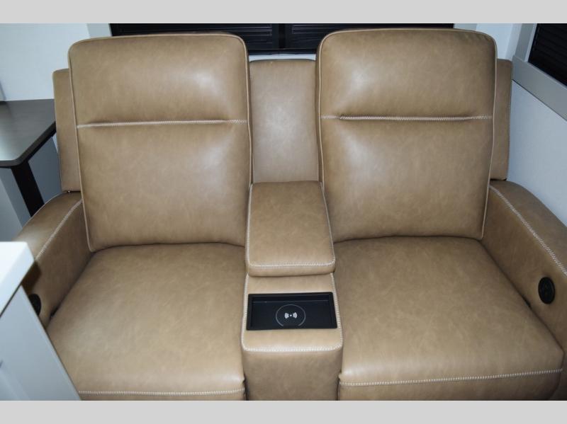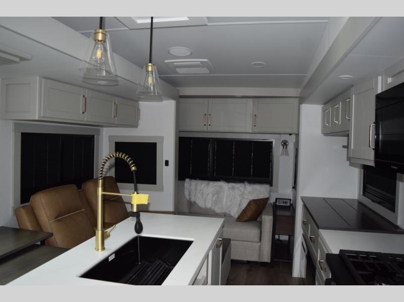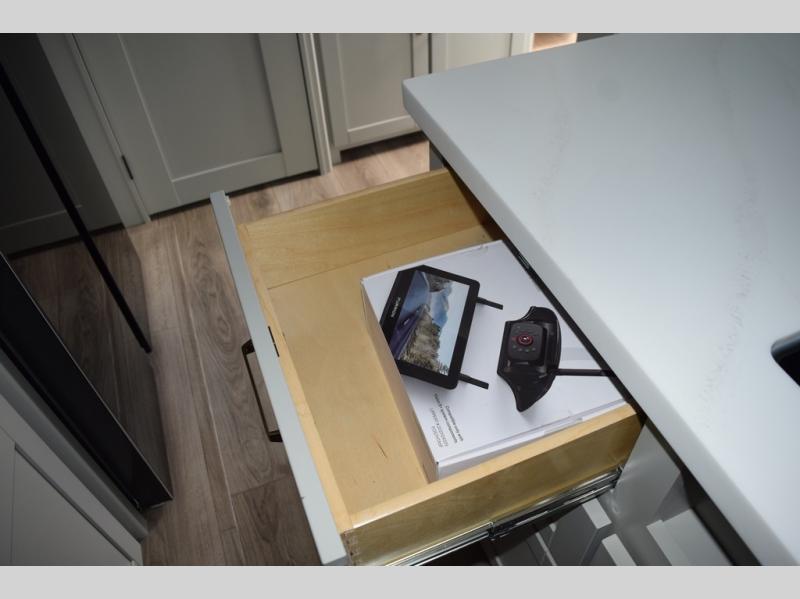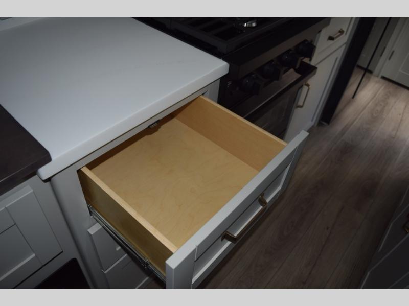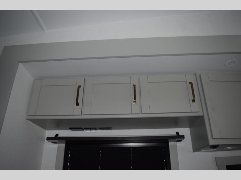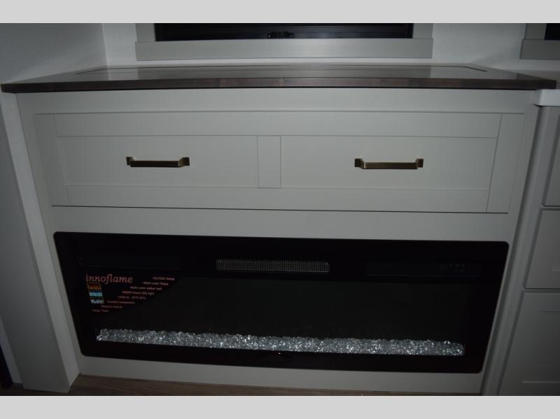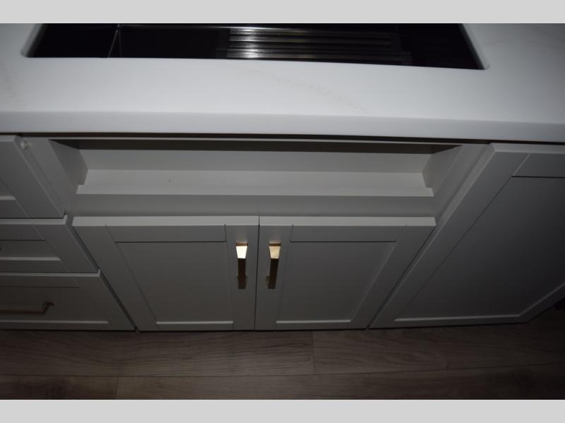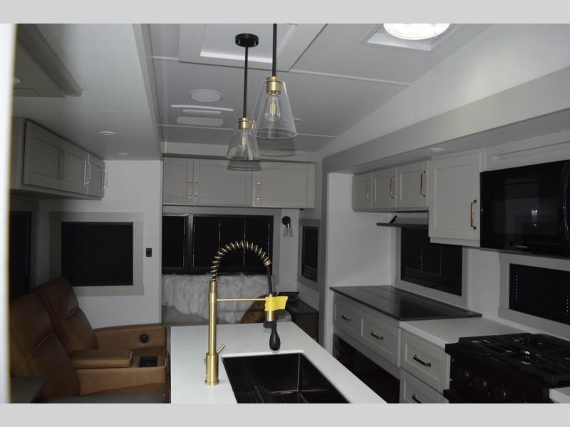 This Model Z luxury fifth wheel is bright and modern on the inside, with loads of amenities that will have you dreaming of your next trip! Enter and find a spacious combined living/kitchen space thanks to dual opposing slides. There is ample seating with a sliding desk/dining table, 62" theater seating, and a 72" tri-fold sofa along the rear wall. You can easily relax and enjoy the 50" Smart telescoping TV with a cozy fireplace below. The kitchen offers all that you need to prepare and cook meals just like home with a 16 cu. ft. refrigerator for your perishables, a 30" microwave oven, and three burner range top and oven. You will love the integrated spice rack, and the kitchen island all outfitted with dog bowls and double pull out trash bins with an integrated Stow 'N Go paper towel holder. There is also an 84" pantry with adjustable shelves for all of your canned and dry goods. Head up the steps to a private master suite with king bed slide. You can opt for the queen bed if you like. A sliding dresser top features hidden storage which is perfect for jewelry and other personal belongings. The front wardrobe features mirrored doors and the corner closet has been prepped for a stackable washer and dryer if you choose to add that option. Relax and enjoy a large bath featuring a linen cabinet, a 30" x 42" shower, and vanity with sink, plus medicine cabinet.