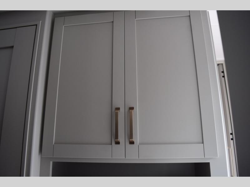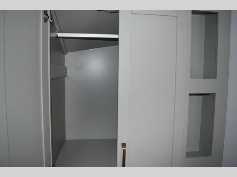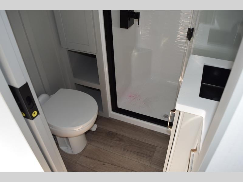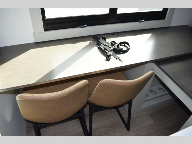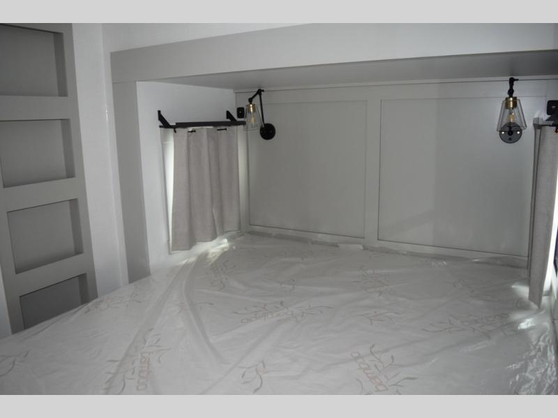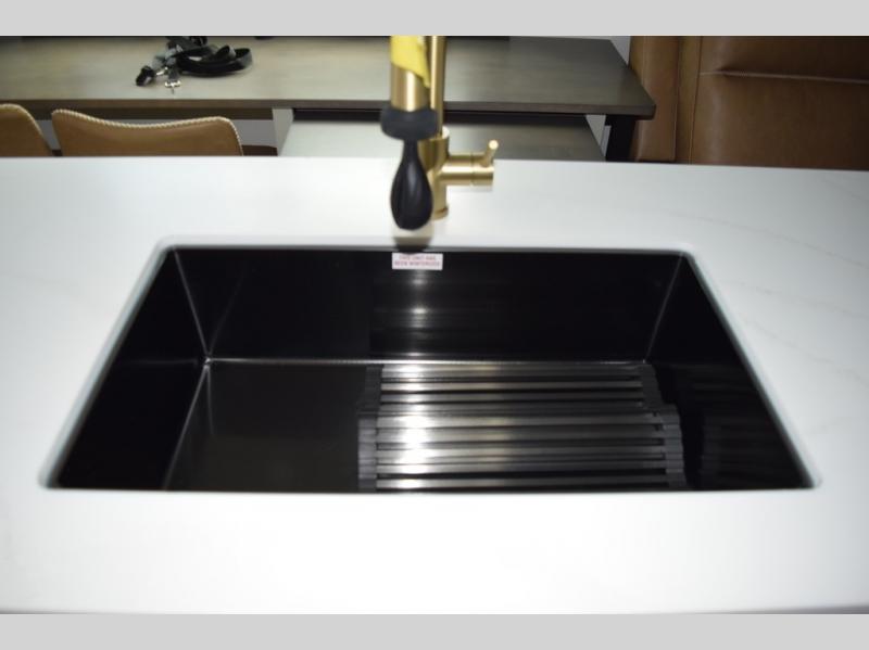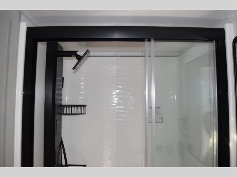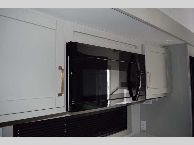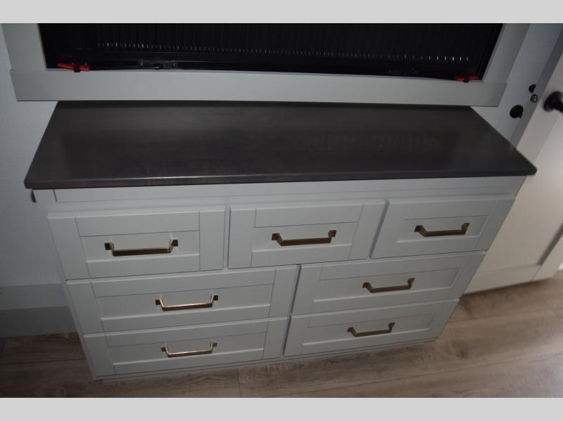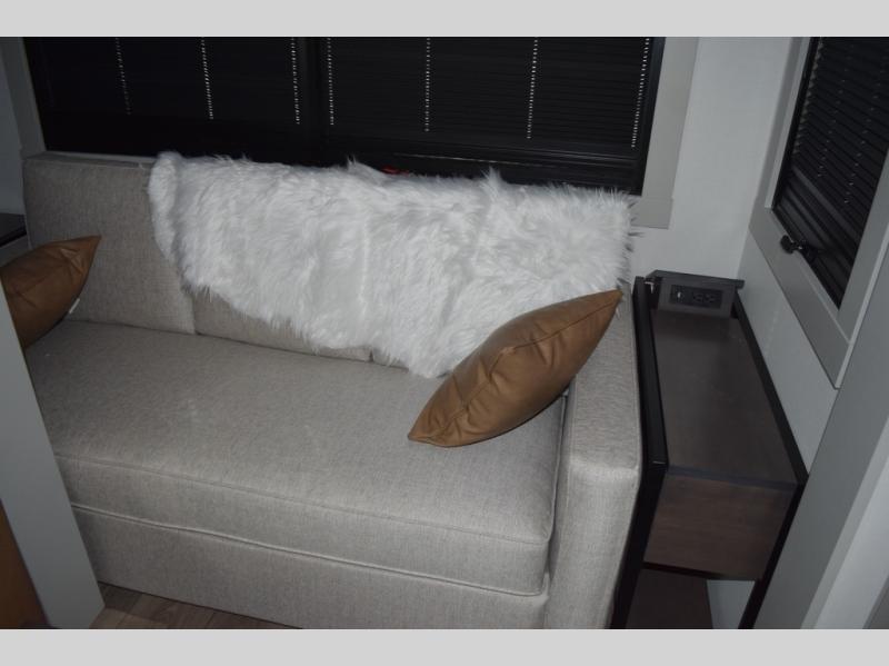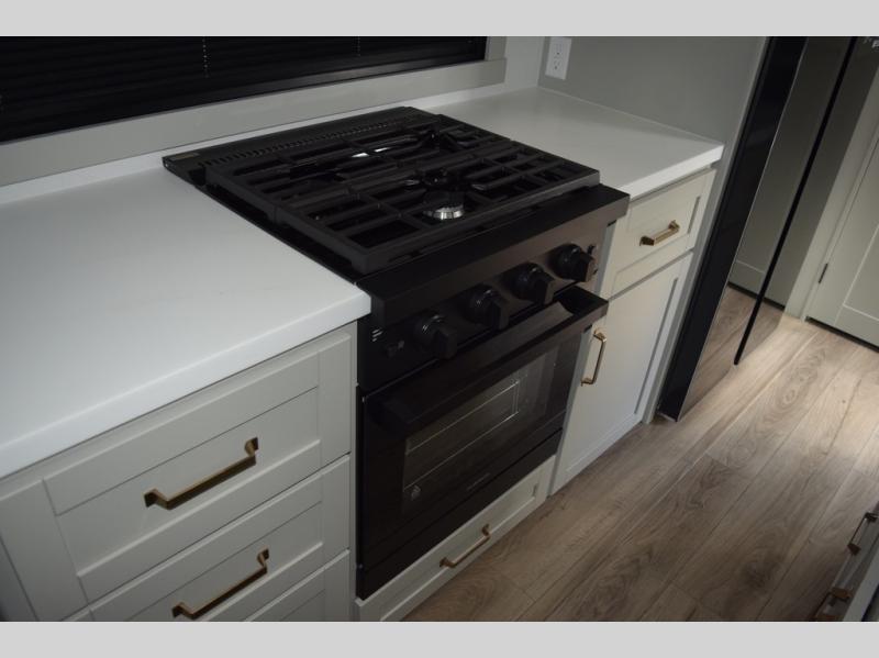 This Model Z luxury fifth wheel is bright and modern on the inside, with loads of amenities that will have you dreaming of your next trip! Enter and find a spacious combined living/kitchen space thanks to dual opposing slides. There is ample seating with a sliding desk/dining table, 62" theater seating, and a 72" tri-fold sofa along the rear wall. You can easily relax and enjoy the 50" Smart telescoping TV with a cozy fireplace below. The kitchen offers all that you need to prepare and cook meals just like home with a 16 cu. ft. refrigerator for your perishables, a 30" microwave oven, and three burner range top and oven. You will love the integrated spice rack, and the kitchen island all outfitted with dog bowls and double pull out trash bins with an integrated Stow 'N Go paper towel holder. There is also an 84" pantry with adjustable shelves for all of your canned and dry goods. Head up the steps to a private master suite with king bed slide. You can opt for the queen bed if you like. A sliding dresser top features hidden storage which is perfect for jewelry and other personal belongings. The front wardrobe features mirrored doors and the corner closet has been prepped for a stackable washer and dryer if you choose to add that option. Relax and enjoy a large bath featuring a linen cabinet, a 30" x 42" shower, and vanity with sink, plus medicine cabinet.