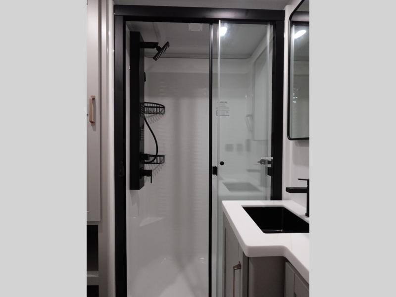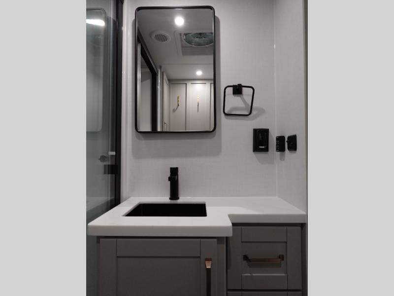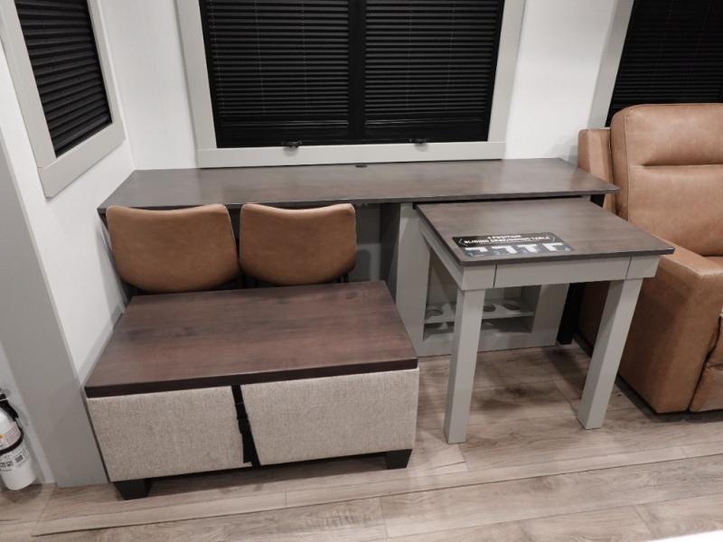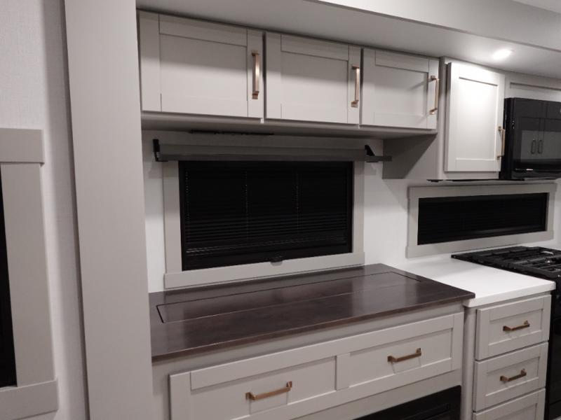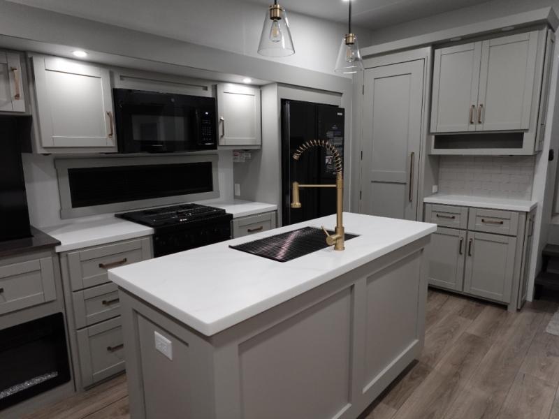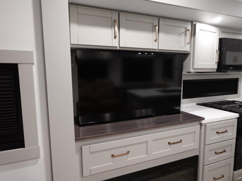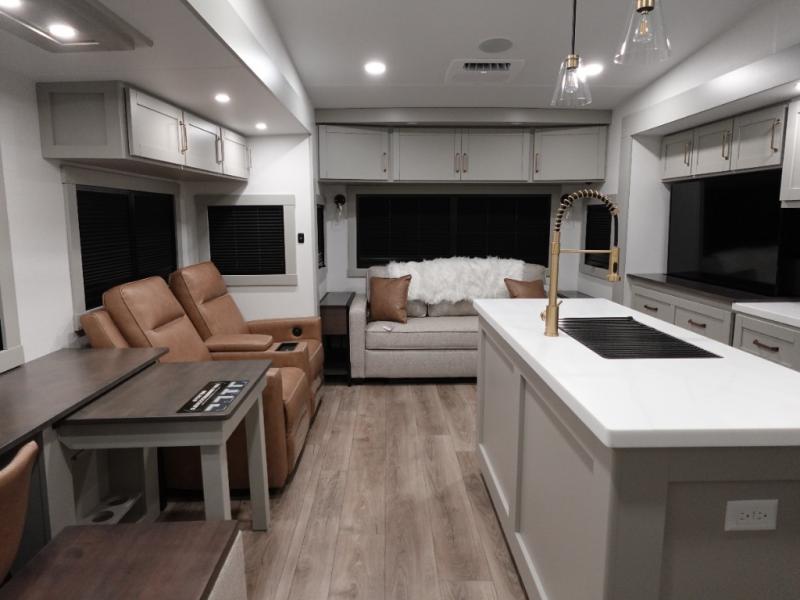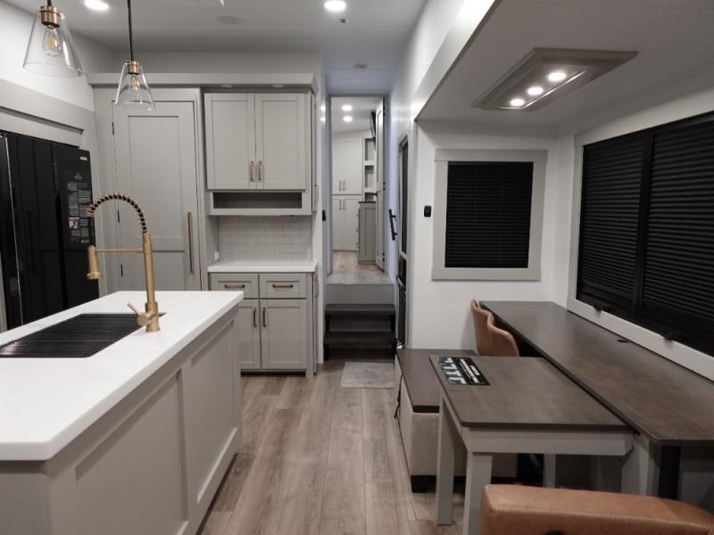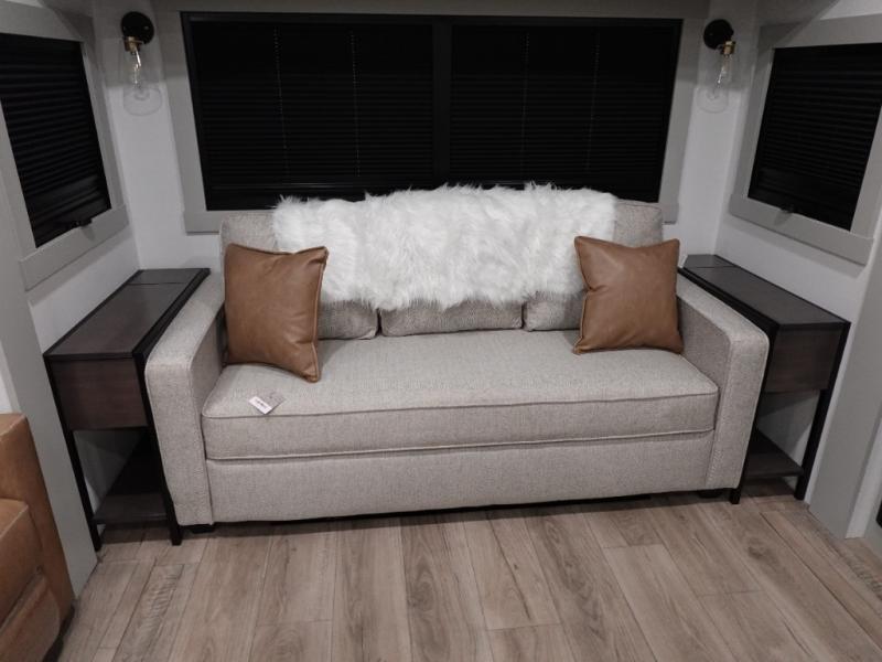 This Model Z luxury fifth wheel is bright and modern on the inside, with loads of amenities that will have you dreaming of your next trip! Enter and find a spacious combined living/kitchen space thanks to dual opposing slides. There is ample seating with a sliding desk/dining table, 62" theater seating, and a 72" tri-fold sofa along the rear wall. You can easily relax and enjoy the 50" Smart telescoping TV with a cozy fireplace below. The kitchen offers all that you need to prepare and cook meals just like home with a 16 cu. ft. refrigerator for your perishables, a 30" microwave oven, and three burner range top and oven. You will love the integrated spice rack, and the kitchen island all outfitted with dog bowls and double pull out trash bins with an integrated Stow 'N Go paper towel holder. There is also an 84" pantry with adjustable shelves for all of your canned and dry goods. Head up the steps to a private master suite with king bed slide. A sliding dresser top features hidden storage which is perfect for jewelry and other personal belongings. The front wardrobe features mirrored doors and the corner closet. Relax and enjoy a large bath featuring a linen cabinet, a 30" x 42" shower, and vanity with sink, plus medicine cabinet.