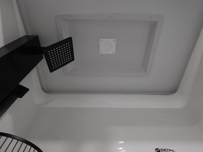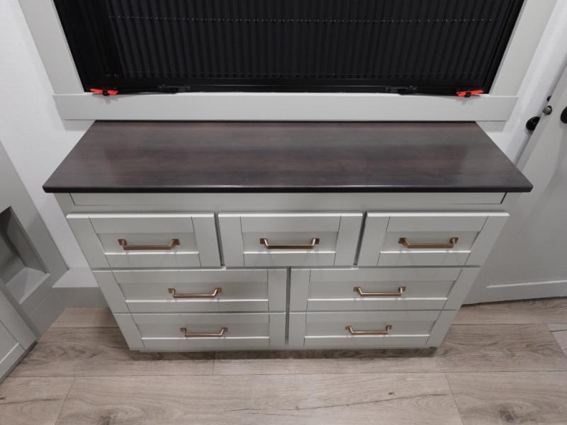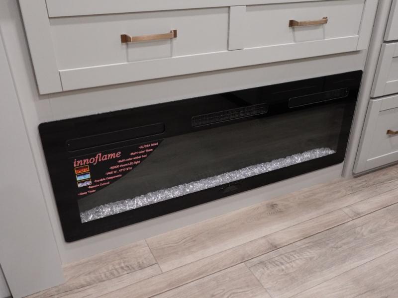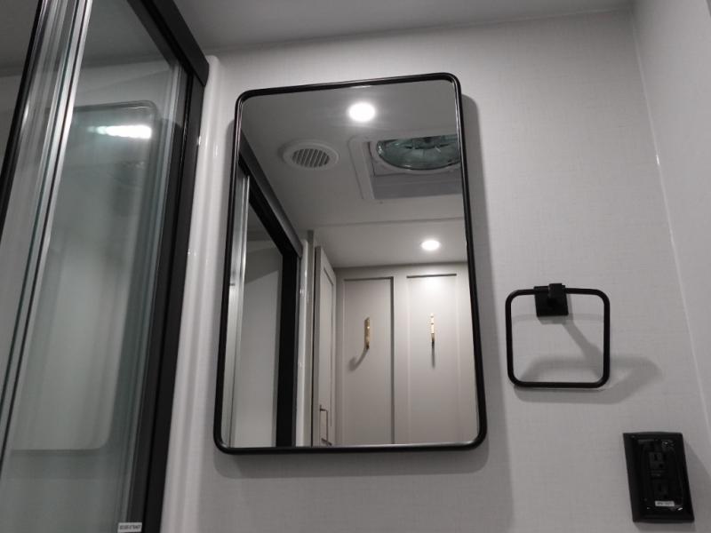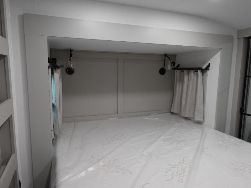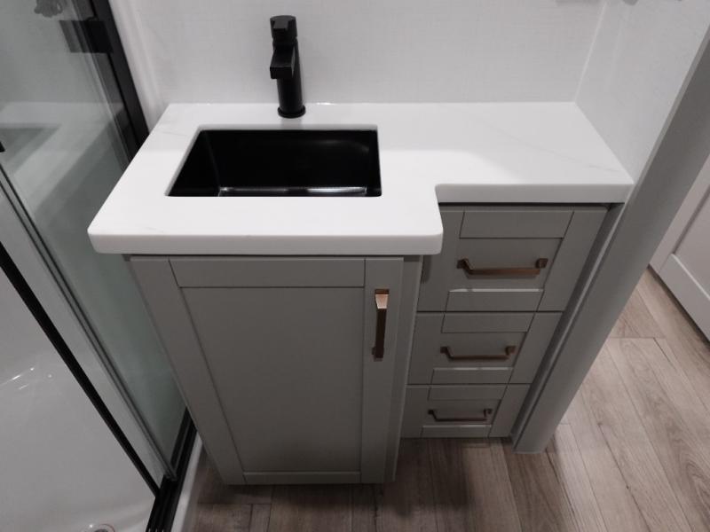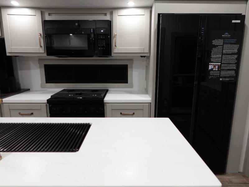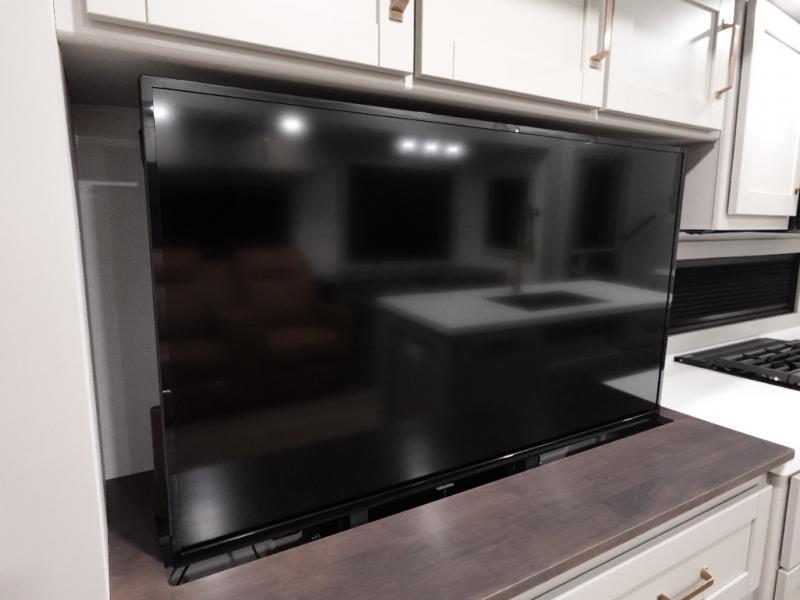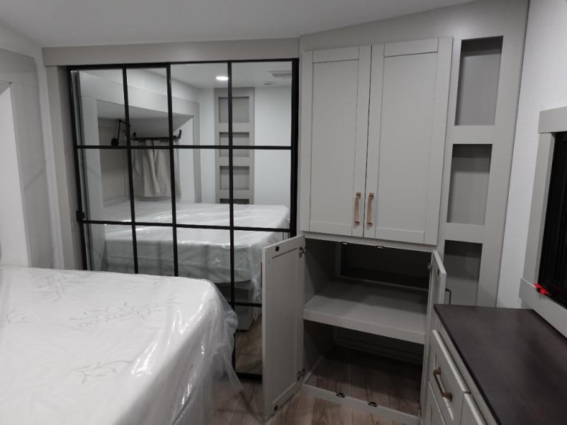 This Model Z luxury fifth wheel is bright and modern on the inside, with loads of amenities that will have you dreaming of your next trip! Enter and find a spacious combined living/kitchen space thanks to dual opposing slides. There is ample seating with a sliding desk/dining table, 62" theater seating, and a 72" tri-fold sofa along the rear wall. You can easily relax and enjoy the 50" Smart telescoping TV with a cozy fireplace below. The kitchen offers all that you need to prepare and cook meals just like home with a 16 cu. ft. refrigerator for your perishables, a 30" microwave oven, and three burner range top and oven. You will love the integrated spice rack, and the kitchen island all outfitted with dog bowls and double pull out trash bins with an integrated Stow 'N Go paper towel holder. There is also an 84" pantry with adjustable shelves for all of your canned and dry goods. Head up the steps to a private master suite with king bed slide. A sliding dresser top features hidden storage which is perfect for jewelry and other personal belongings. The front wardrobe features mirrored doors and the corner closet. Relax and enjoy a large bath featuring a linen cabinet, a 30" x 42" shower, and vanity with sink, plus medicine cabinet.