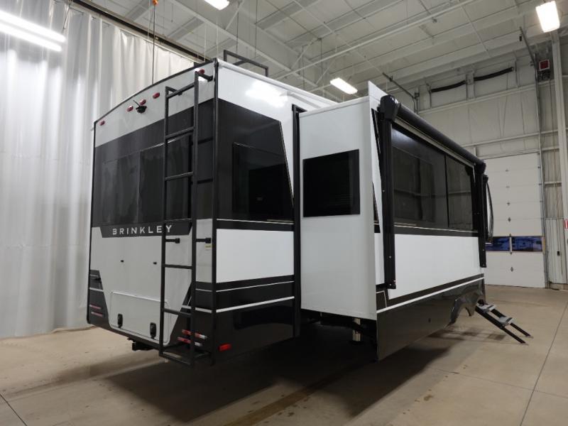 The Brinkley mid-profile Model Z fifth wheels bring you clean lines and an upscale look with plenty of style and exciting new features like the industry first brass plumbing connections. These units also feature an automotive grade front cap, plenty of exterior storage, dual exterior hot and cold showers, and wide stance leveling jacks for easy set up. Residential frameless windows provide a clean look and beautiful views, and ample electrical outlets and 6 USB/USB-C outlets allow all of your electronics and appliances to easily be used and charged.