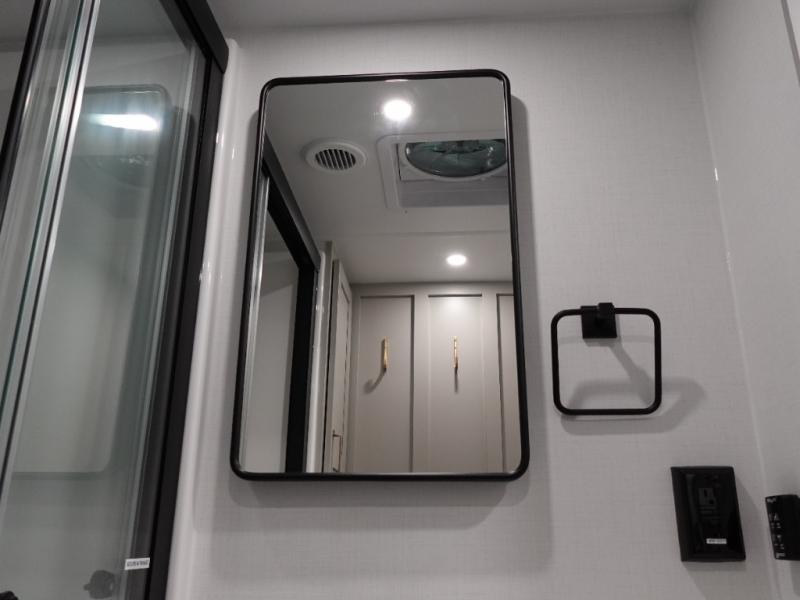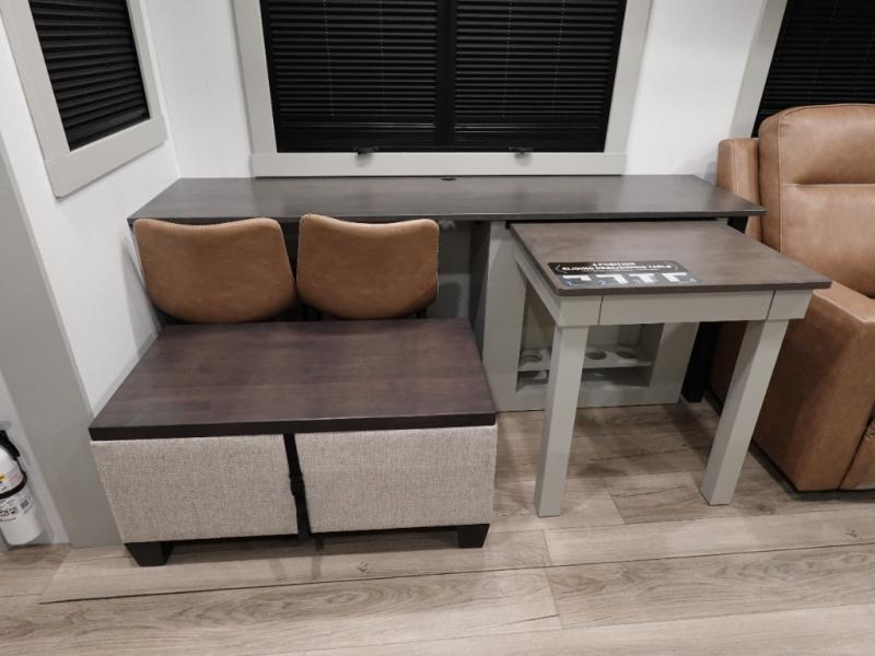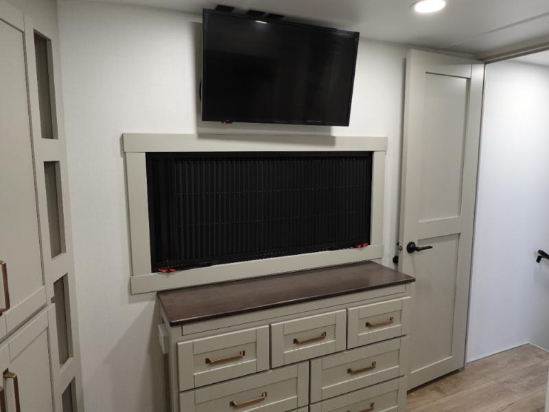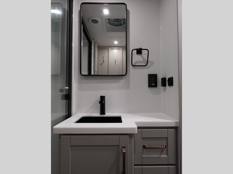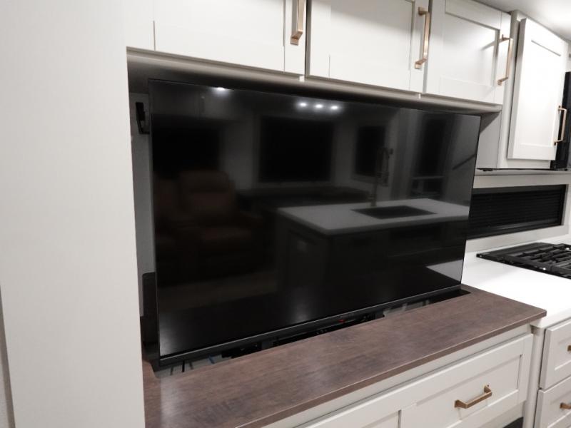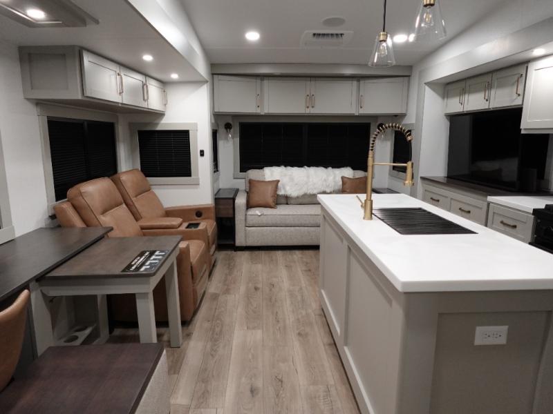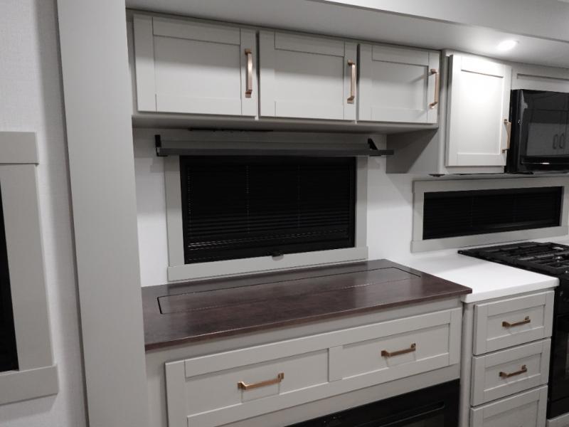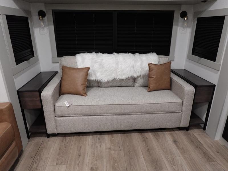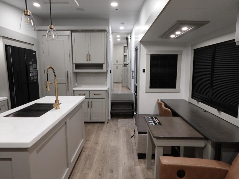 This Model Z luxury fifth wheel is bright and modern on the inside, with loads of amenities that will have you dreaming of your next trip! Enter and find a spacious combined living/kitchen space thanks to dual opposing slides. There is ample seating with a sliding desk/dining table, 62" theater seating, and a 72" tri-fold sofa along the rear wall. You can easily relax and enjoy the 50" Smart telescoping TV with a cozy fireplace below. The kitchen offers all that you need to prepare and cook meals just like home with a 16 cu. ft. refrigerator for your perishables, a 30" microwave oven, and three burner range top and oven. You will love the integrated spice rack, and the kitchen island all outfitted with dog bowls and double pull out trash bins with an integrated Stow 'N Go paper towel holder. There is also an 84" pantry with adjustable shelves for all of your canned and dry goods. Head up the steps to a private master suite with king bed slide. A sliding dresser top features hidden storage which is perfect for jewelry and other personal belongings. The front wardrobe features mirrored doors and the corner closet has been prepped for a stackable washer and dryer if you choose to add that option. Relax and enjoy a large bath featuring a linen cabinet, a 30" x 42" shower, and vanity with sink, plus medicine cabinet.
