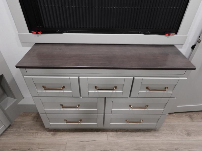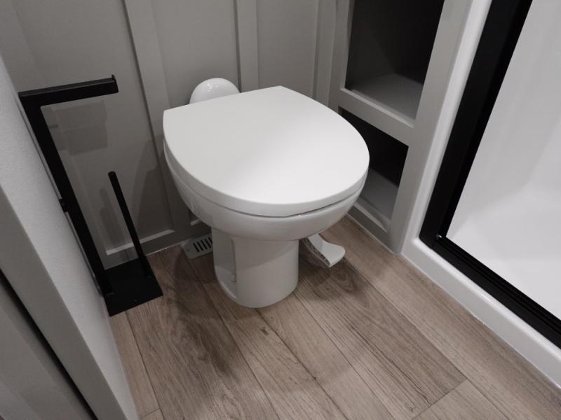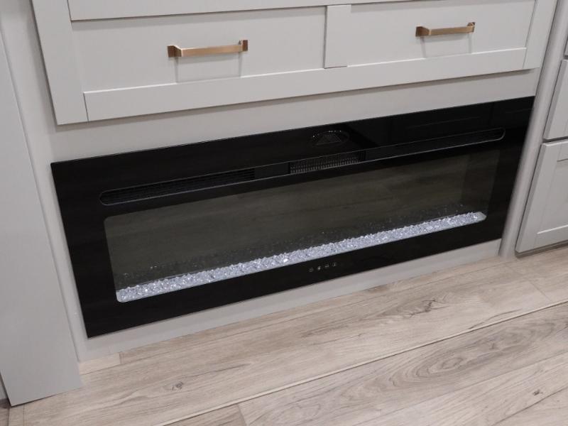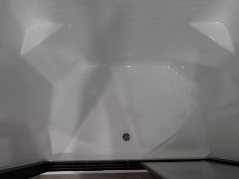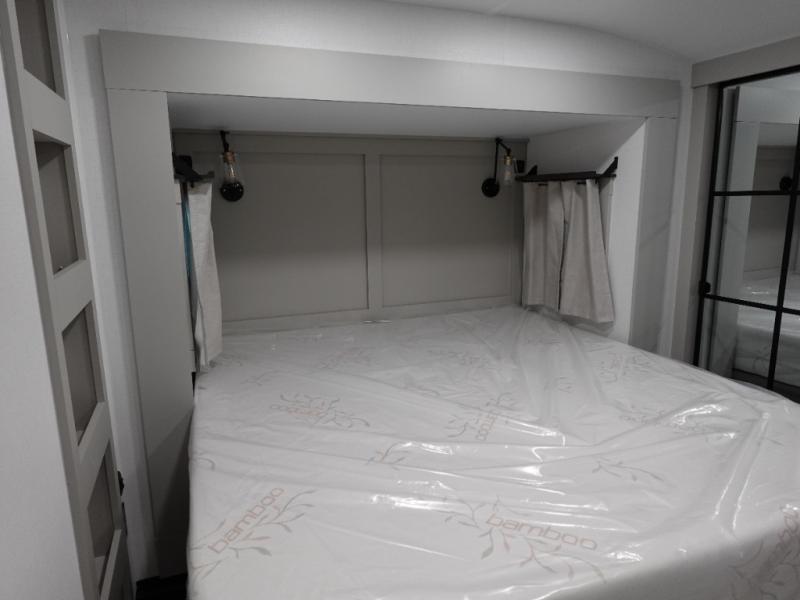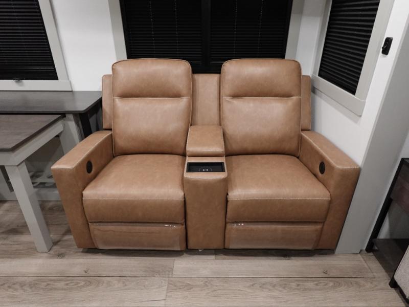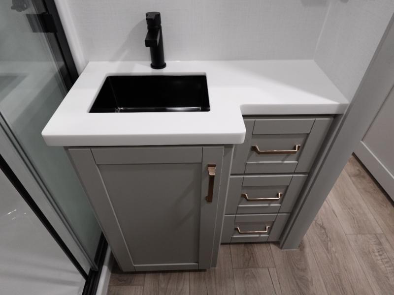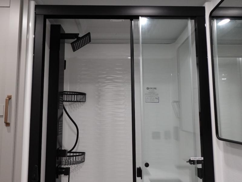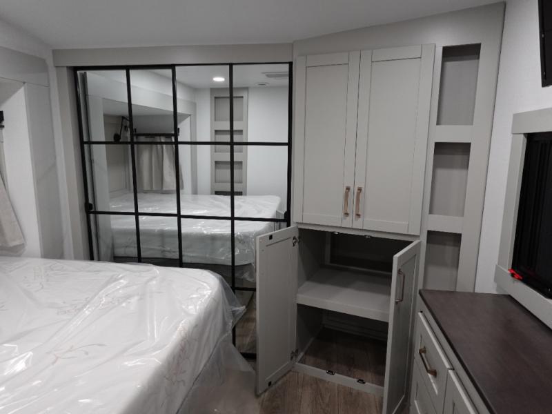 This Model Z luxury fifth wheel is bright and modern on the inside, with loads of amenities that will have you dreaming of your next trip! Enter and find a spacious combined living/kitchen space thanks to dual opposing slides. There is ample seating with a sliding desk/dining table, 62" theater seating, and a 72" tri-fold sofa along the rear wall. You can easily relax and enjoy the 50" Smart telescoping TV with a cozy fireplace below. The kitchen offers all that you need to prepare and cook meals just like home with a 16 cu. ft. refrigerator for your perishables, a 30" microwave oven, and three burner range top and oven. You will love the integrated spice rack, and the kitchen island all outfitted with dog bowls and double pull out trash bins with an integrated Stow 'N Go paper towel holder. There is also an 84" pantry with adjustable shelves for all of your canned and dry goods. Head up the steps to a private master suite with king bed slide. A sliding dresser top features hidden storage which is perfect for jewelry and other personal belongings. The front wardrobe features mirrored doors and the corner closet has been prepped for a stackable washer and dryer if you choose to add that option. Relax and enjoy a large bath featuring a linen cabinet, a 30" x 42" shower, and vanity with sink, plus medicine cabinet.