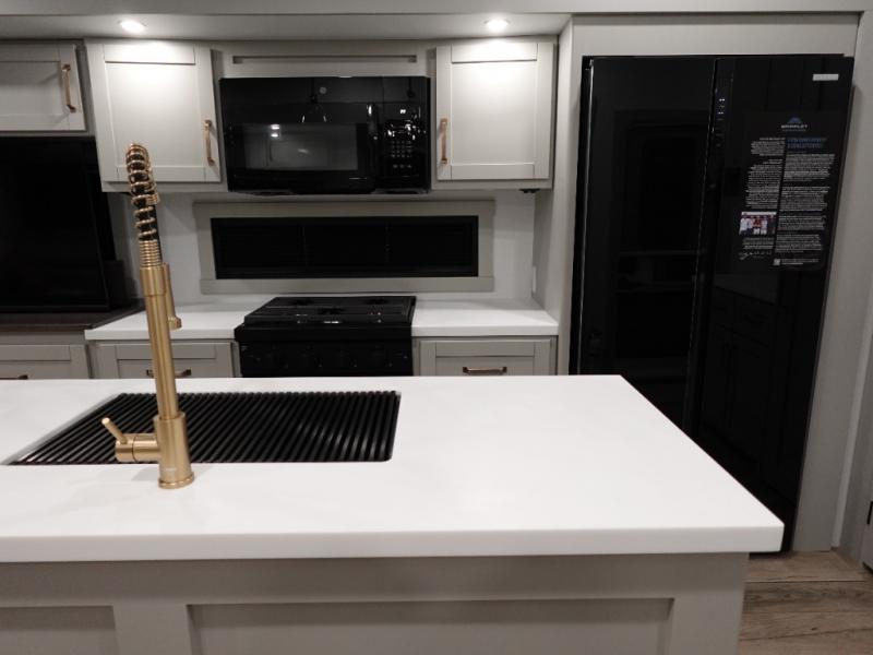 The Brinkley mid-profile Model Z fifth wheels bring you clean lines and an upscale look with plenty of style and exciting new features like the industry first brass plumbing connections. These units also feature an automotive grade front cap, plenty of exterior storage, dual exterior hot and cold showers, and wide stance leveling jacks for easy set up. Residential frameless windows provide a clean look and beautiful views, and ample electrical outlets and 6 USB/USB-C outlets allow all of your electronics and appliances to easily be used and charged.