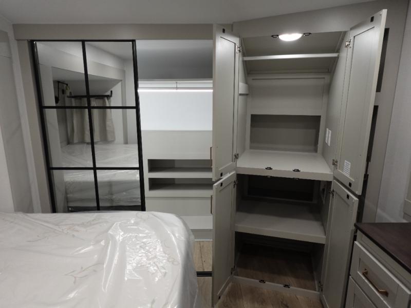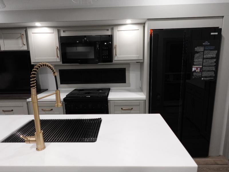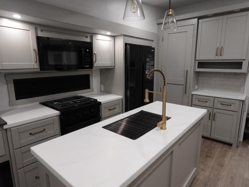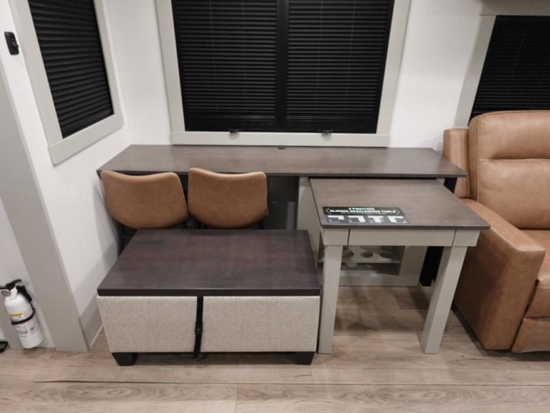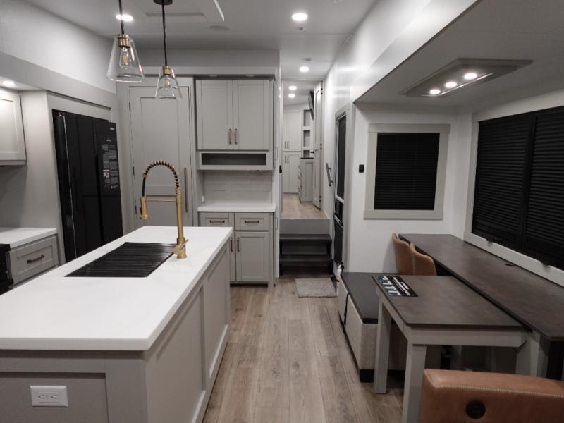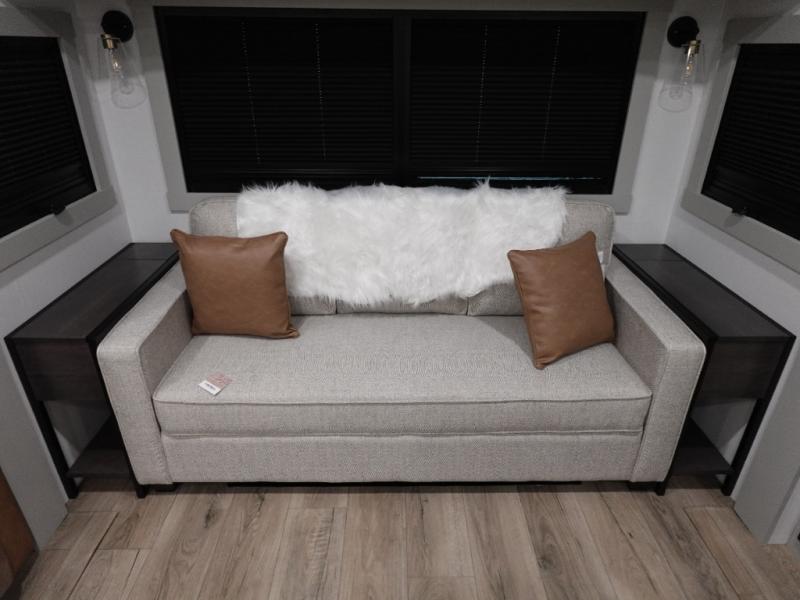 This Model Z luxury fifth wheel is bright and modern on the inside, with loads of amenities that will have you dreaming of your next trip! Enter and find a spacious combined living/kitchen space thanks to dual opposing slides. There is ample seating with a sliding desk/dining table, 62" theater seating, and a 72" tri-fold sofa along the rear wall. You can easily relax and enjoy the 50" Smart telescoping TV with a cozy fireplace below. The kitchen offers all that you need to prepare and cook meals just like home with a 16 cu. ft. refrigerator for your perishables, a 30" microwave oven, and three burner range top and oven. You will love the integrated spice rack, and the kitchen island all outfitted with dog bowls and double pull out trash bins with an integrated Stow 'N Go paper towel holder. There is also an 84" pantry with adjustable shelves for all of your canned and dry goods. Head up the steps to a private master suite with king bed slide. A sliding dresser top features hidden storage which is perfect for jewelry and other personal belongings.
