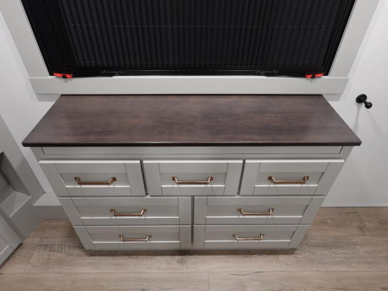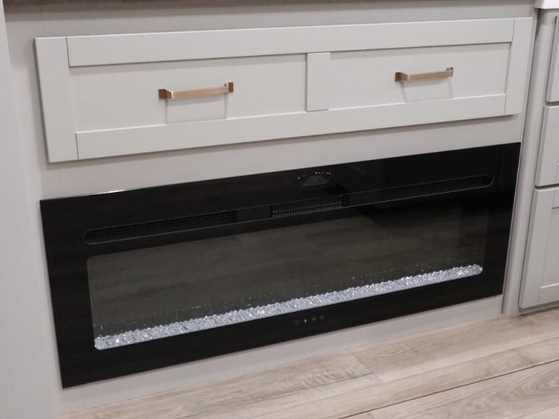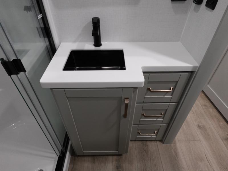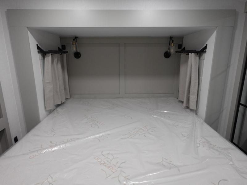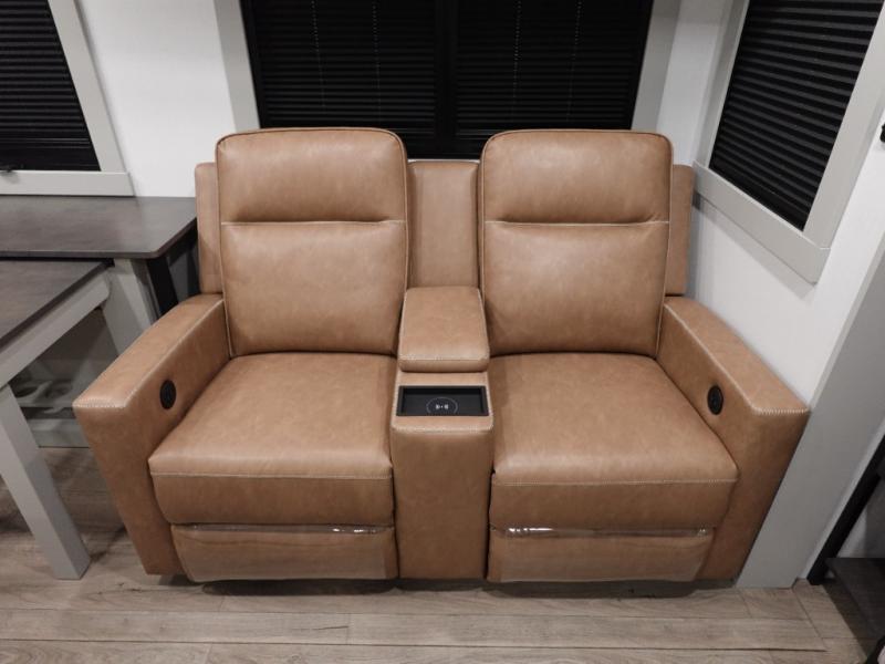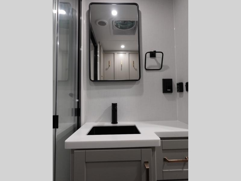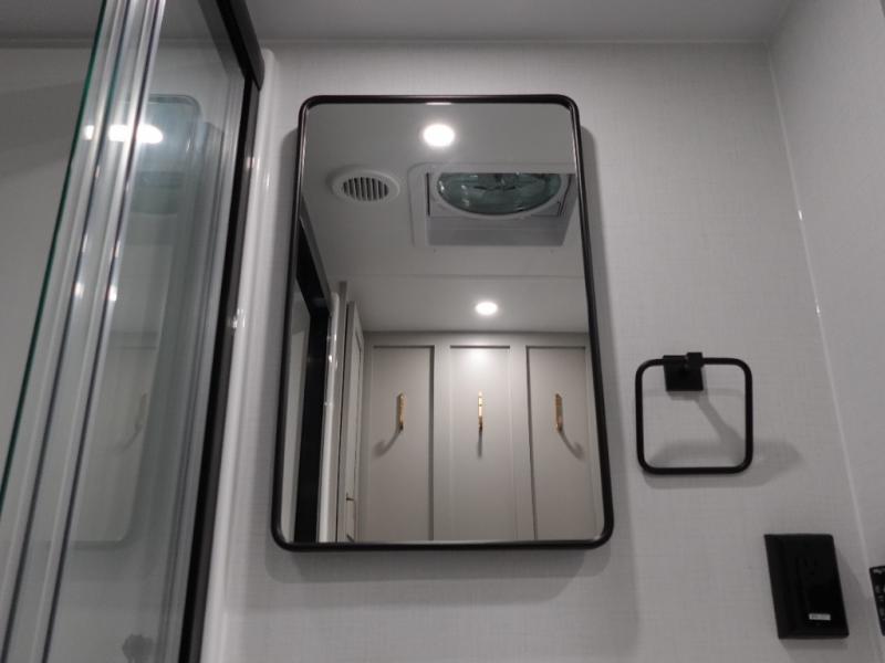 This Model Z luxury fifth wheel is bright and modern on the inside, with loads of amenities that will have you dreaming of your next trip! Enter and find a spacious combined living/kitchen space thanks to dual opposing slides. There is ample seating with a sliding desk/dining table, 62" theater seating, and a 72" tri-fold sofa along the rear wall. You can easily relax and enjoy the 50" Smart telescoping TV with a cozy fireplace below. The kitchen offers all that you need to prepare and cook meals just like home with a 16 cu. ft. refrigerator for your perishables, a 30" microwave oven, and three burner range top and oven. You will love the integrated spice rack, and the kitchen island all outfitted with dog bowls and double pull out trash bins with an integrated Stow 'N Go paper towel holder. There is also an 84" pantry with adjustable shelves for all of your canned and dry goods. Head up the steps to a private master suite with king bed slide. A sliding dresser top features hidden storage which is perfect for jewelry and other personal belongings.