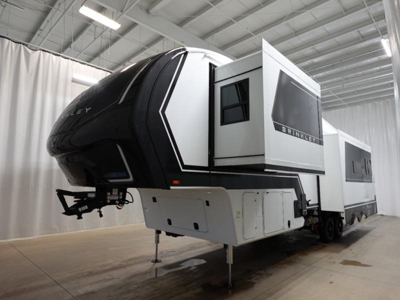 The Brinkley mid-profile Model Z fifth wheels bring you clean lines and an upscale look with plenty of style and exciting new features like the industry first brass plumbing connections. These units also feature an automotive grade front cap, plenty of exterior storage, dual exterior hot and cold showers, and wide stance leveling jacks for easy set up. Residential frameless windows provide a clean look and beautiful views, and ample electrical outlets and 6 USB/USB-C outlets allow all of your electronics and appliances to easily be used and charged.