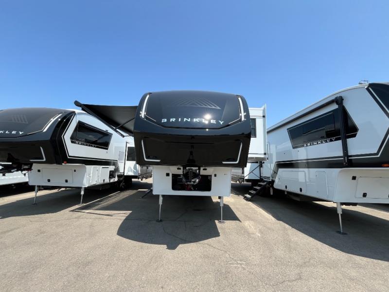 The Brinkley mid-profile Model Z fifth wheels bring you clean lines and an upscale look with plenty of style and exciting new features like the industry first brass plumbing connections. These units also feature an automotive grade front cap, plenty of exterior storage, dual exterior hot and cold showers, and wide stance leveling jacks for easy set up. Residential frameless windows provide a clean look and beautiful views, and ample electrical outlets and 6 USB/USB-C outlets allow all of your electronics and appliances to easily be used and charged.