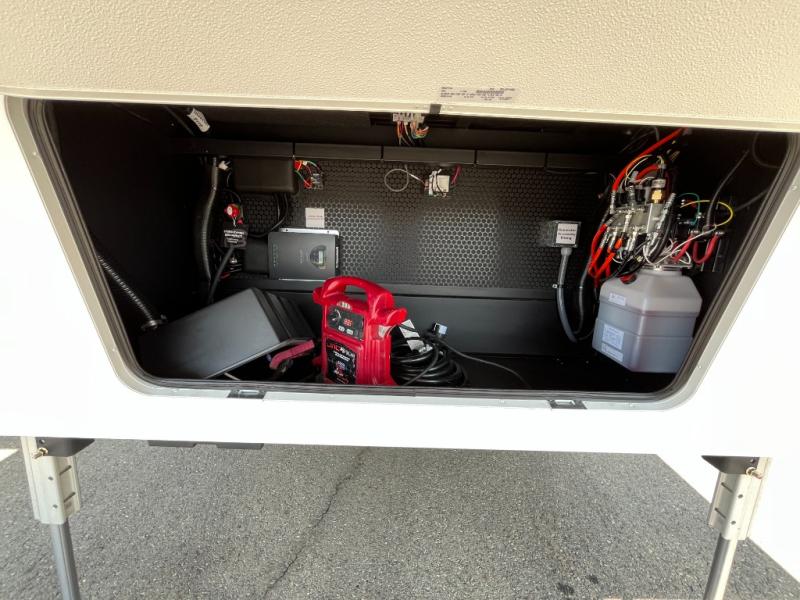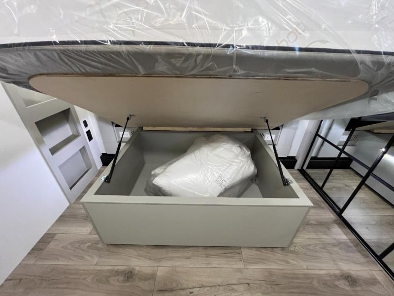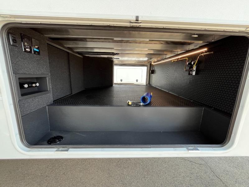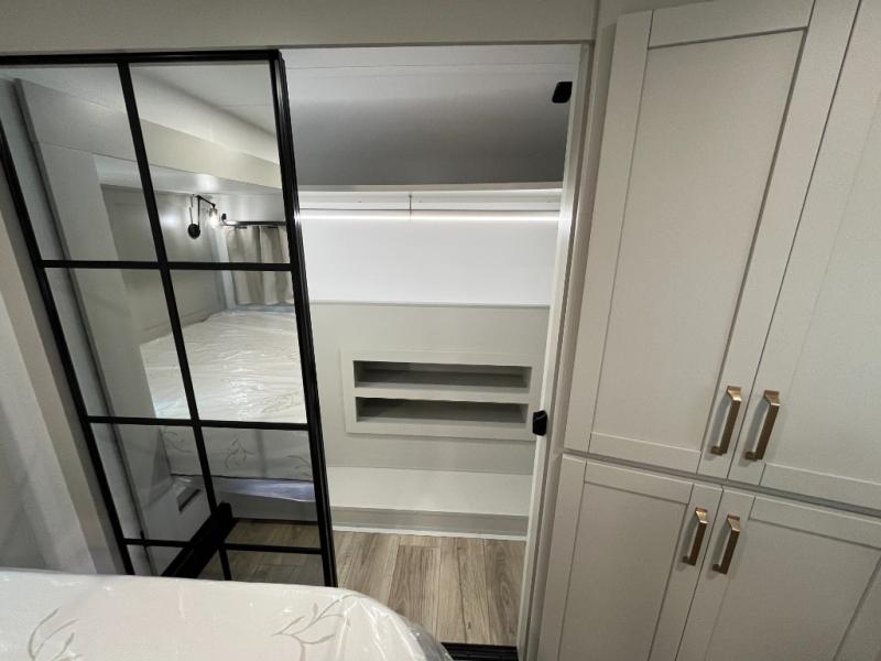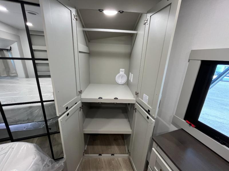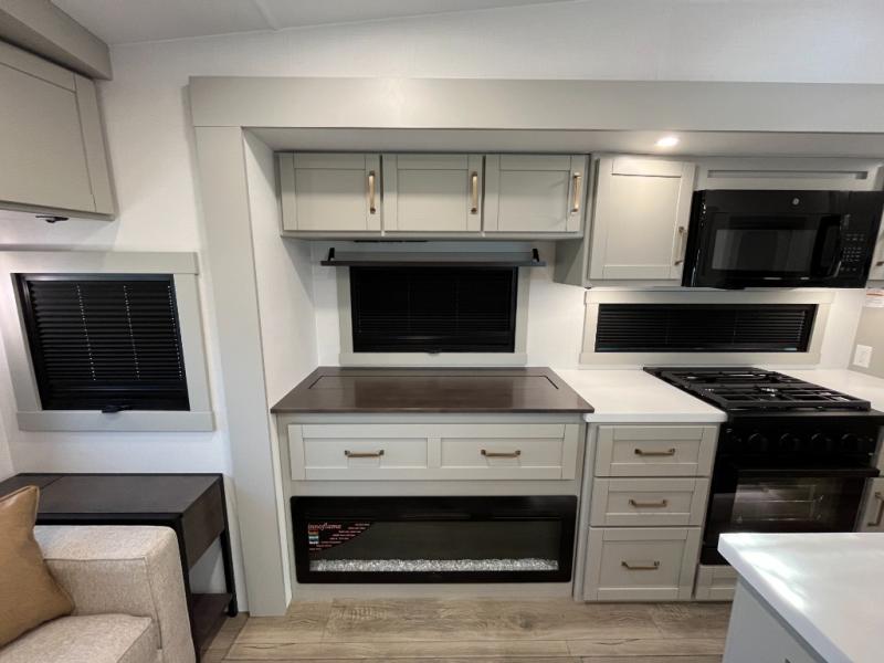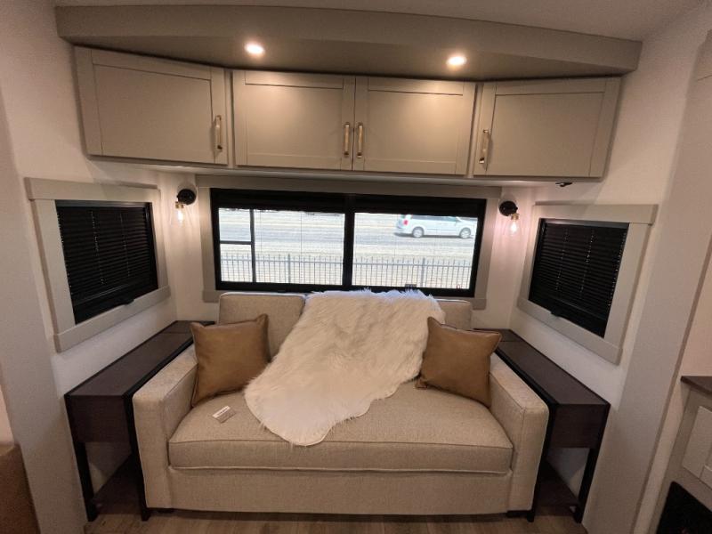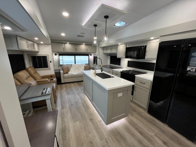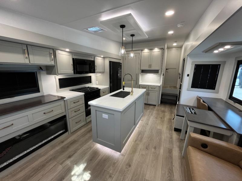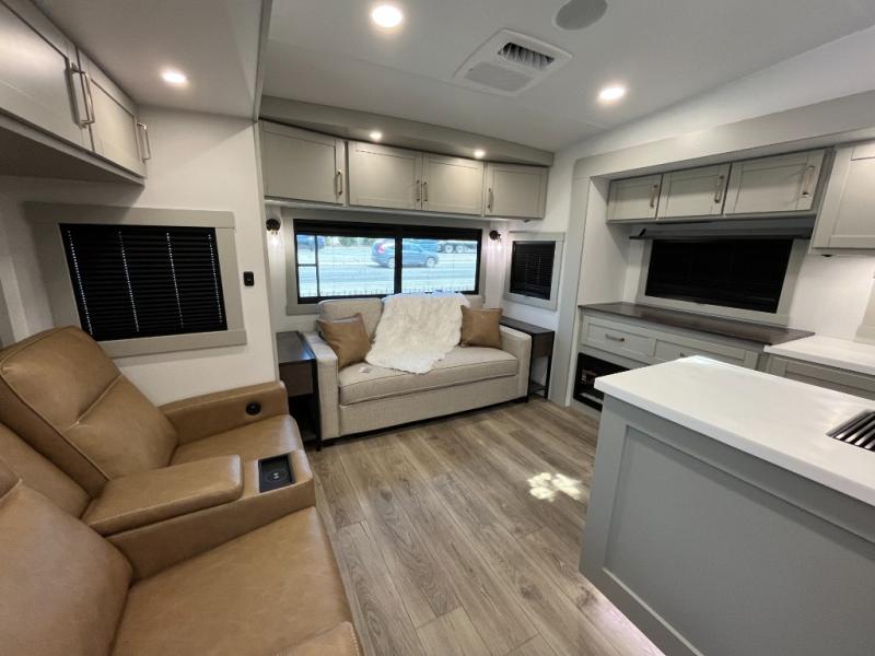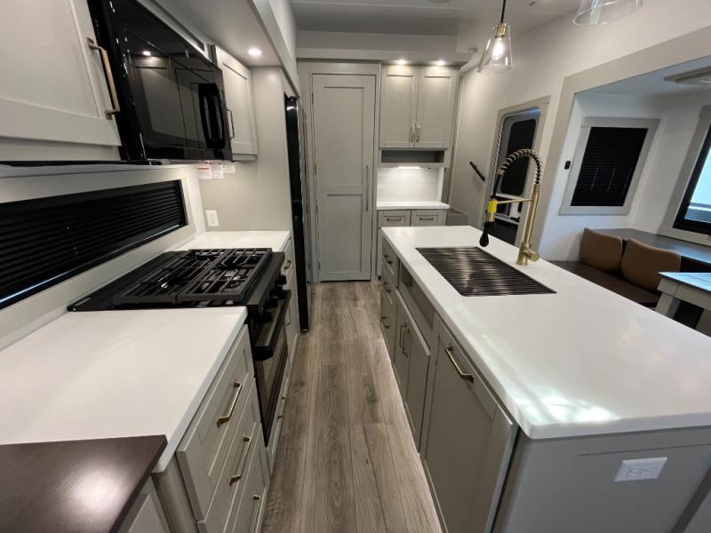 This Model Z luxury fifth wheel is bright and modern on the inside, with loads of amenities that will have you dreaming of your next trip! Enter and find a spacious combined living/kitchen space thanks to dual opposing slides. There is ample seating with a sliding desk/dining table, 62" theater seating, and a 72" tri-fold sofa along the rear wall. You can easily relax and enjoy the 50" Smart telescoping TV with a cozy fireplace below. The kitchen offers all that you need to prepare and cook meals just like home with a 16 cu. ft. refrigerator for your perishables, a 30" microwave oven, and three burner range top and oven. You will love the integrated spice rack, and the kitchen island all outfitted with dog bowls and double pull out trash bins with an integrated Stow 'N Go paper towel holder. There is also an 84" pantry with adjustable shelves for all of your canned and dry goods. Head up the steps to a private master suite with king bed slide. You can opt for the queen bed if you like. A sliding dresser top features hidden storage which is perfect for jewelry and other personal belongings. The front wardrobe features mirrored doors and the corner closet has been prepped for a stackable washer and dryer if you choose to add that option. Relax and enjoy a large bath featuring a linen cabinet, a 30" x 42" shower, and vanity with sink, plus medicine cabinet.