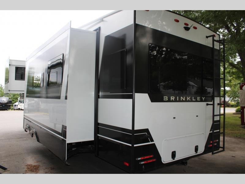 The Brinkley mid-profile Model Z fifth wheels bring you clean lines and an upscale look with plenty of style and exciting new features like the industry first brass plumbing connections. These units also feature an automotive grade front cap, plenty of exterior storage, dual exterior hot and cold showers, and wide stance leveling jacks for easy set up. Residential frameless windows provide a clean look and beautiful views, and ample electrical outlets and 6 USB/USB-C outlets allow all of your electronics and appliances to easily be used and charged.