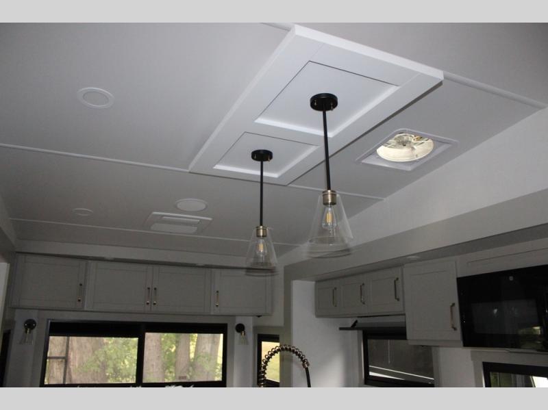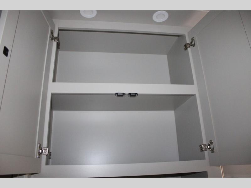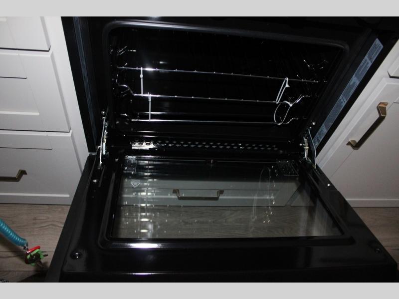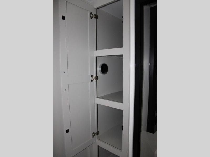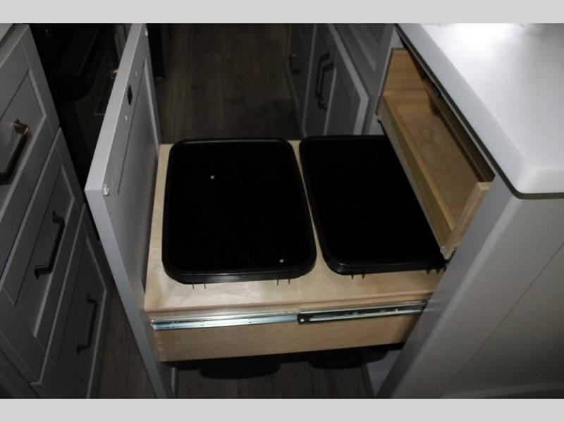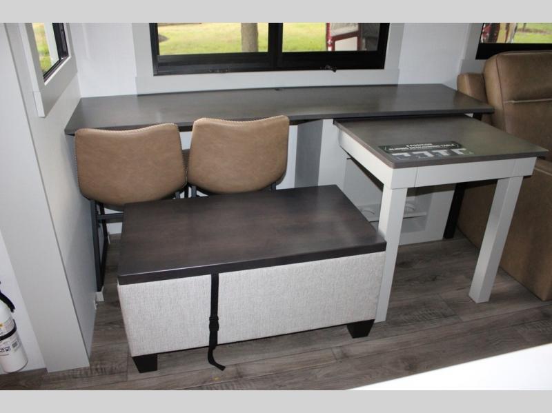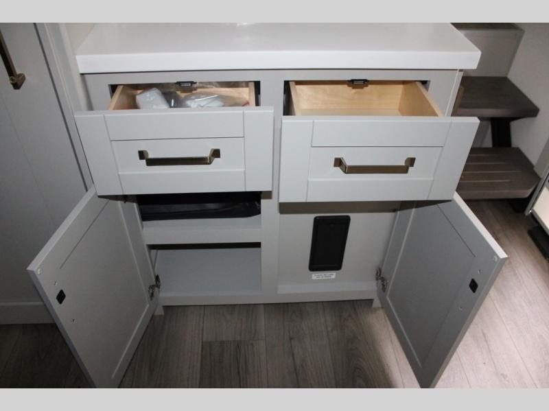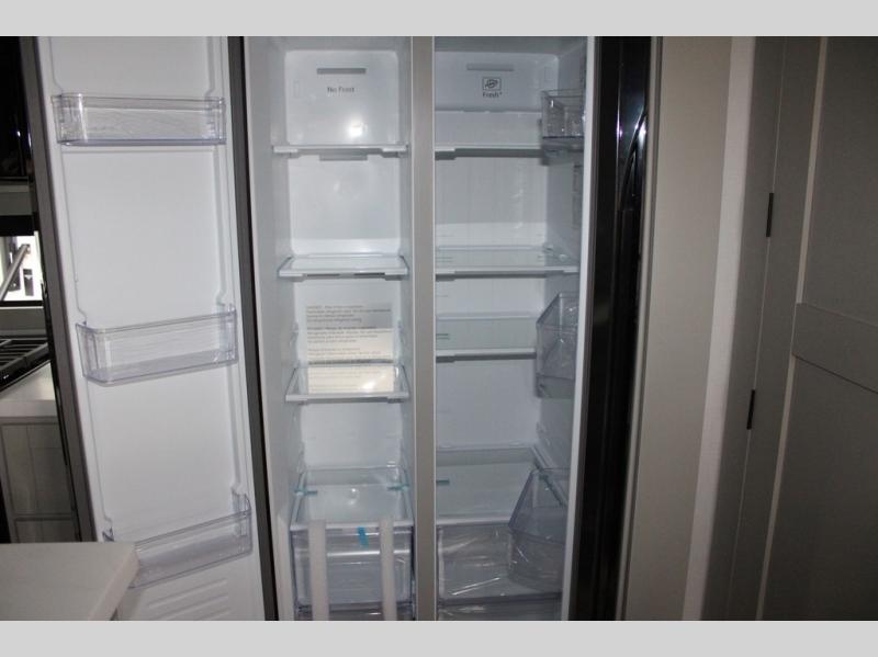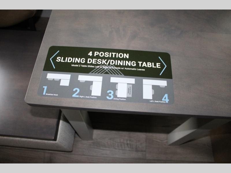 This Model Z luxury fifth wheel is bright and modern on the inside, with loads of amenities that will have you dreaming of your next trip! Enter and find a spacious combined living/kitchen space thanks to dual opposing slides. There is ample seating with a sliding desk/dining table, 62" theater seating, and a 72" tri-fold sofa along the rear wall. You can easily relax and enjoy the 50" Smart telescoping TV with a cozy fireplace below. The kitchen offers all that you need to prepare and cook meals just like home with a 16 cu. ft. refrigerator for your perishables, a 30" microwave oven, and three burner range top and oven. You will love the integrated spice rack, and the kitchen island all outfitted with dog bowls and double pull out trash bins with an integrated Stow 'N Go paper towel holder. There is also an 84" pantry with adjustable shelves for all of your canned and dry goods. Head up the steps to a private master suite with king bed slide. You can opt for the queen bed if you like. A sliding dresser top features hidden storage which is perfect for jewelry and other personal belongings. The front wardrobe features mirrored doors and the corner closet has been prepped for a stackable washer and dryer if you choose to add that option. Relax and enjoy a large bath featuring a linen cabinet, a 30" x 42" shower, and vanity with sink, plus medicine cabinet.