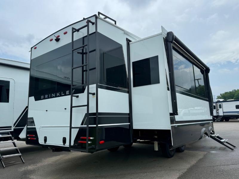 The Brinkley mid-profile Model Z fifth wheels bring you clean lines and an upscale look with plenty of style and exciting new features like the industry first brass plumbing connections. These units also feature an automotive grade front cap, plenty of exterior storage, dual exterior hot and cold showers, and wide stance leveling jacks for easy set up. Residential frameless windows provide a clean look and beautiful views, and ample electrical outlets and 6 USB/USB-C outlets allow all of your electronics and appliances to easily be used and charged.