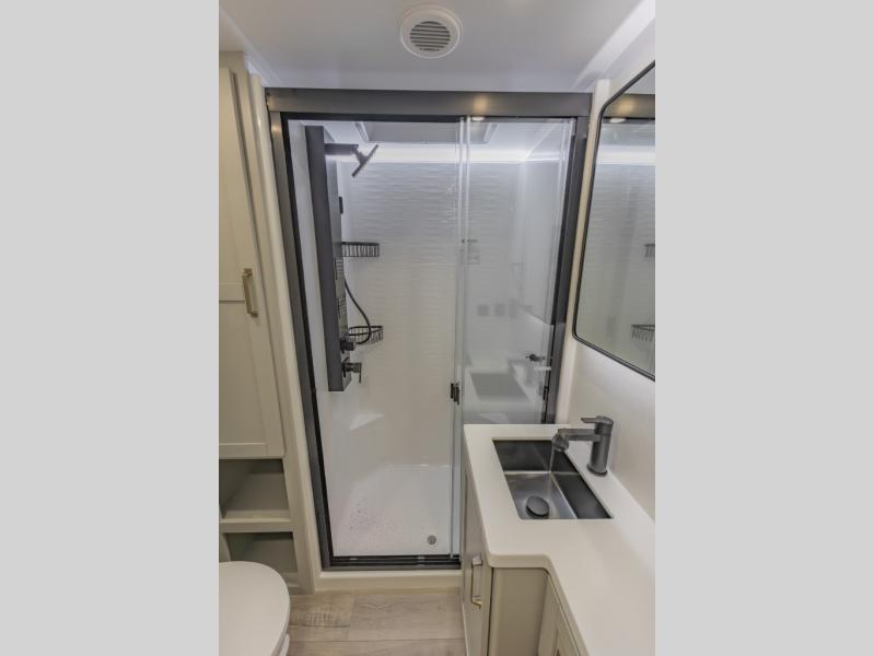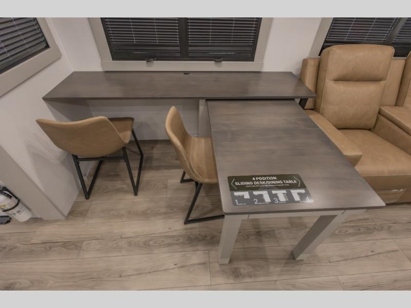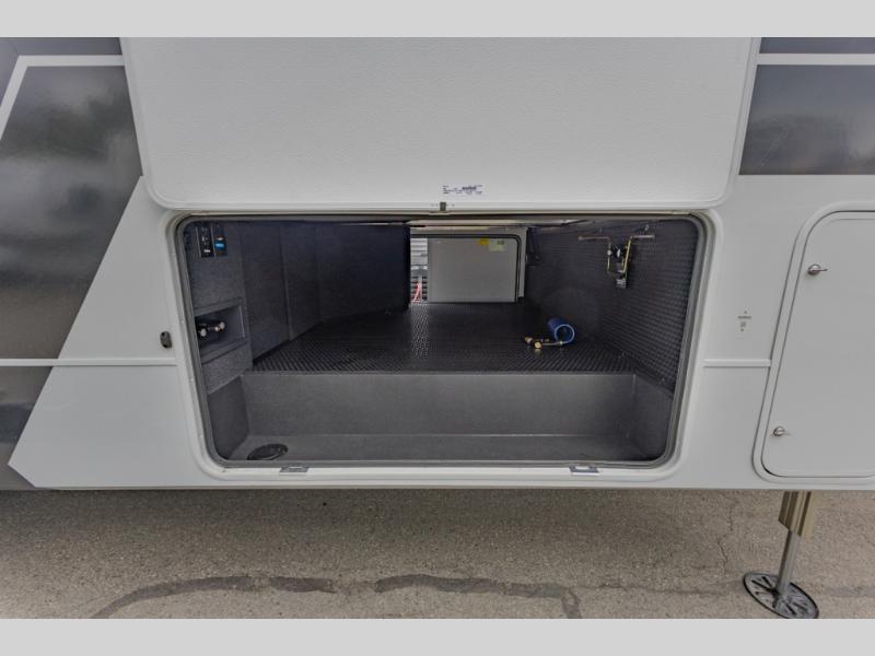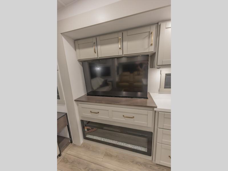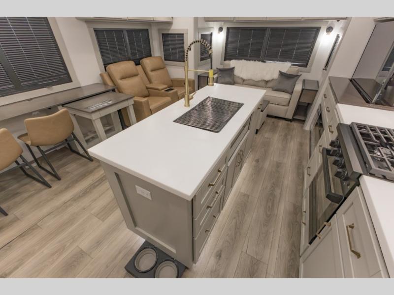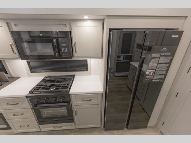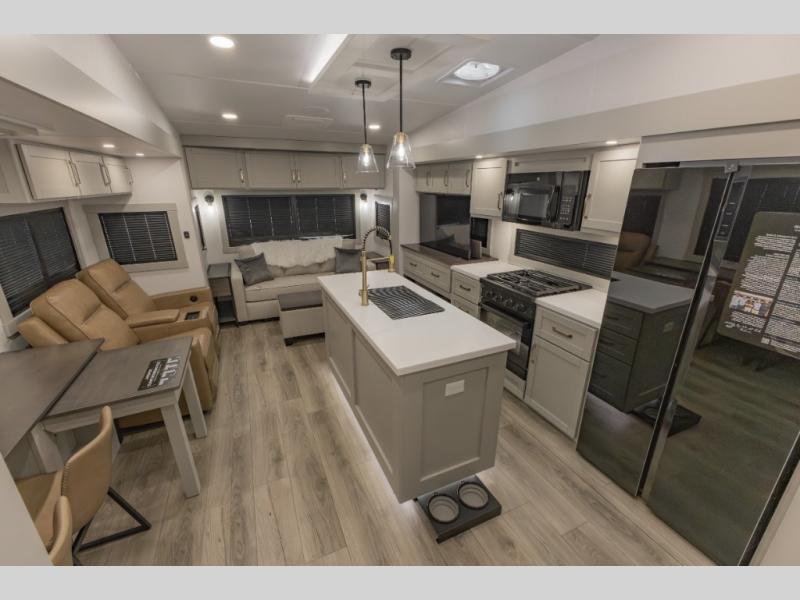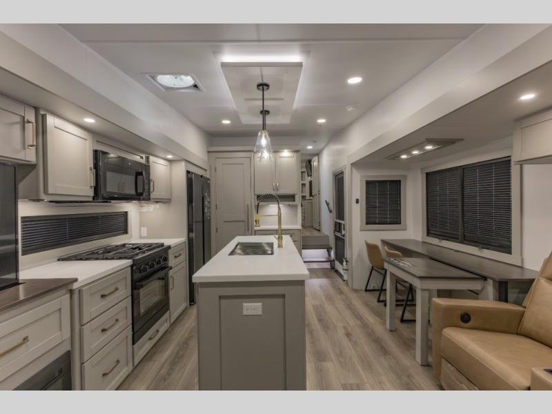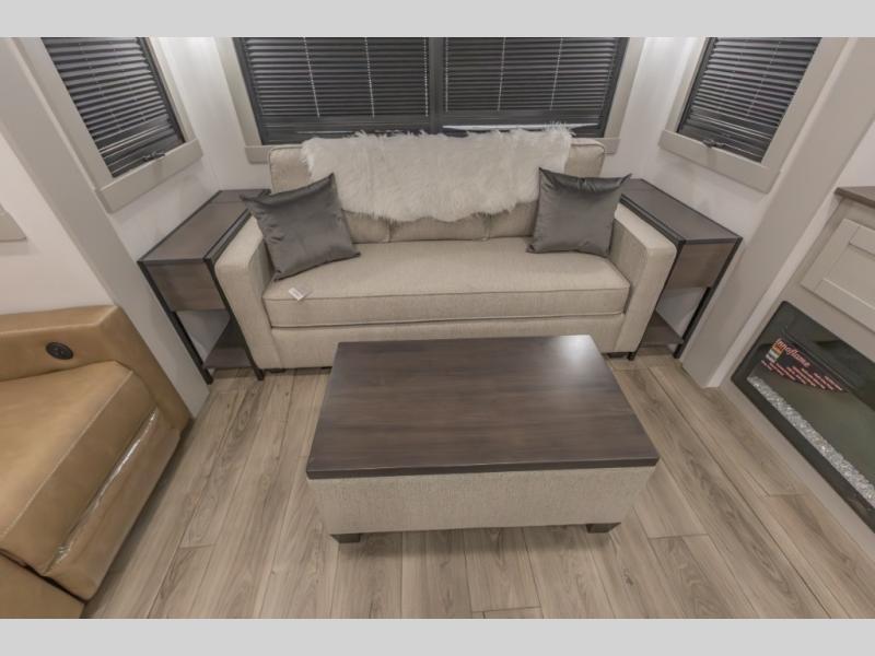 This Model Z luxury fifth wheel is bright and modern on the inside, with loads of amenities that will have you dreaming of your next trip! Enter and find a spacious combined living/kitchen space thanks to dual opposing slides. There is ample seating with a sliding desk/dining table, 62" theater seating, and a 72" tri-fold sofa along the rear wall. You can easily relax and enjoy the 50" Smart telescoping TV with a cozy fireplace below. The kitchen offers all that you need to prepare and cook meals just like home with a 16 cu. ft. refrigerator for your perishables, a 30" microwave oven, and three burner range top and oven. You will love the integrated spice rack, and the kitchen island all outfitted with dog bowls and double pull out trash bins with an integrated Stow 'N Go paper towel holder. There is also an 84" pantry with adjustable shelves for all of your canned and dry goods. Head up the steps to a private master suite with king bed slide. You can opt for the queen bed if you like. A sliding dresser top features hidden storage which is perfect for jewelry and other personal belongings. The front wardrobe features mirrored doors and the corner closet has been prepped for a stackable washer and dryer if you choose to add that option. Relax and enjoy a large bath featuring a linen cabinet, a 30" x 42" shower, and vanity with sink, plus medicine cabinet.