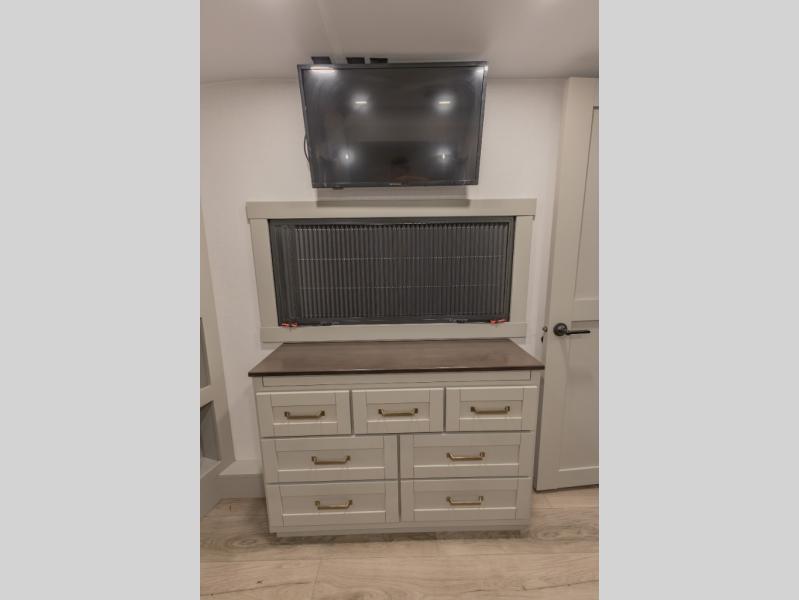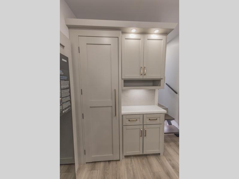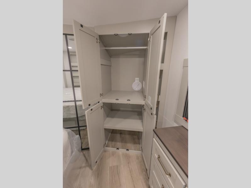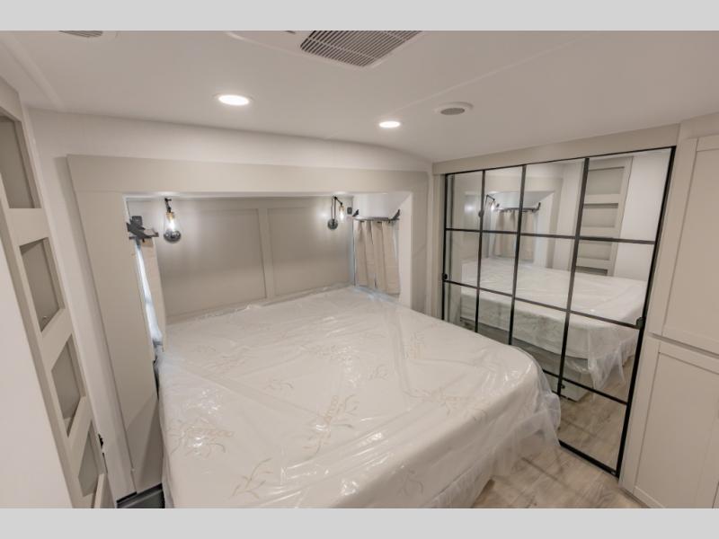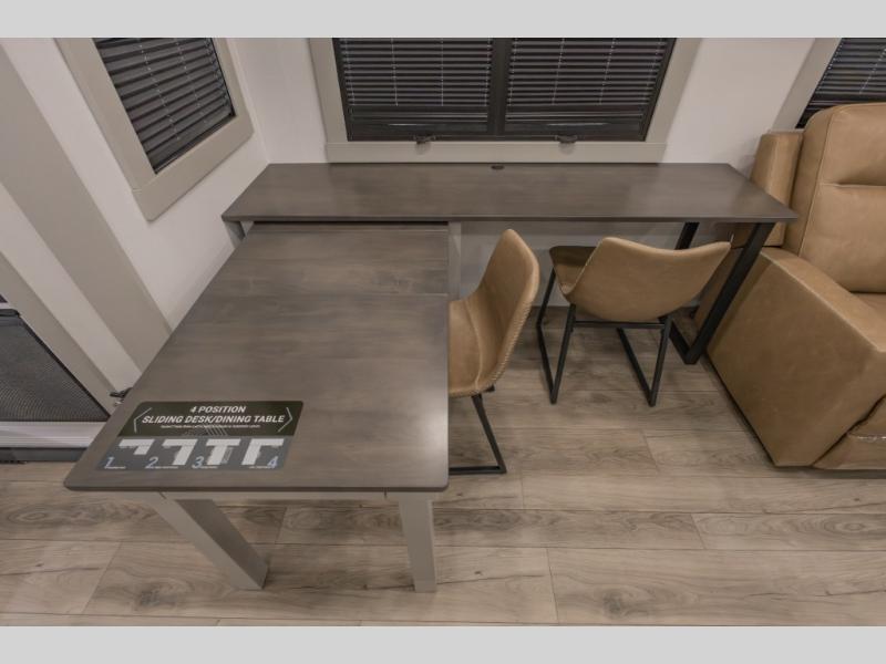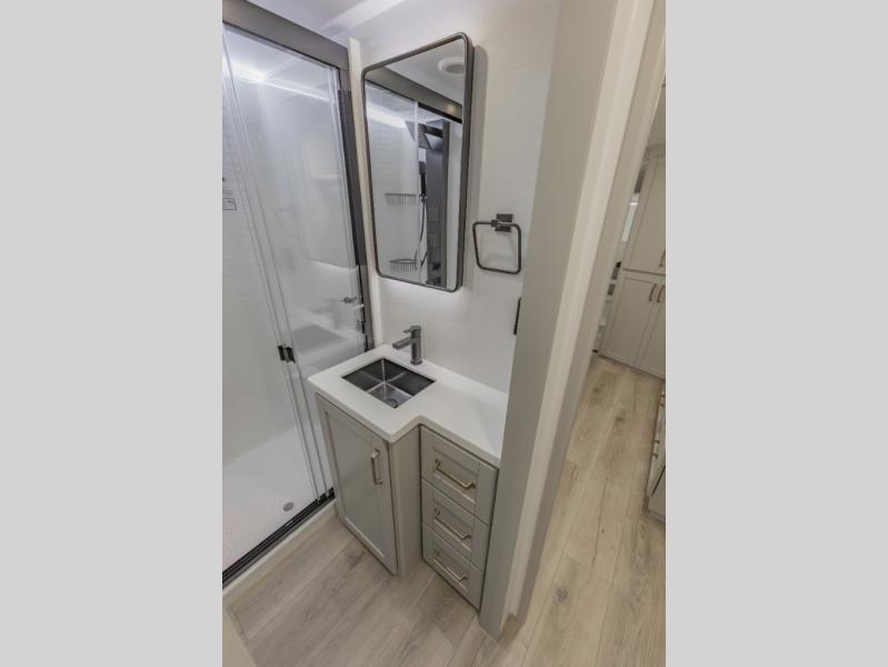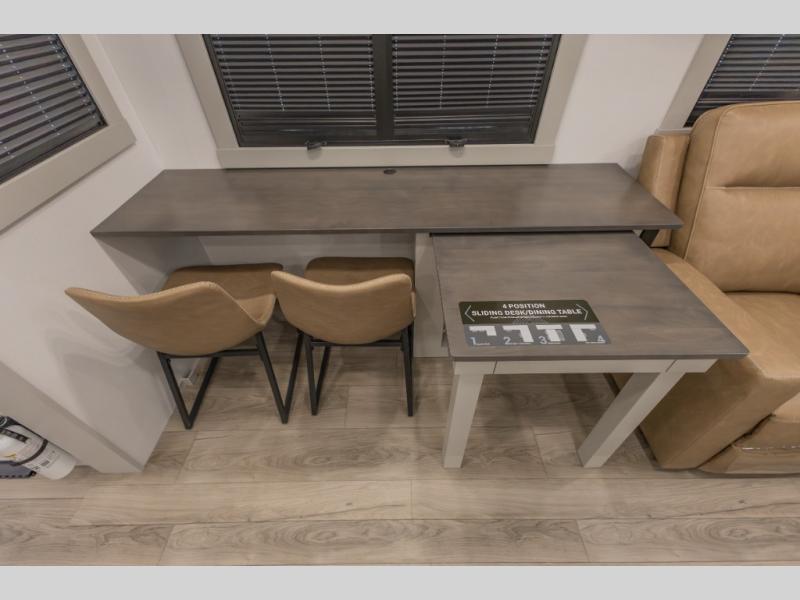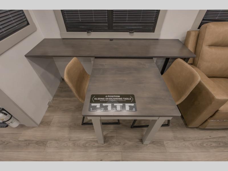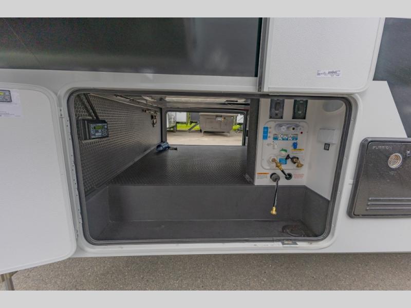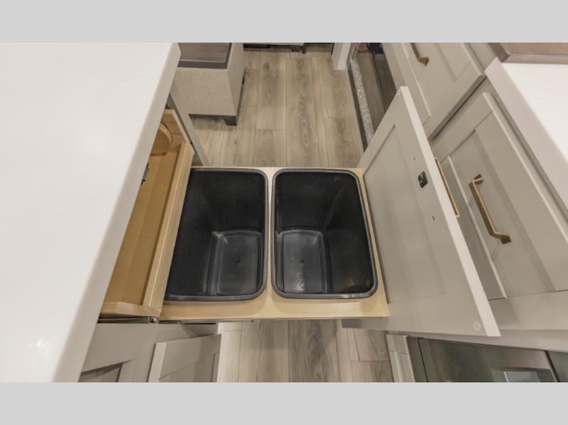 This Model Z luxury fifth wheel is bright and modern on the inside, with loads of amenities that will have you dreaming of your next trip! Enter and find a spacious combined living/kitchen space thanks to dual opposing slides. There is ample seating with a sliding desk/dining table, 62" theater seating, and a 72" tri-fold sofa along the rear wall. You can easily relax and enjoy the 50" Smart telescoping TV with a cozy fireplace below. The kitchen offers all that you need to prepare and cook meals just like home with a 16 cu. ft. refrigerator for your perishables, a 30" microwave oven, and three burner range top and oven. You will love the integrated spice rack, and the kitchen island all outfitted with dog bowls and double pull out trash bins with an integrated Stow 'N Go paper towel holder. There is also an 84" pantry with adjustable shelves for all of your canned and dry goods. Head up the steps to a private master suite with king bed slide. You can opt for the queen bed if you like. A sliding dresser top features hidden storage which is perfect for jewelry and other personal belongings. The front wardrobe features mirrored doors and the corner closet has been prepped for a stackable washer and dryer if you choose to add that option. Relax and enjoy a large bath featuring a linen cabinet, a 30" x 42" shower, and vanity with sink, plus medicine cabinet.