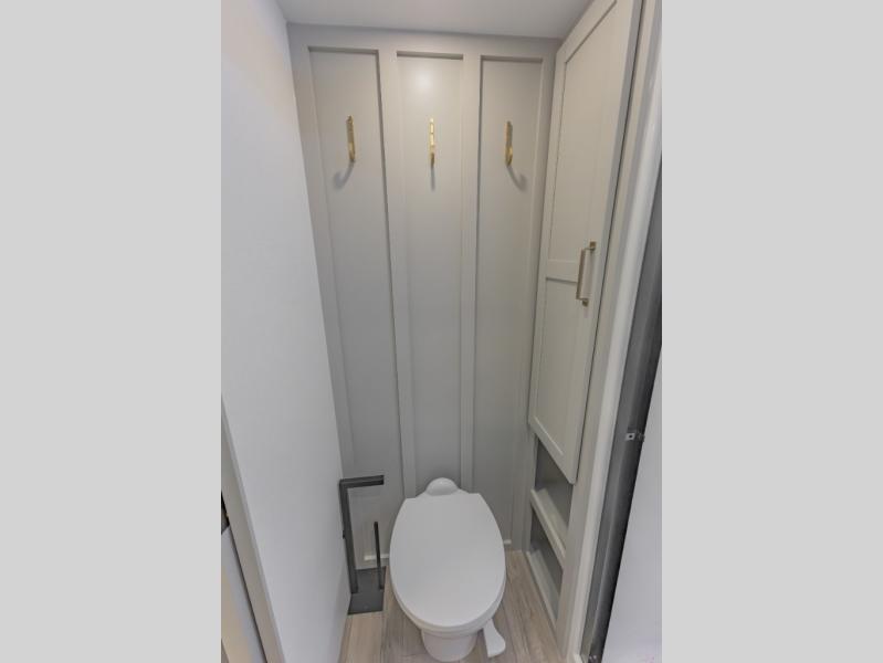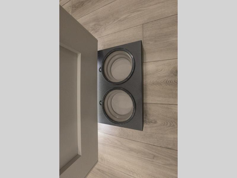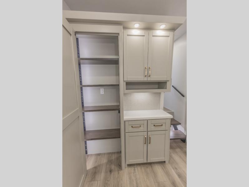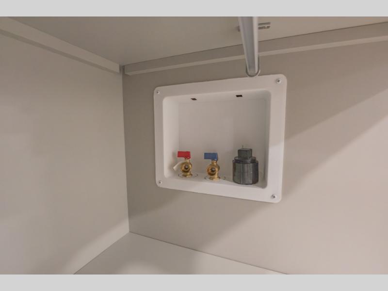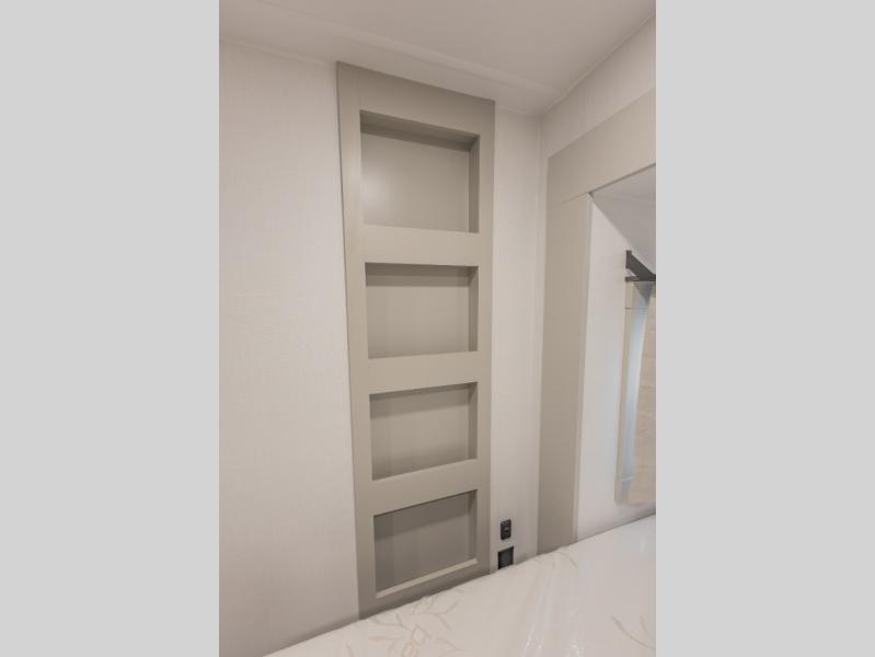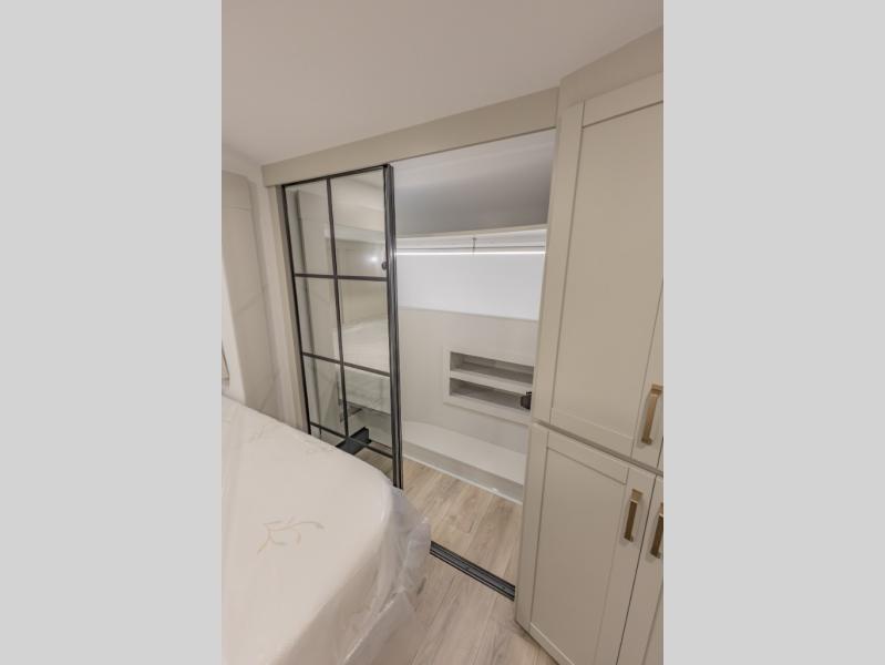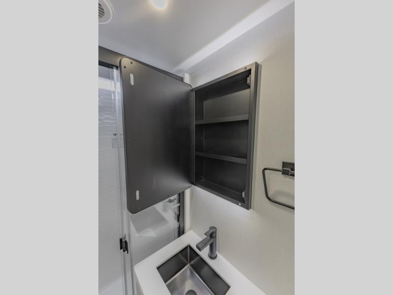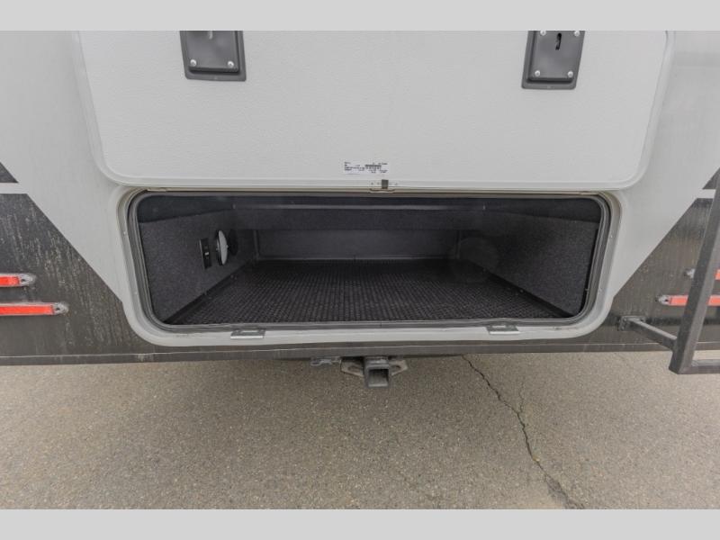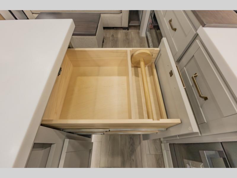 This Model Z luxury fifth wheel is bright and modern on the inside, with loads of amenities that will have you dreaming of your next trip! Enter and find a spacious combined living/kitchen space thanks to dual opposing slides. There is ample seating with a sliding desk/dining table, 62" theater seating, and a 72" tri-fold sofa along the rear wall. You can easily relax and enjoy the 50" Smart telescoping TV with a cozy fireplace below. The kitchen offers all that you need to prepare and cook meals just like home with a 16 cu. ft. refrigerator for your perishables, a 30" microwave oven, and three burner range top and oven. You will love the integrated spice rack, and the kitchen island all outfitted with dog bowls and double pull out trash bins with an integrated Stow 'N Go paper towel holder. There is also an 84" pantry with adjustable shelves for all of your canned and dry goods. Head up the steps to a private master suite with king bed slide. You can opt for the queen bed if you like. A sliding dresser top features hidden storage which is perfect for jewelry and other personal belongings. The front wardrobe features mirrored doors and the corner closet has been prepped for a stackable washer and dryer if you choose to add that option. Relax and enjoy a large bath featuring a linen cabinet, a 30" x 42" shower, and vanity with sink, plus medicine cabinet.