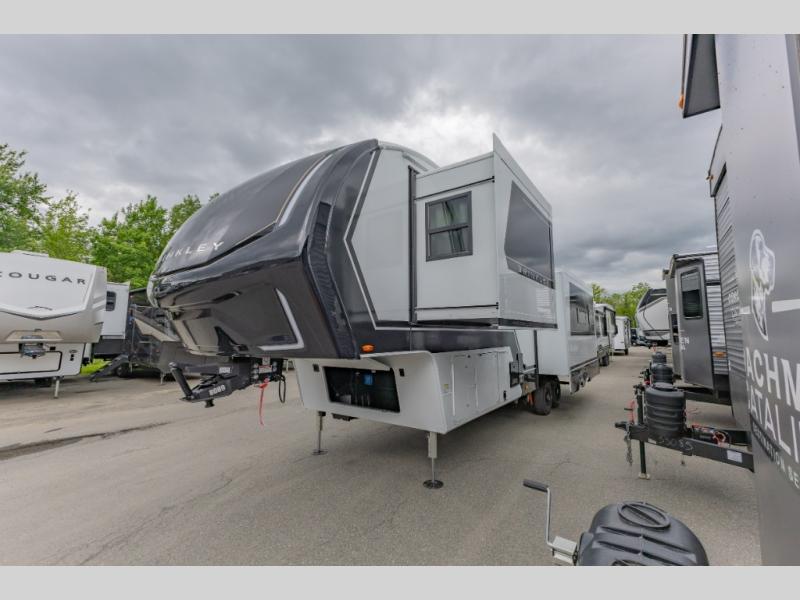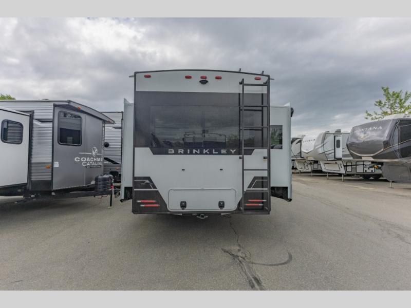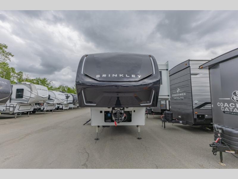 The Brinkley mid-profile Model Z fifth wheels bring you clean lines and an upscale look with plenty of style and exciting new features like the industry first brass plumbing connections. These units also feature an automotive grade front cap, plenty of exterior storage, dual exterior hot and cold showers, and wide stance leveling jacks for easy set up. Residential frameless windows provide a clean look and beautiful views, and ample electrical outlets and 6 USB/USB-C outlets allow all of your electronics and appliances to easily be used and charged.