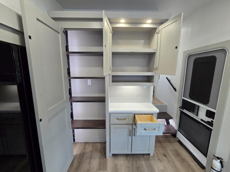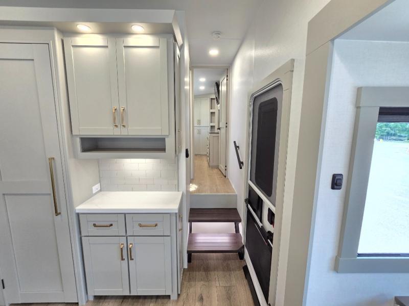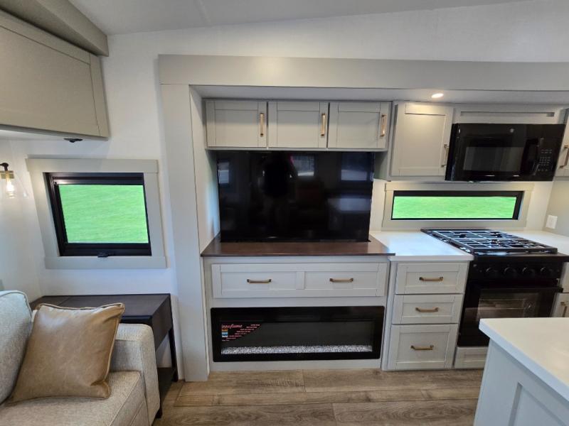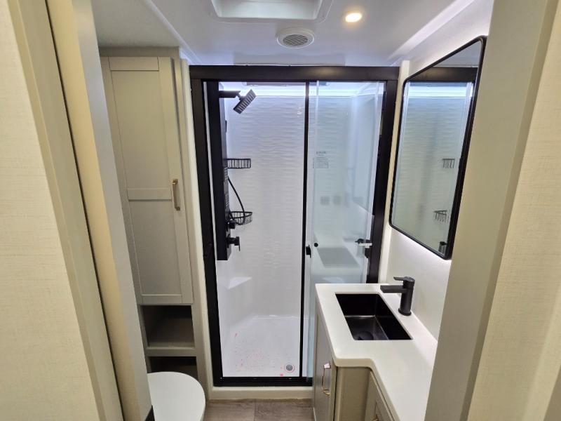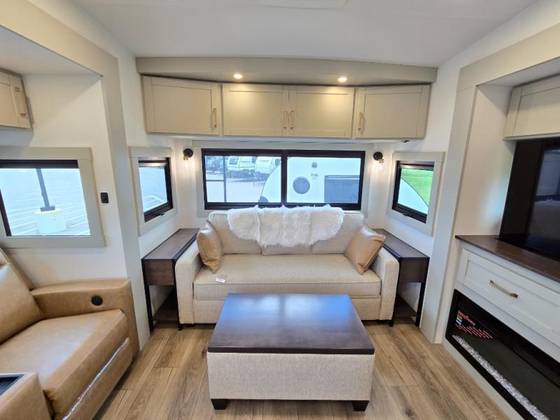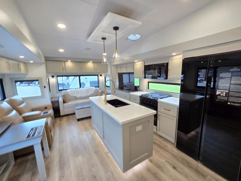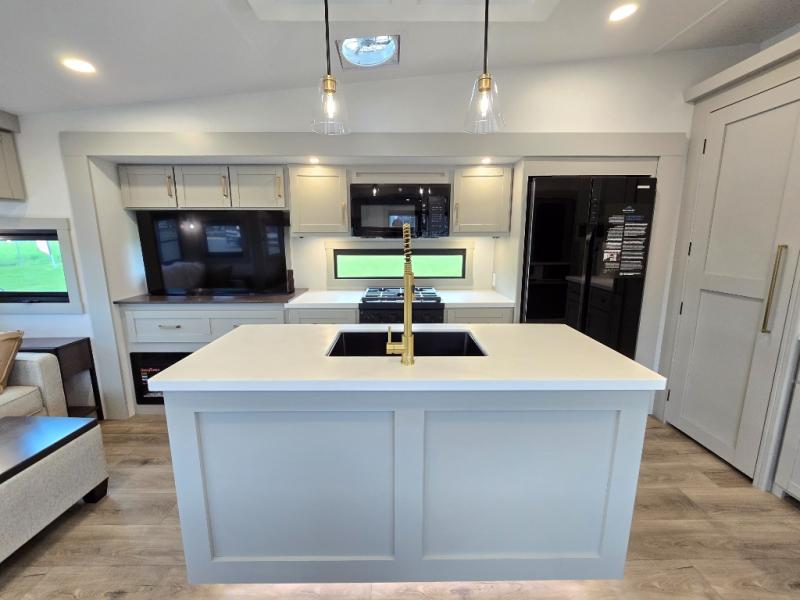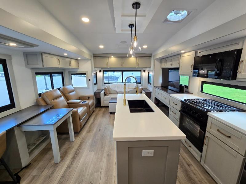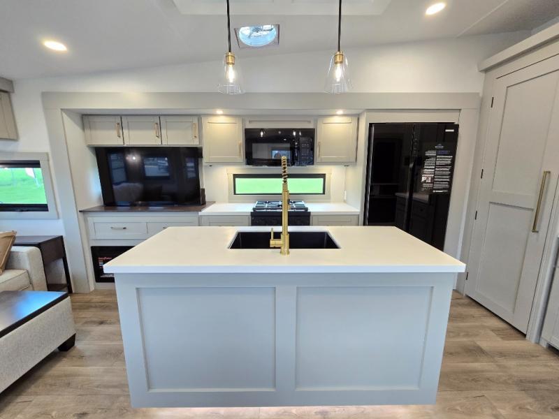 This Model Z luxury fifth wheel is bright and modern on the inside, with loads of amenities that will have you dreaming of your next trip! Enter and find a spacious combined living/kitchen space thanks to dual opposing slides. There is ample seating with a sliding desk/dining table, 62" theater seating, and a 72" tri-fold sofa along the rear wall. You can easily relax and enjoy the 50" Smart telescoping TV with a cozy fireplace below. The kitchen offers all that you need to prepare and cook meals just like home with a 16 cu. ft. refrigerator for your perishables, a 30" microwave oven, and three burner range top and oven. You will love the integrated spice rack, and the kitchen island all outfitted with dog bowls and double pull out trash bins with an integrated Stow 'N Go paper towel holder. There is also an 84" pantry with adjustable shelves for all of your canned and dry goods. Head up the steps to a private master suite with king bed slide. You can opt for the queen bed if you like. A sliding dresser top features hidden storage which is perfect for jewelry and other personal belongings. The front wardrobe features mirrored doors and the corner closet has been prepped for a stackable washer and dryer if you choose to add that option. Relax and enjoy a large bath featuring a linen cabinet, a 30" x 42" shower, and vanity with sink, plus medicine cabinet.