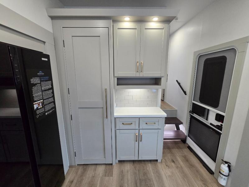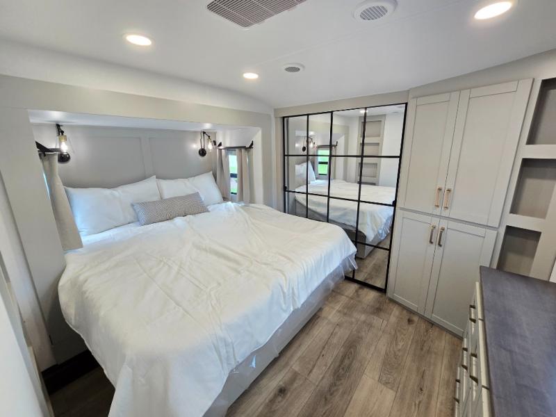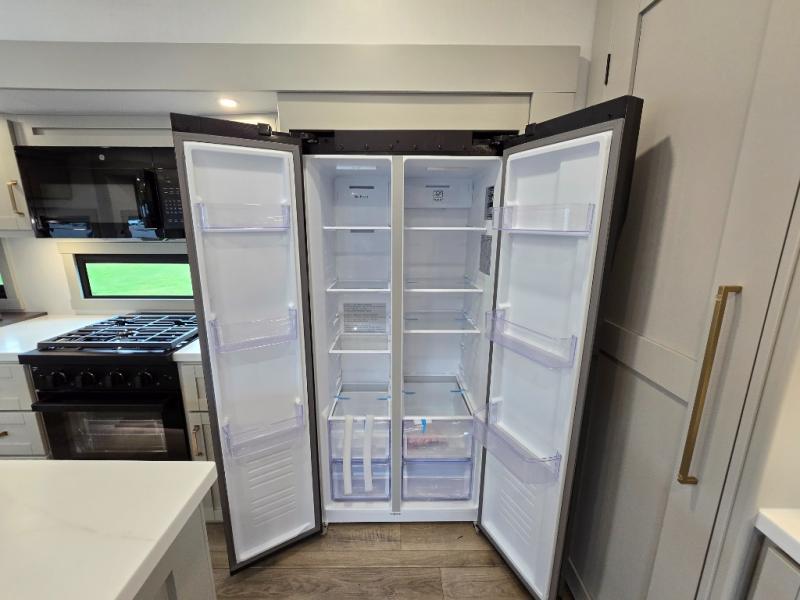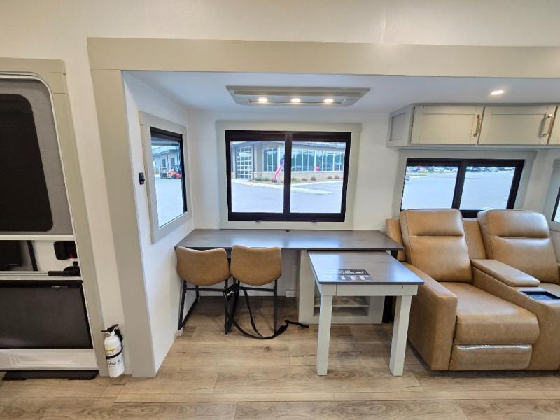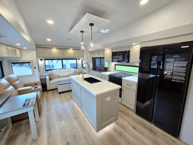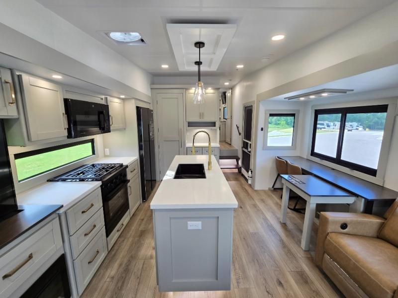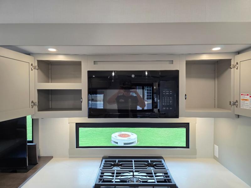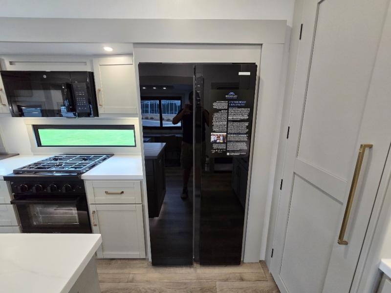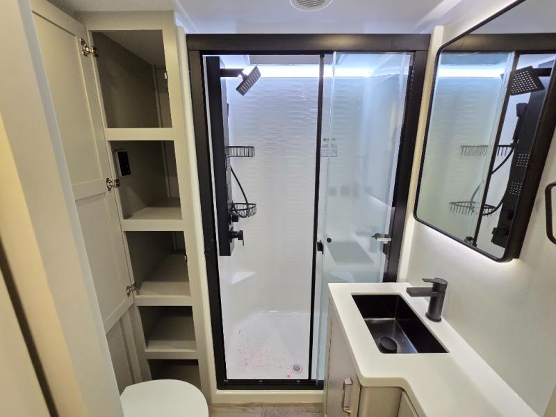 This Model Z luxury fifth wheel is bright and modern on the inside, with loads of amenities that will have you dreaming of your next trip! Enter and find a spacious combined living/kitchen space thanks to dual opposing slides. There is ample seating with a sliding desk/dining table, 62" theater seating, and a 72" tri-fold sofa along the rear wall. You can easily relax and enjoy the 50" Smart telescoping TV with a cozy fireplace below. The kitchen offers all that you need to prepare and cook meals just like home with a 16 cu. ft. refrigerator for your perishables, a 30" microwave oven, and three burner range top and oven. You will love the integrated spice rack, and the kitchen island all outfitted with dog bowls and double pull out trash bins with an integrated Stow 'N Go paper towel holder. There is also an 84" pantry with adjustable shelves for all of your canned and dry goods. Head up the steps to a private master suite with king bed slide. You can opt for the queen bed if you like. A sliding dresser top features hidden storage which is perfect for jewelry and other personal belongings. The front wardrobe features mirrored doors and the corner closet has been prepped for a stackable washer and dryer if you choose to add that option. Relax and enjoy a large bath featuring a linen cabinet, a 30" x 42" shower, and vanity with sink, plus medicine cabinet.