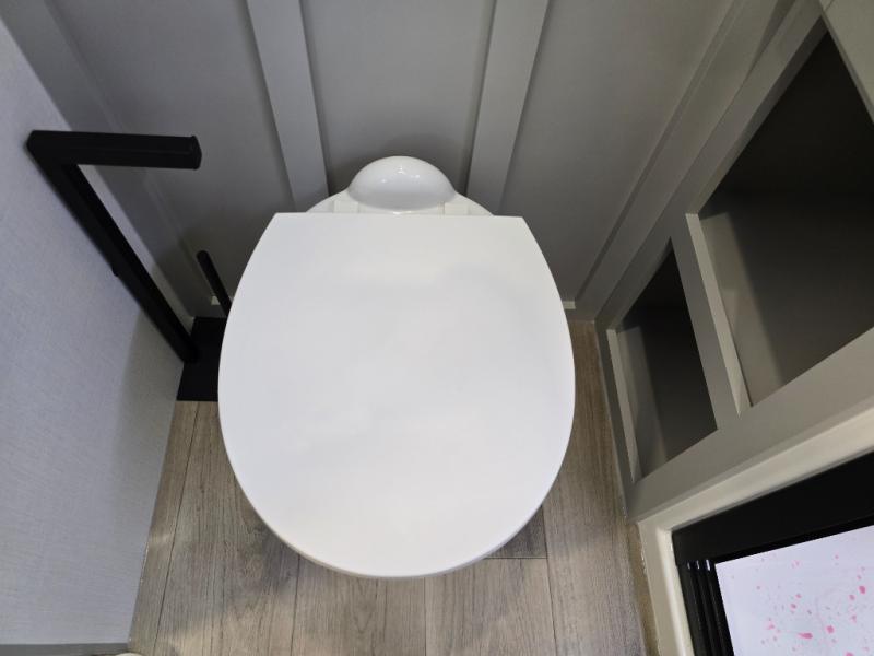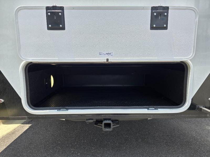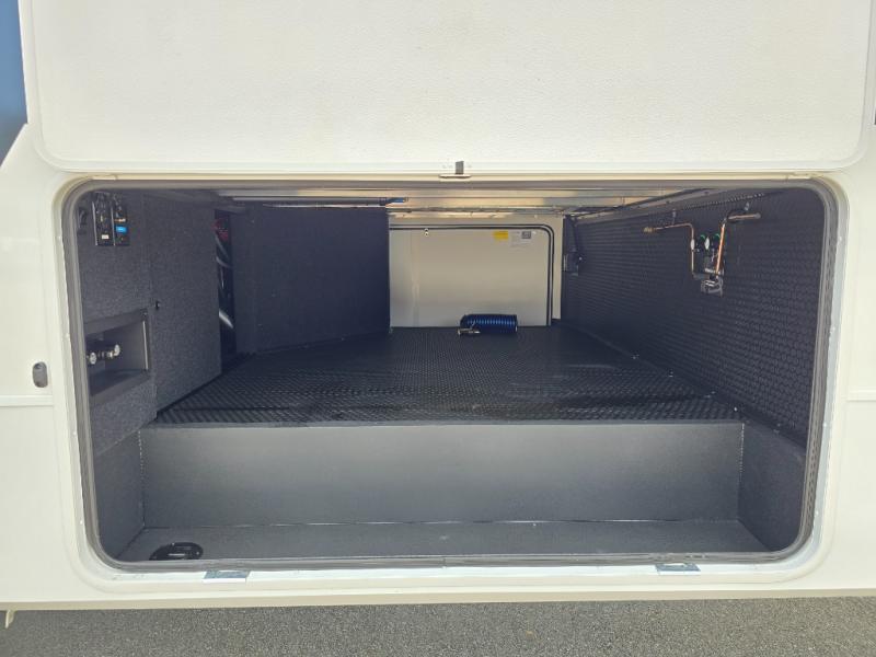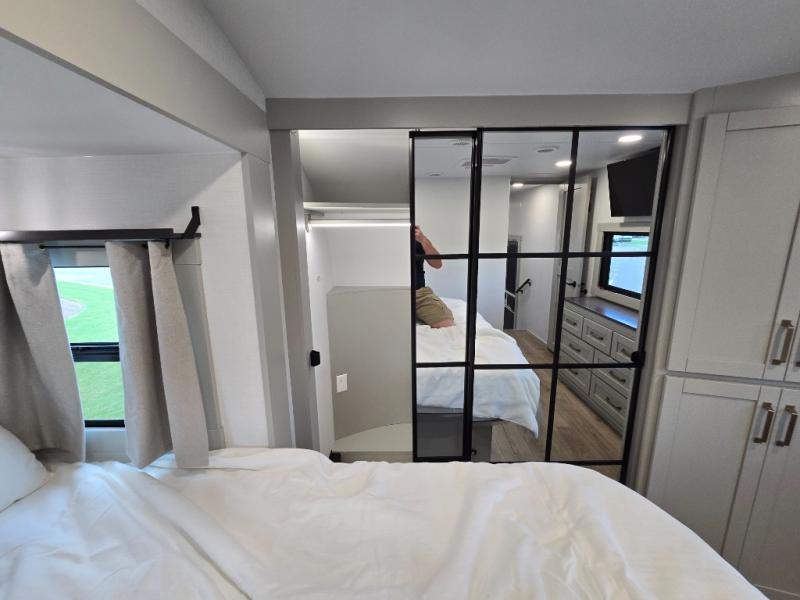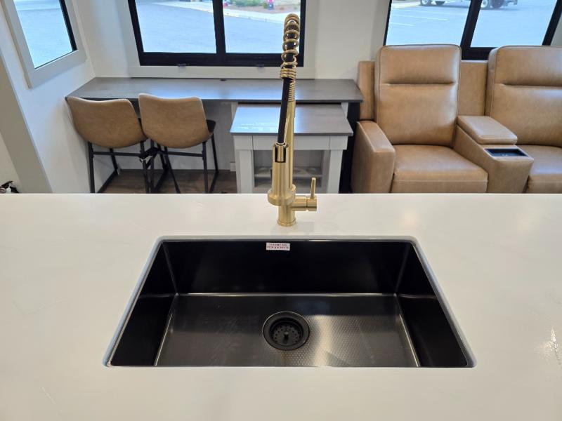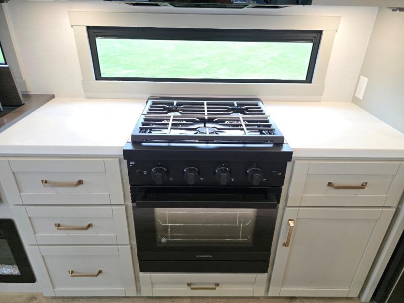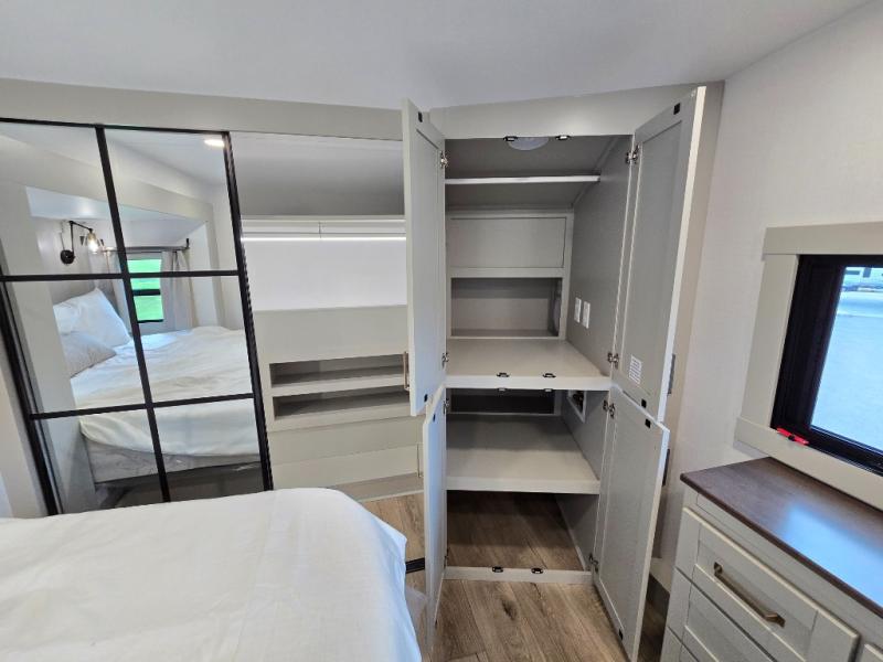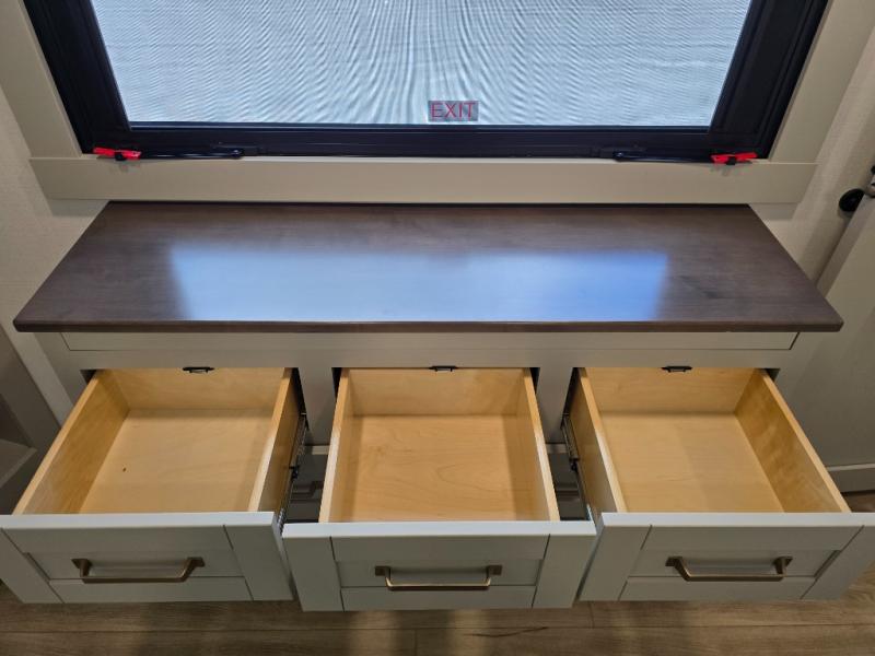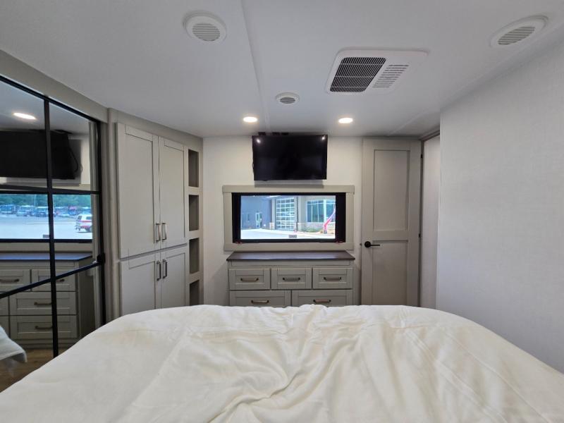This Model Z luxury fifth wheel is bright and modern on the inside, with loads of amenities that will have you dreaming of your next trip! Enter and find a spacious combined living/kitchen space thanks to dual opposing slides. There is ample seating with a sliding desk/dining table, 62" theater seating, and a 72" tri-fold sofa along the rear wall. You can easily relax and enjoy the 50" Smart telescoping TV with a cozy fireplace below. The kitchen offers all that you need to prepare and cook meals just like home with a 16 cu. ft. refrigerator for your perishables, a 30" microwave oven, and three burner range top and oven. You will love the integrated spice rack, and the kitchen island all outfitted with dog bowls and double pull out trash bins with an integrated Stow 'N Go paper towel holder. There is also an 84" pantry with adjustable shelves for all of your canned and dry goods. Head up the steps to a private master suite with king bed slide. You can opt for the queen bed if you like. A sliding dresser top features hidden storage which is perfect for jewelry and other personal belongings. The front wardrobe features mirrored doors and the corner closet has been prepped for a stackable washer and dryer if you choose to add that option. Relax and enjoy a large bath featuring a linen cabinet, a 30" x 42" shower, and vanity with sink, plus medicine cabinet.