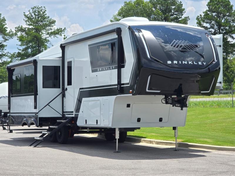 The Brinkley mid-profile Model Z fifth wheels bring you clean lines and an upscale look with plenty of style and exciting new features like the industry first brass plumbing connections. These units also feature an automotive grade front cap, plenty of exterior storage, dual exterior hot and cold showers, and wide stance leveling jacks for easy set up. Residential frameless windows provide a clean look and beautiful views, and ample electrical outlets and 6 USB/USB-C outlets allow all of your electronics and appliances to easily be used and charged.