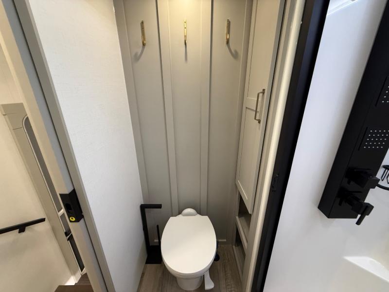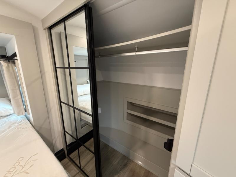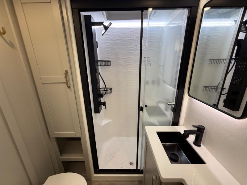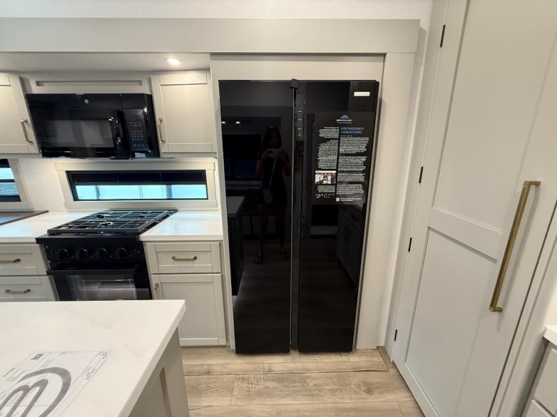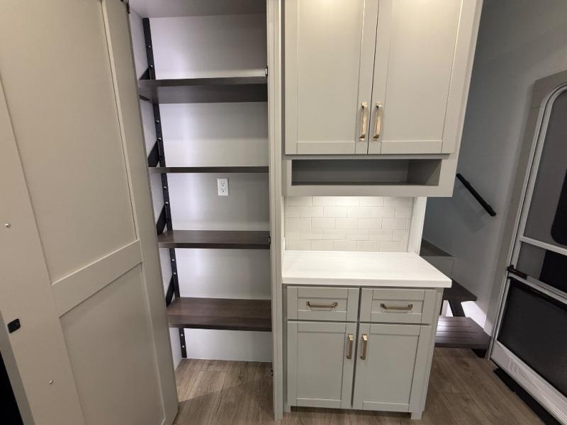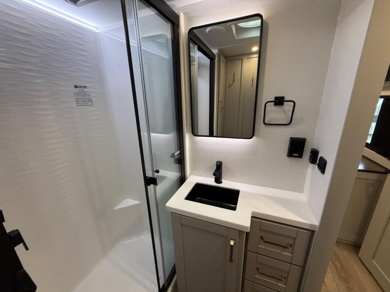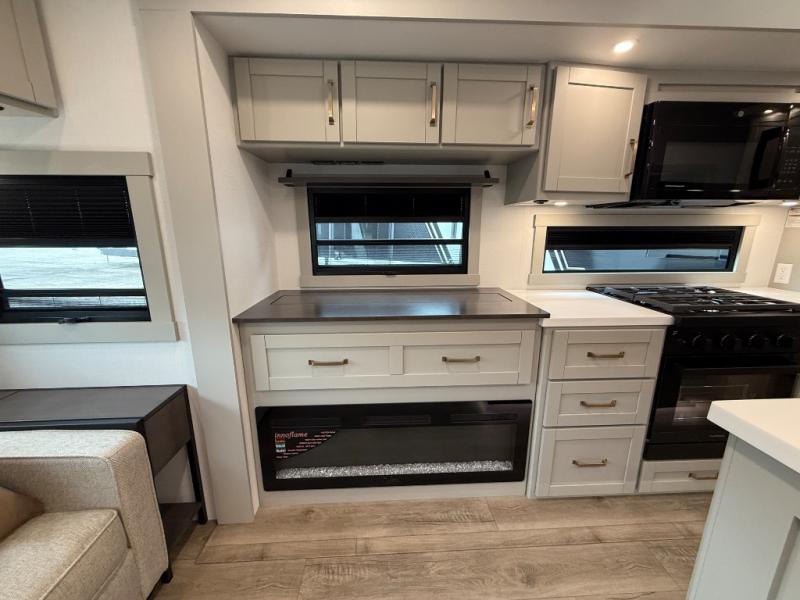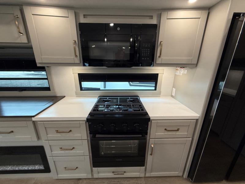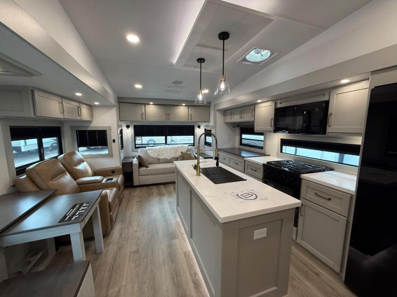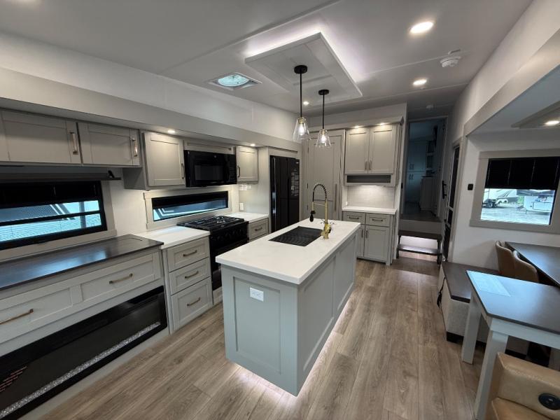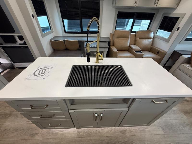 This Model Z luxury fifth wheel is bright and modern on the inside, with loads of amenities that will have you dreaming of your next trip! Enter and find a spacious combined living/kitchen space thanks to dual opposing slides. There is ample seating with a sliding desk/dining table, 62" theater seating, and a 72" tri-fold sofa along the rear wall. You can easily relax and enjoy the 50" Smart telescoping TV with a cozy fireplace below. The kitchen offers all that you need to prepare and cook meals just like home with a 16 cu. ft. refrigerator for your perishables, a 30" microwave oven, and three burner range top and oven. You will love the integrated spice rack, and the kitchen island all outfitted with dog bowls and double pull out trash bins with an integrated Stow 'N Go paper towel holder. There is also an 84" pantry with adjustable shelves for all of your canned and dry goods. Head up the steps to a private master suite with king bed slide. You can opt for the queen bed if you like. A sliding dresser top features hidden storage which is perfect for jewelry and other personal belongings. The front wardrobe features mirrored doors and the corner closet has been prepped for a stackable washer and dryer if you choose to add that option. Relax and enjoy a large bath featuring a linen cabinet, a 30" x 42" shower, and vanity with sink, plus medicine cabinet.