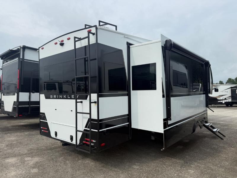 The Brinkley mid-profile Model Z fifth wheels bring you clean lines and an upscale look with plenty of style and exciting new features like the industry first brass plumbing connections. These units also feature an automotive grade front cap, plenty of exterior storage, dual exterior hot and cold showers, and wide stance leveling jacks for easy set up. Residential frameless windows provide a clean look and beautiful views, and ample electrical outlets and 6 USB/USB-C outlets allow all of your electronics and appliances to easily be used and charged.