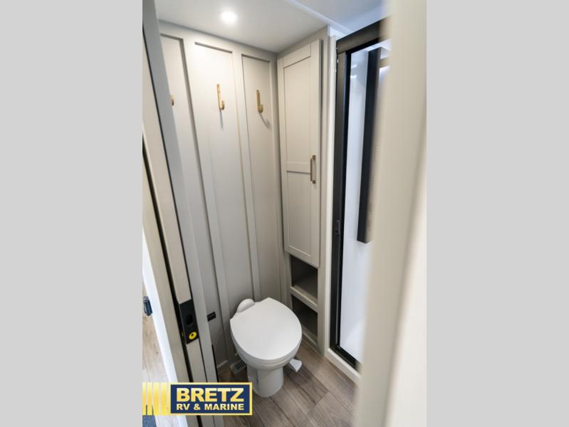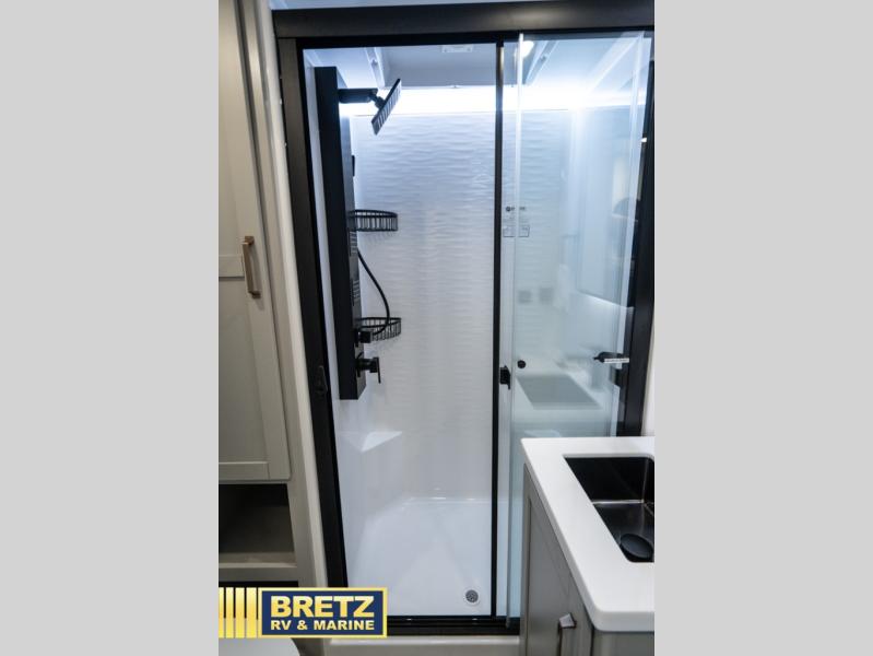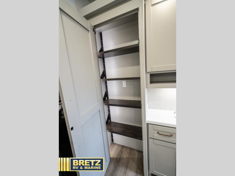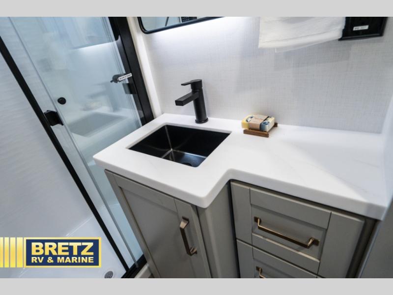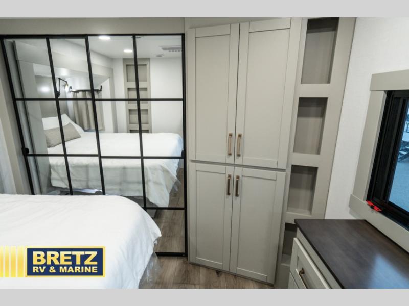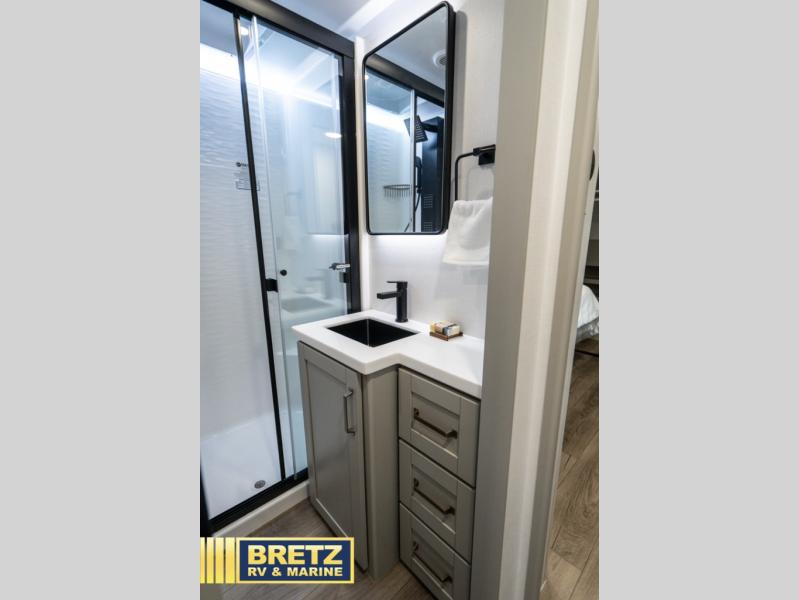 This Model Z luxury fifth wheel is bright and modern on the inside, with loads of amenities that will have you dreaming of your next trip! Enter and find a spacious combined living/kitchen space thanks to dual opposing slides. There is ample seating with a sliding desk/dining table, 62" theater seating, and a 72" tri-fold sofa along the rear wall. You can easily relax and enjoy the 50" Smart telescoping TV with a cozy fireplace below. The kitchen offers all that you need to prepare and cook meals just like home with a 16 cu. ft. refrigerator for your perishables, a 30" microwave oven, and three burner range top and oven. You will love the integrated spice rack, and the kitchen island all outfitted with dog bowls and double pull out trash bins with an integrated Stow 'N Go paper towel holder. There is also an 84" pantry with adjustable shelves for all of your canned and dry goods. Head up the steps to a private master suite with king bed slide. You can opt for the queen bed if you like. A sliding dresser top features hidden storage which is perfect for jewelry and other personal belongings. The front wardrobe features mirrored doors and the corner closet has been prepped for a stackable washer and dryer if you choose to add that option. Relax and enjoy a large bath featuring a linen cabinet, a 30" x 42" shower, and vanity with sink, plus medicine cabinet.
