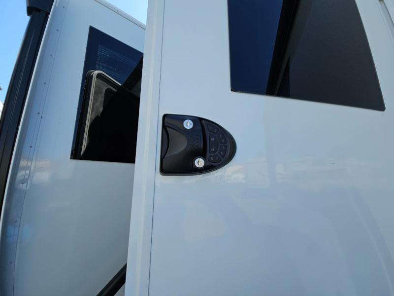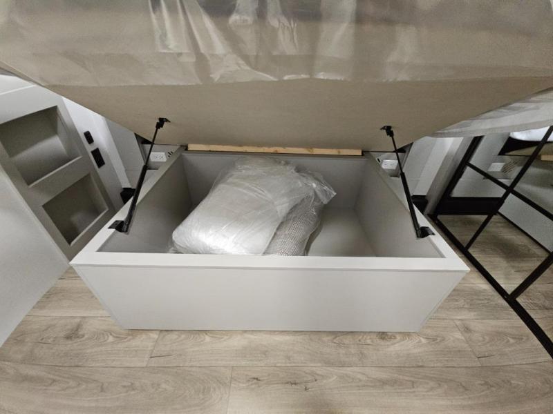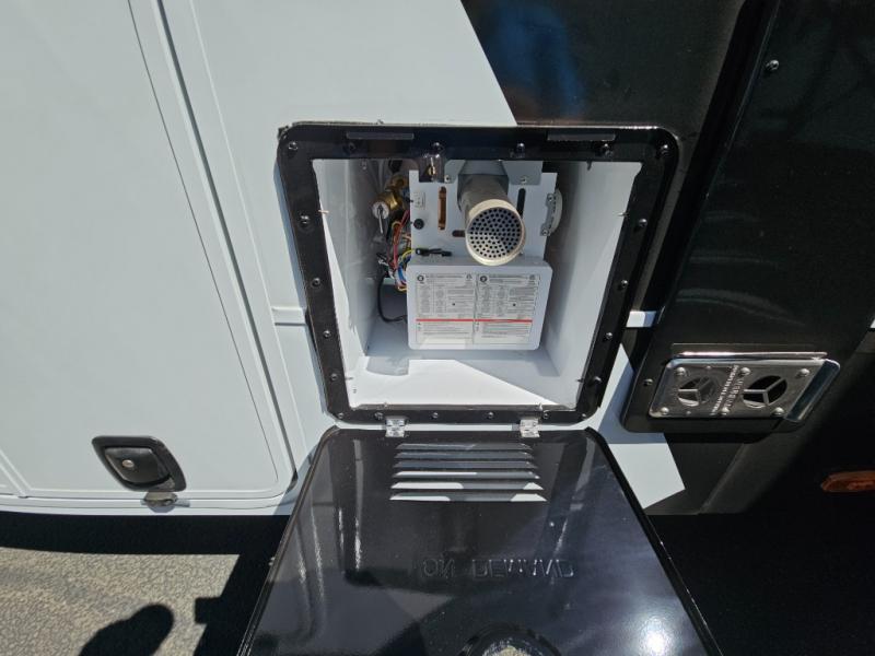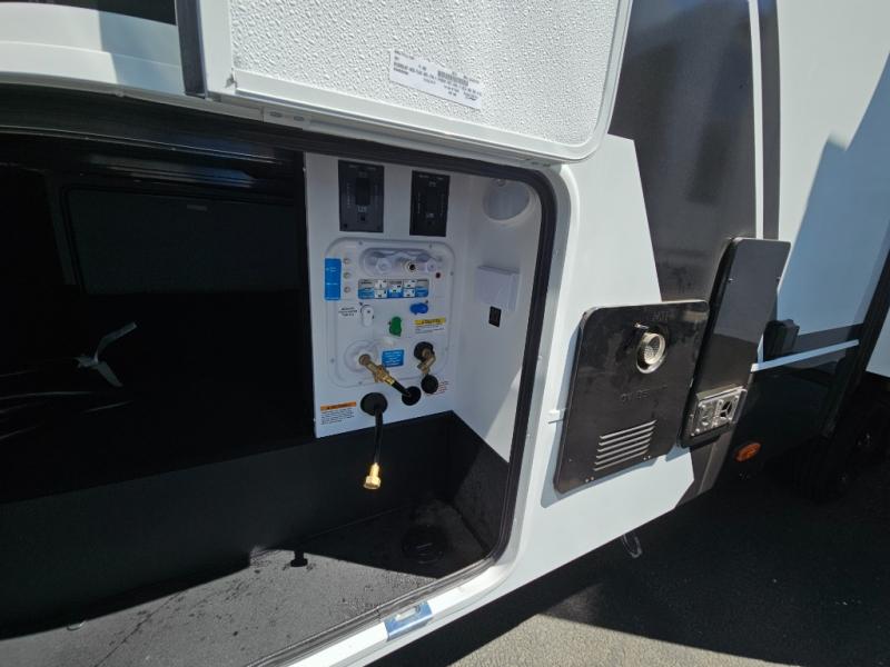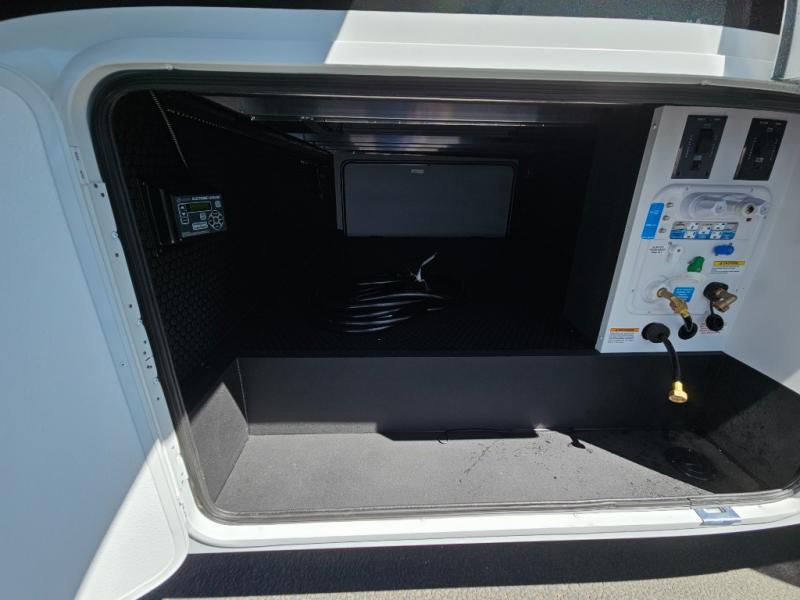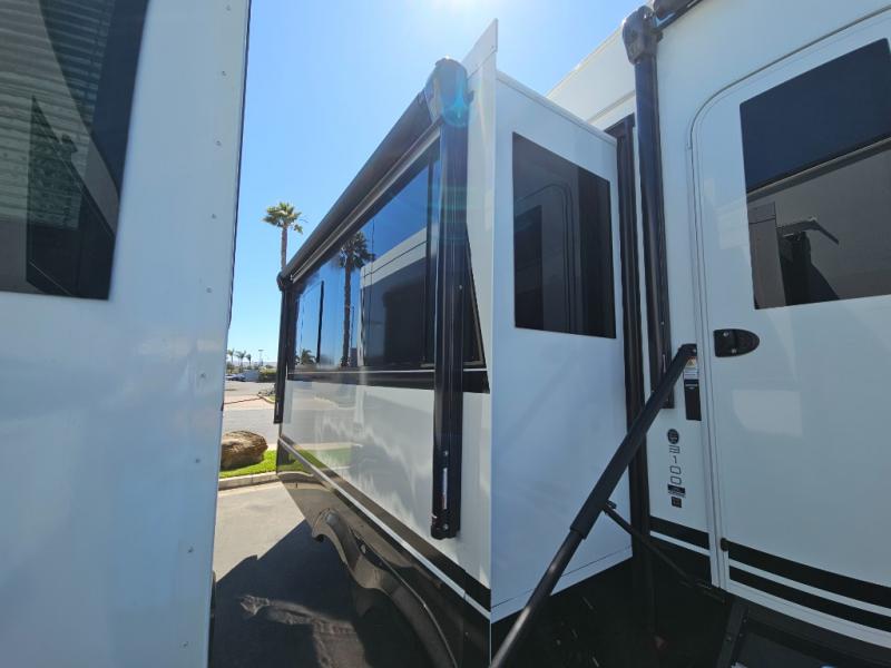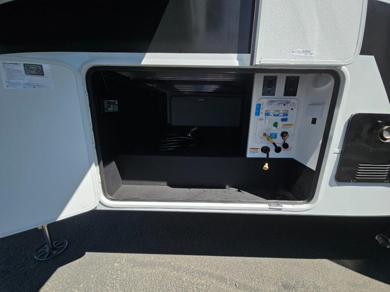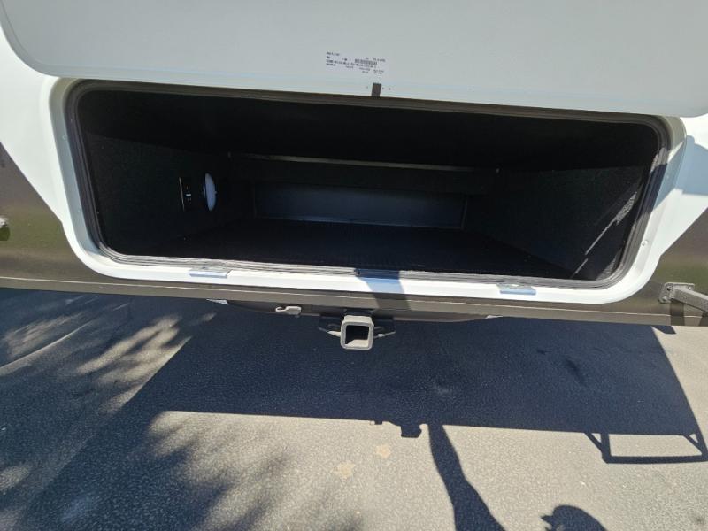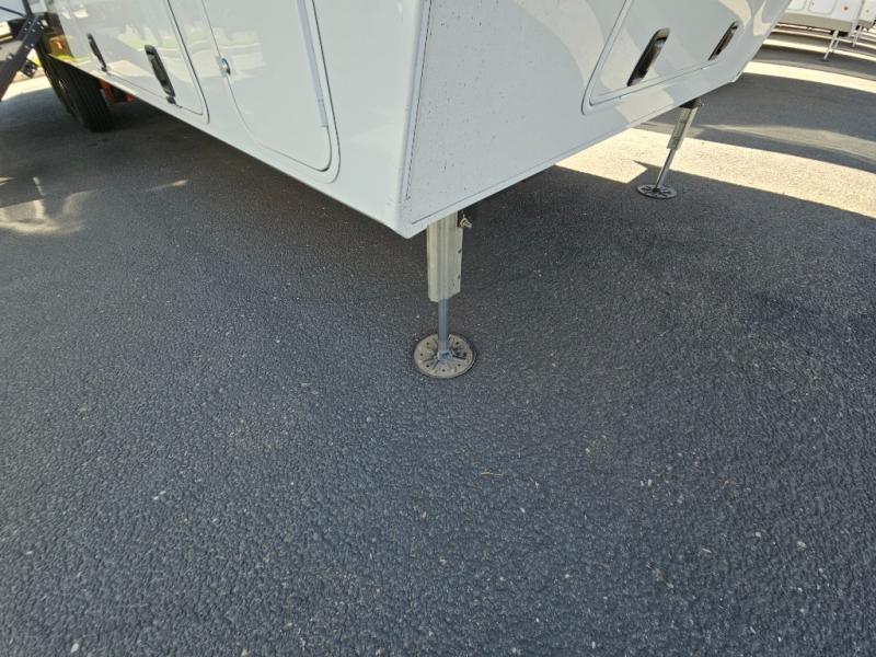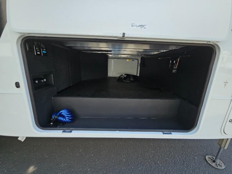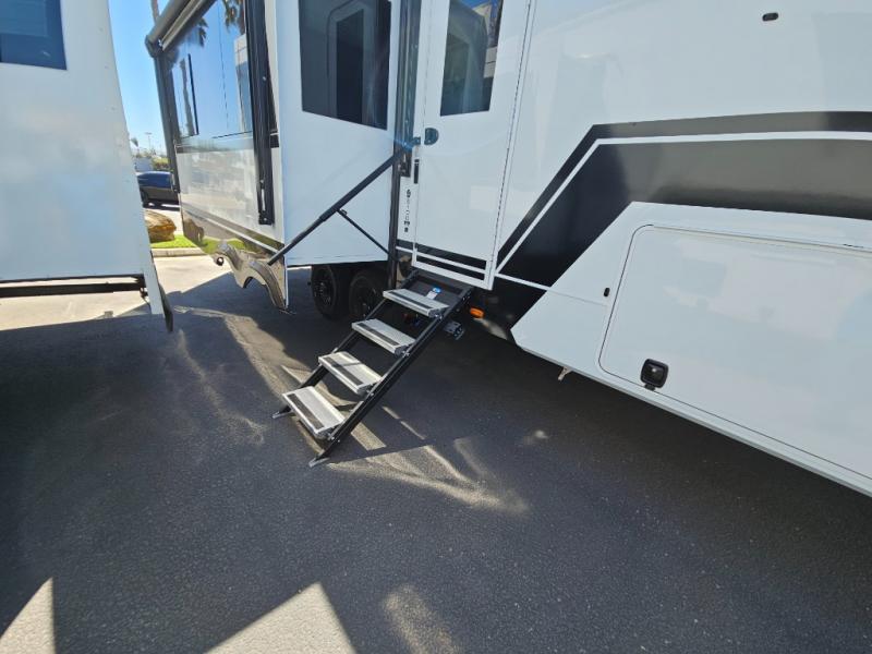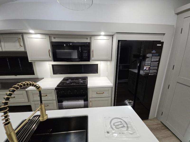 This Model Z luxury fifth wheel is bright and modern on the inside, with loads of amenities that will have you dreaming of your next trip! Enter and find a spacious combined living/kitchen space thanks to dual opposing slides. There is ample seating with a sliding desk/dining table, 62" theater seating, and a 72" tri-fold sofa along the rear wall. You can easily relax and enjoy the 50" Smart telescoping TV with a cozy fireplace below. The kitchen offers all that you need to prepare and cook meals just like home with a 16 cu. ft. refrigerator for your perishables, a 30" microwave oven, and three burner range top and oven. You will love the integrated spice rack, and the kitchen island all outfitted with dog bowls and double pull out trash bins with an integrated Stow 'N Go paper towel holder. There is also an 84" pantry with adjustable shelves for all of your canned and dry goods. Head up the steps to a private master suite with king bed slide. You can opt for the queen bed if you like. A sliding dresser top features hidden storage which is perfect for jewelry and other personal belongings. The front wardrobe features mirrored doors and the corner closet has been prepped for a stackable washer and dryer if you choose to add that option. Relax and enjoy a large bath featuring a linen cabinet, a 30" x 42" shower, and vanity with sink, plus medicine cabinet.