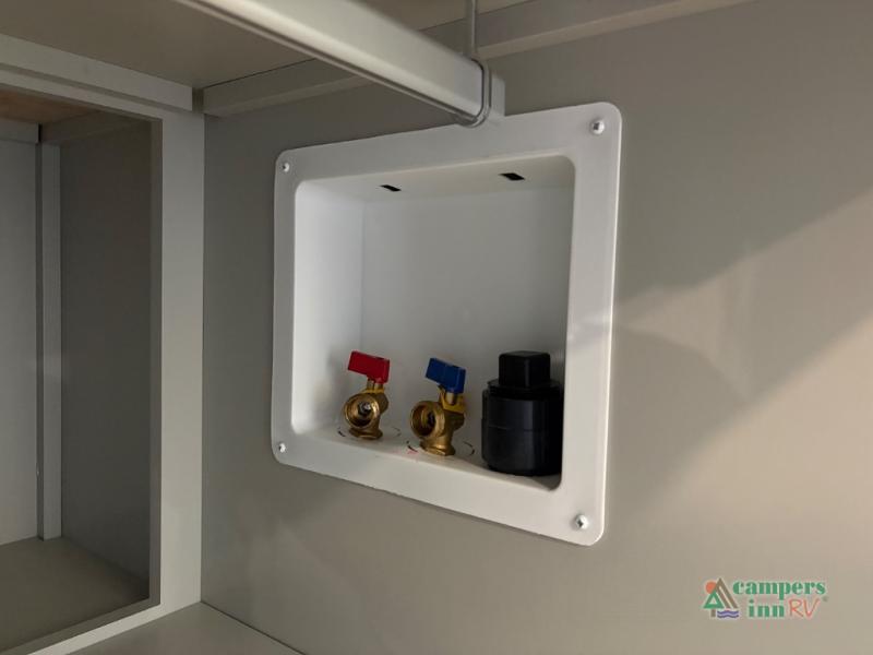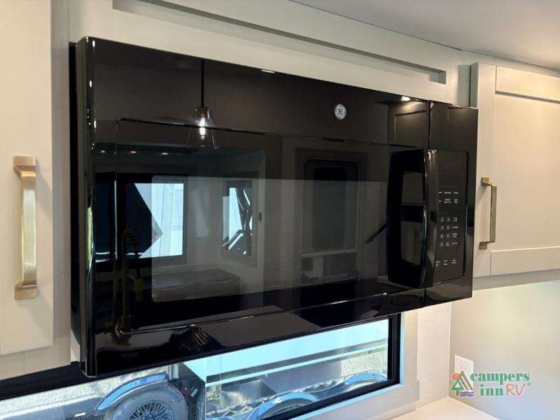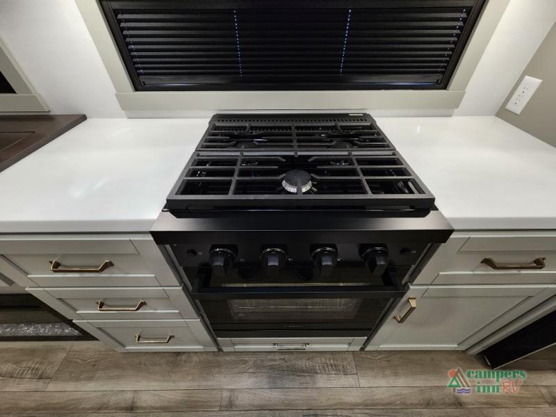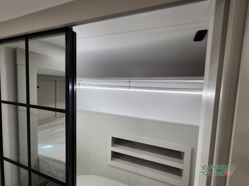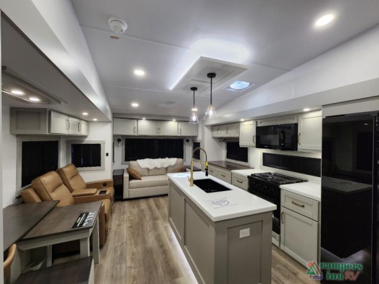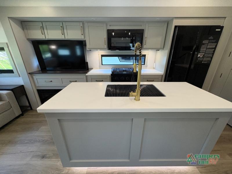 This Model Z luxury fifth wheel is bright and modern on the inside, with loads of amenities that will have you dreaming of your next trip! Enter and find a spacious combined living/kitchen space thanks to dual opposing slides. There is ample seating with a sliding desk/dining table, 62" theater seating, and a 72" tri-fold sofa along the rear wall. You can easily relax and enjoy the 50" Smart telescoping TV with a cozy fireplace below. The kitchen offers all that you need to prepare and cook meals just like home with a 16 cu. ft. refrigerator for your perishables, a 30" microwave oven, and three burner range top and oven. You will love the integrated spice rack, and the kitchen island all outfitted with dog bowls and double pull out trash bins with an integrated Stow 'N Go paper towel holder. There is also an 84" pantry with adjustable shelves for all of your canned and dry goods. Head up the steps to a private master suite with king bed slide. You can opt for the queen bed if you like. A sliding dresser top features hidden storage which is perfect for jewelry and other personal belongings. The front wardrobe features mirrored doors and the corner closet has been prepped for a stackable washer and dryer if you choose to add that option. Relax and enjoy a large bath featuring a linen cabinet, a 30" x 42" shower, and vanity with sink, plus medicine cabinet.