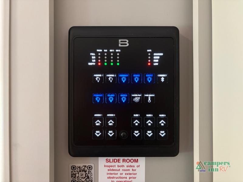 Central touchscreen control system with Bluetooth compatibility for lights, slides, tanks, and awnings.