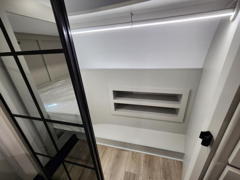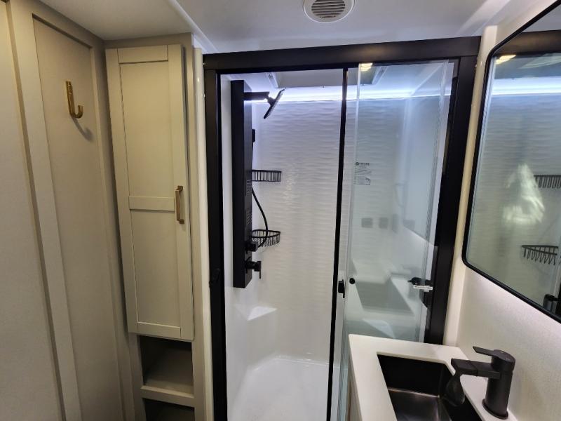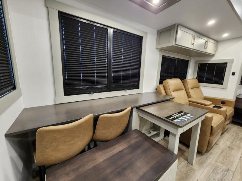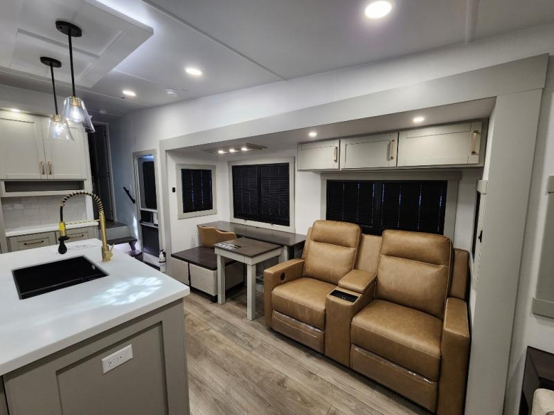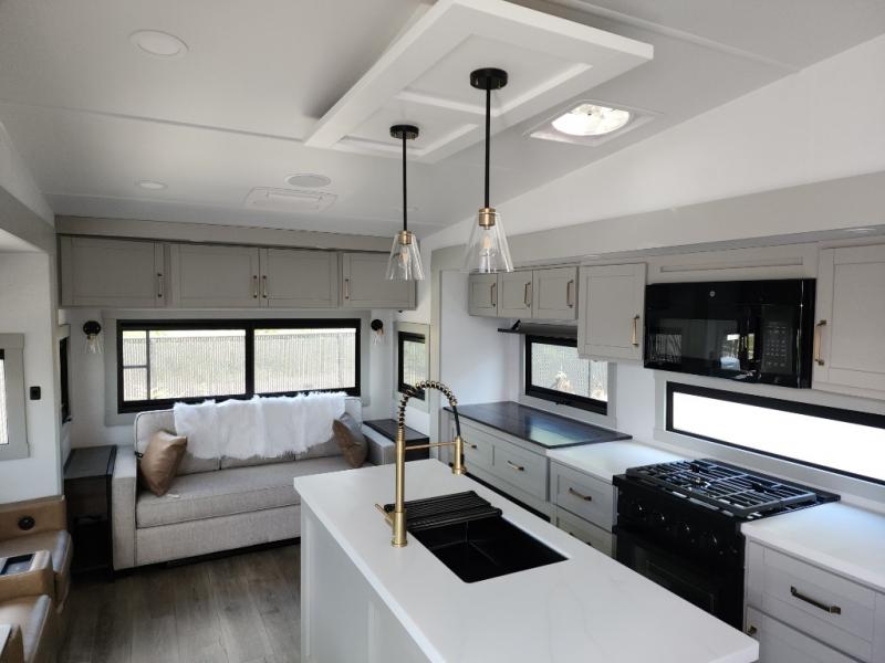 This Model Z luxury fifth wheel is bright and modern on the inside, with loads of amenities that will have you dreaming of your next trip! Enter and find a spacious combined living/kitchen space thanks to dual opposing slides. There is ample seating with a sliding desk/dining table, 62" theater seating, and a 72" tri-fold sofa along the rear wall. You can easily relax and enjoy the 50" Smart telescoping TV with a cozy fireplace below. The kitchen offers all that you need to prepare and cook meals just like home with a 16 cu. ft. refrigerator for your perishables, a 30" microwave oven, and three burner range top and oven. You will love the integrated spice rack, and the kitchen island all outfitted with dog bowls and double pull out trash bins with an integrated Stow 'N Go paper towel holder. There is also an 84" pantry with adjustable shelves for all of your canned and dry goods. Head up the steps to a private master suite with king bed slide. You can opt for the queen bed if you like. A sliding dresser top features hidden storage which is perfect for jewelry and other personal belongings. The front wardrobe features mirrored doors and the corner closet has been prepped for a stackable washer and dryer if you choose to add that option. Relax and enjoy a large bath featuring a linen cabinet, a 30" x 42" shower, and vanity with sink, plus medicine cabinet.