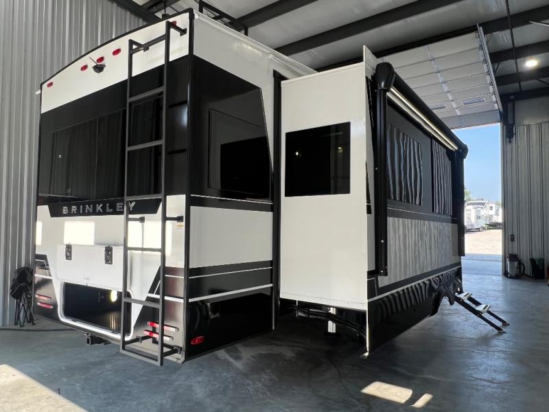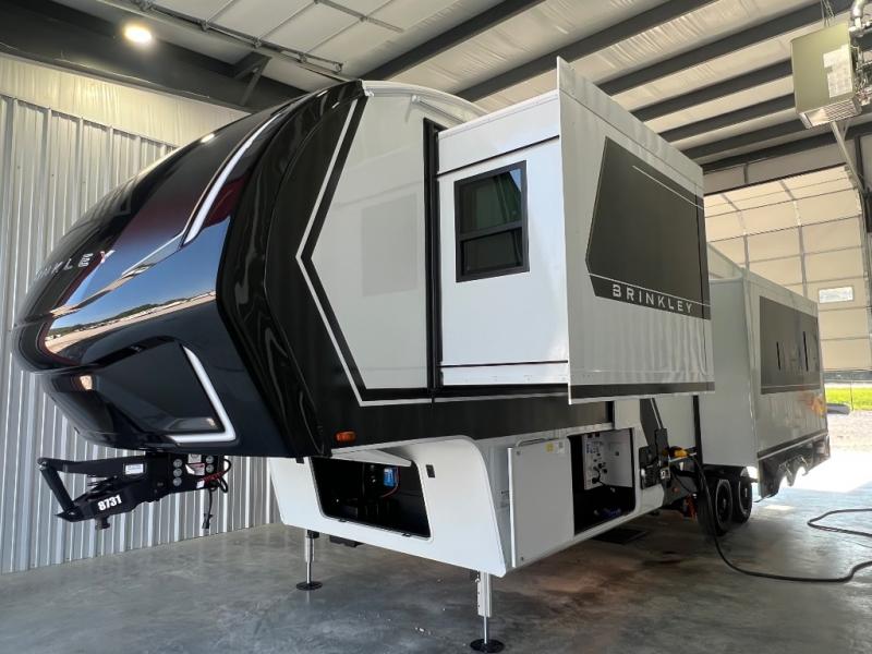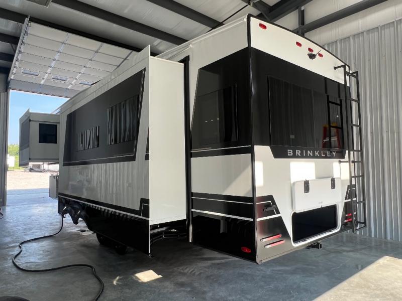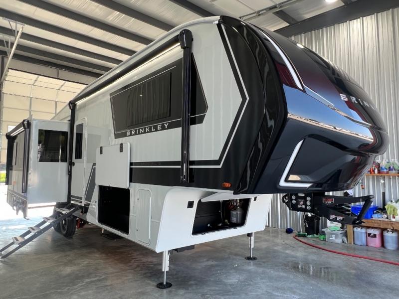 The Brinkley mid-profile Model Z fifth wheels bring you clean lines and an upscale look with plenty of style and exciting new features like the industry first brass plumbing connections. These units also feature an automotive grade front cap, plenty of exterior storage, dual exterior hot and cold showers, and wide stance leveling jacks for easy set up. Residential frameless windows provide a clean look and beautiful views, and ample electrical outlets and 6 USB/USB-C outlets allow all of your electronics and appliances to easily be used and charged.