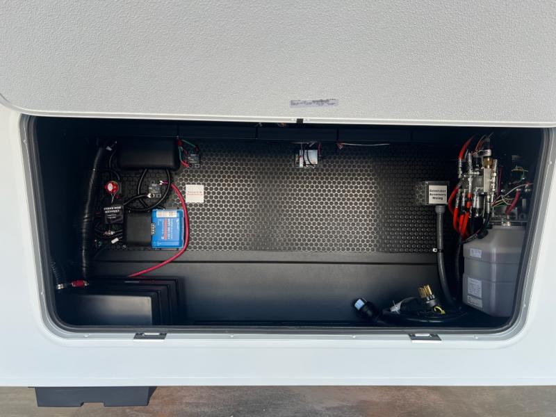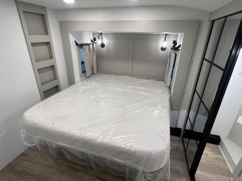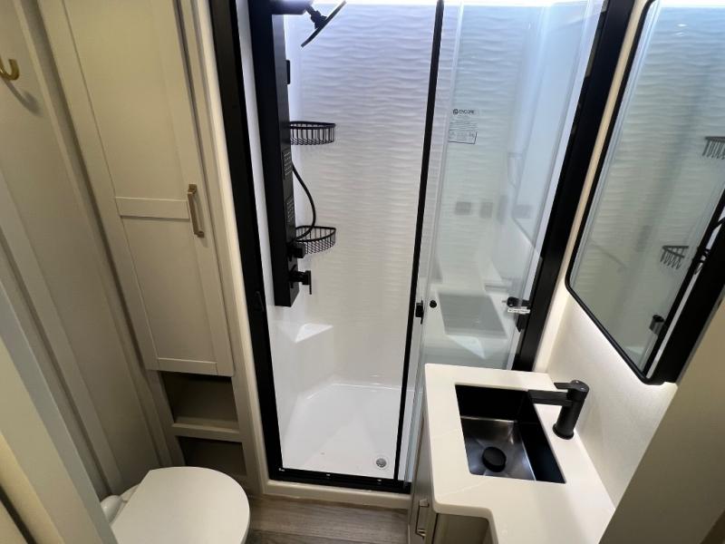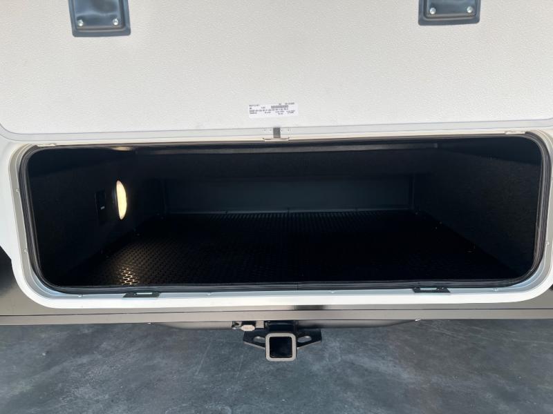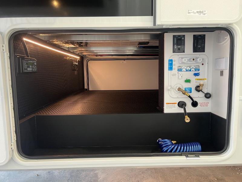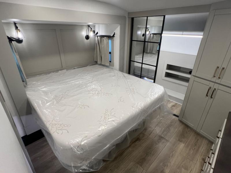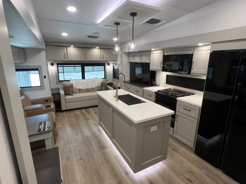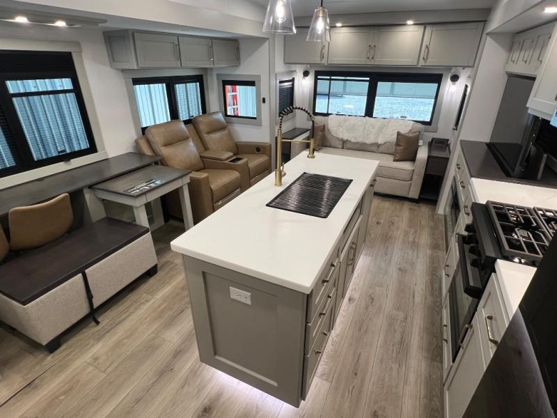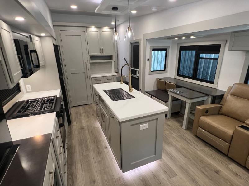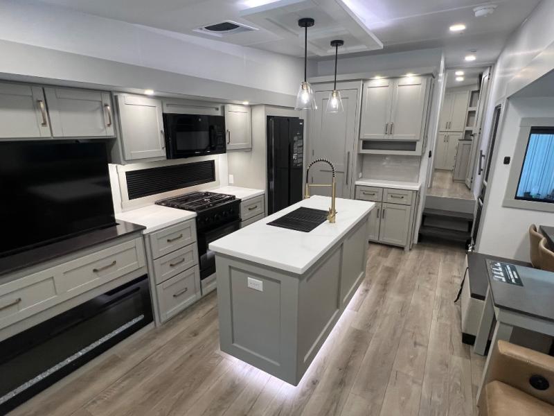 This Model Z luxury fifth wheel is bright and modern on the inside, with loads of amenities that will have you dreaming of your next trip! Enter and find a spacious combined living/kitchen space thanks to dual opposing slides. There is ample seating with a sliding desk/dining table, 62" theater seating, and a 72" tri-fold sofa along the rear wall. You can easily relax and enjoy the 50" Smart telescoping TV with a cozy fireplace below. The kitchen offers all that you need to prepare and cook meals just like home with a 16 cu. ft. refrigerator for your perishables, a 30" microwave oven, and three burner range top and oven. You will love the integrated spice rack, and the kitchen island all outfitted with dog bowls and double pull out trash bins with an integrated Stow 'N Go paper towel holder. There is also an 84" pantry with adjustable shelves for all of your canned and dry goods. Head up the steps to a private master suite with king bed slide. You can opt for the queen bed if you like. A sliding dresser top features hidden storage which is perfect for jewelry and other personal belongings. The front wardrobe features mirrored doors and the corner closet has been prepped for a stackable washer and dryer if you choose to add that option. Relax and enjoy a large bath featuring a linen cabinet, a 30" x 42" shower, and vanity with sink, plus medicine cabinet.
