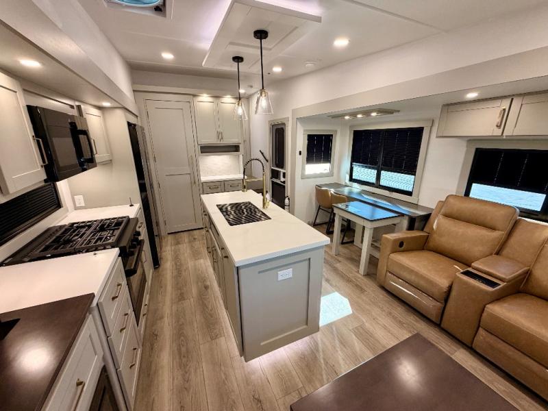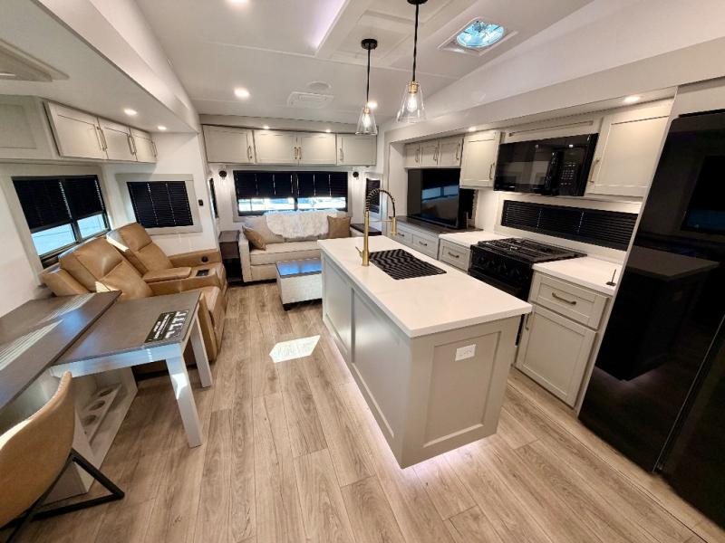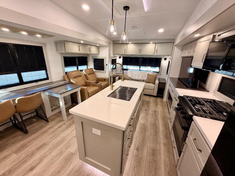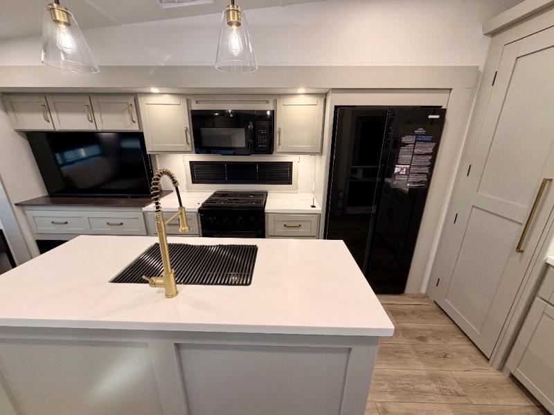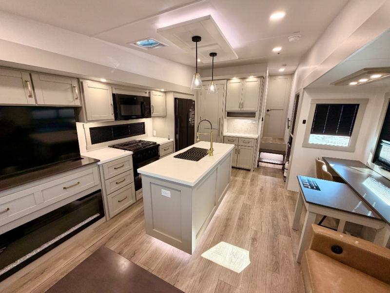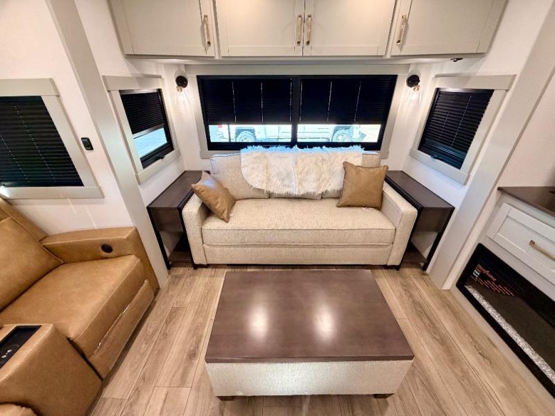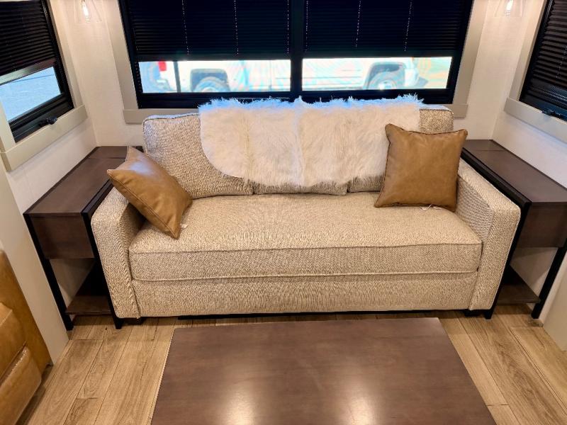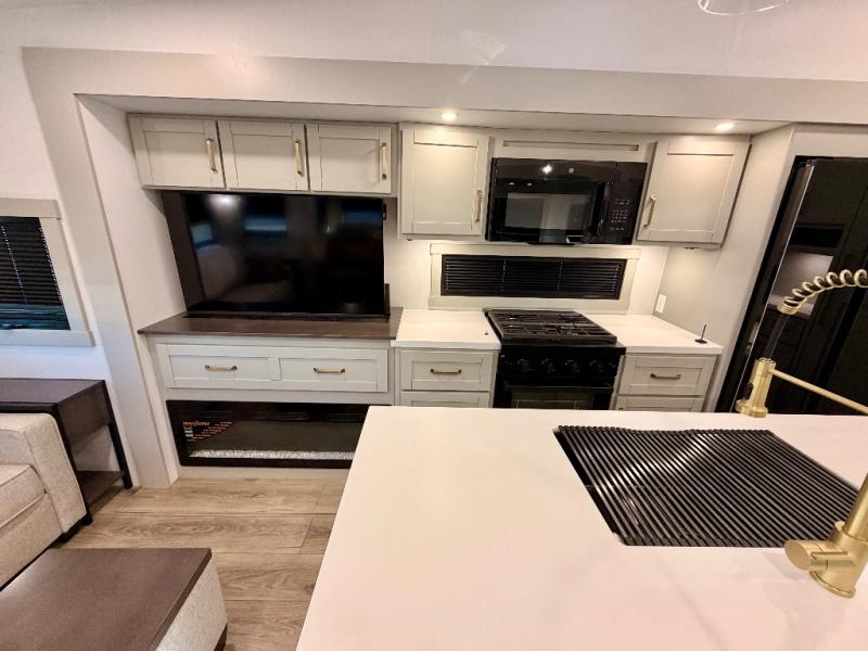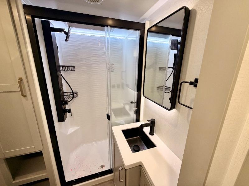 This Model Z luxury fifth wheel is bright and modern on the inside, with loads of amenities that will have you dreaming of your next trip! Enter and find a spacious combined living/kitchen space thanks to dual opposing slides. There is ample seating with a sliding desk/dining table, 62" theater seating, and a 72" tri-fold sofa along the rear wall. You can easily relax and enjoy the 50" Smart telescoping TV with a cozy fireplace below. The kitchen offers all that you need to prepare and cook meals just like home with a 16 cu. ft. refrigerator for your perishables, a 30" microwave oven, and three burner range top and oven. You will love the integrated spice rack, and the kitchen island all outfitted with dog bowls and double pull out trash bins with an integrated Stow 'N Go paper towel holder. There is also an 84" pantry with adjustable shelves for all of your canned and dry goods. Head up the steps to a private master suite with king bed slide. You can opt for the queen bed if you like. A sliding dresser top features hidden storage which is perfect for jewelry and other personal belongings. The front wardrobe features mirrored doors and the corner closet has been prepped for a stackable washer and dryer if you choose to add that option. Relax and enjoy a large bath featuring a linen cabinet, a 30" x 42" shower, and vanity with sink, plus medicine cabinet.