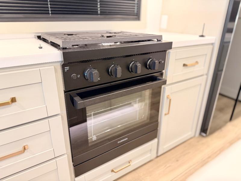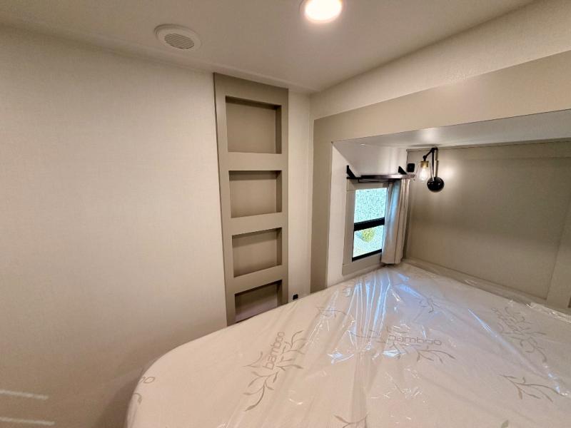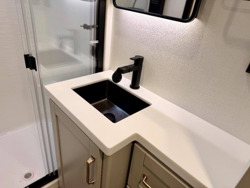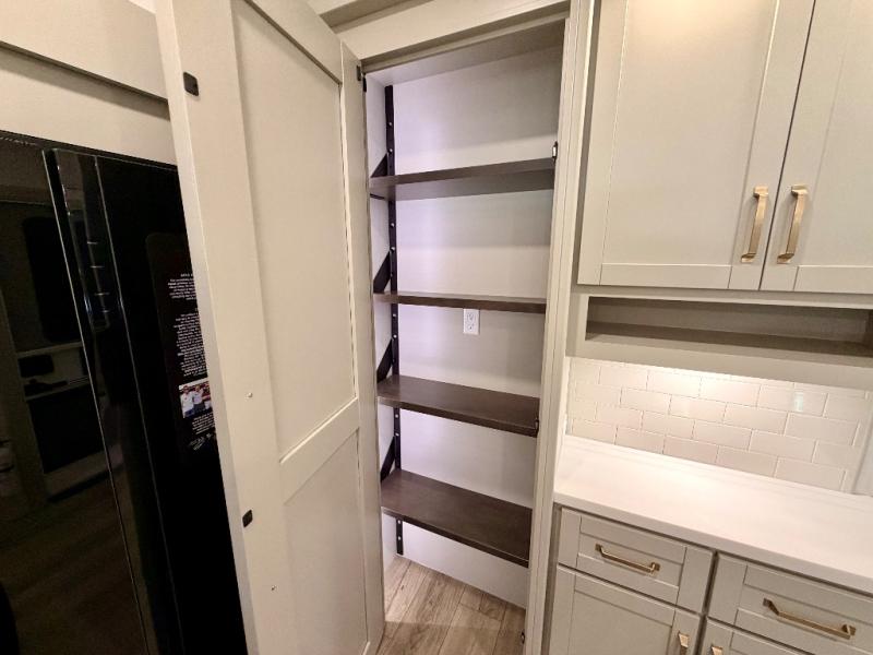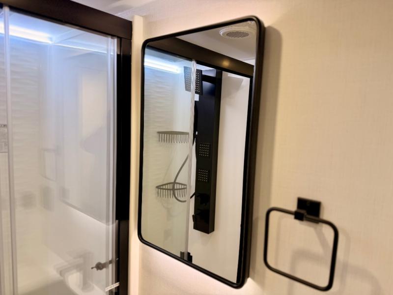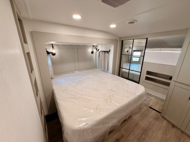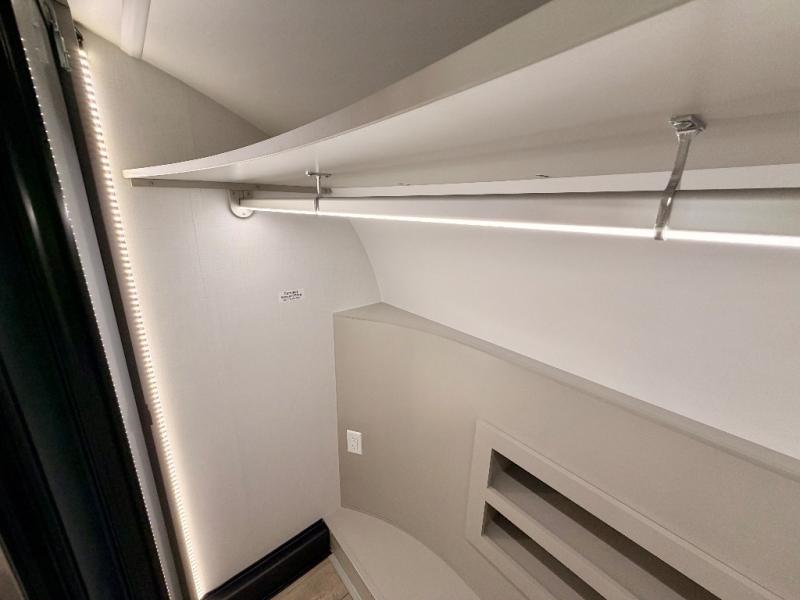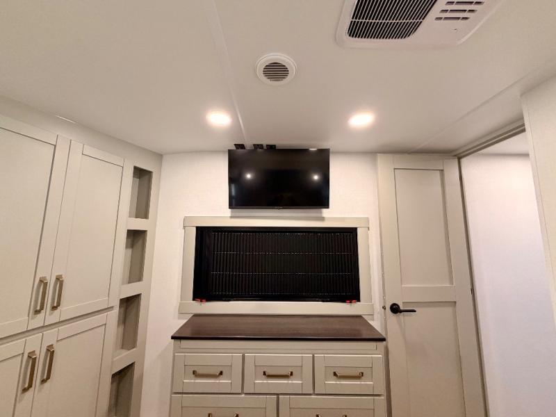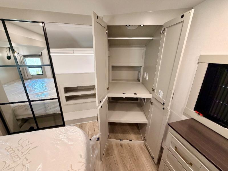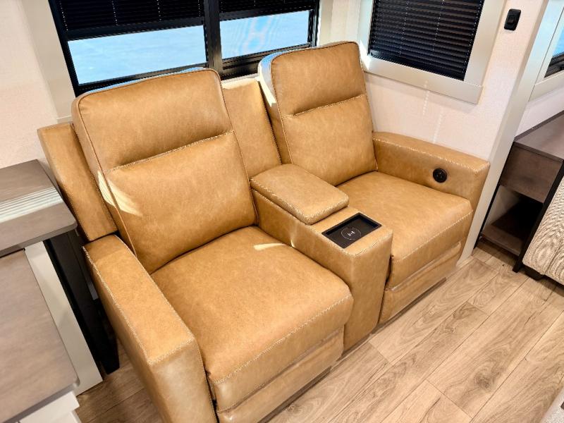 This Model Z luxury fifth wheel is bright and modern on the inside, with loads of amenities that will have you dreaming of your next trip! Enter and find a spacious combined living/kitchen space thanks to dual opposing slides. There is ample seating with a sliding desk/dining table, 62" theater seating, and a 72" tri-fold sofa along the rear wall. You can easily relax and enjoy the 50" Smart telescoping TV with a cozy fireplace below. The kitchen offers all that you need to prepare and cook meals just like home with a 16 cu. ft. refrigerator for your perishables, a 30" microwave oven, and three burner range top and oven. You will love the integrated spice rack, and the kitchen island all outfitted with dog bowls and double pull out trash bins with an integrated Stow 'N Go paper towel holder. There is also an 84" pantry with adjustable shelves for all of your canned and dry goods. Head up the steps to a private master suite with king bed slide. You can opt for the queen bed if you like. A sliding dresser top features hidden storage which is perfect for jewelry and other personal belongings. The front wardrobe features mirrored doors and the corner closet has been prepped for a stackable washer and dryer if you choose to add that option. Relax and enjoy a large bath featuring a linen cabinet, a 30" x 42" shower, and vanity with sink, plus medicine cabinet.