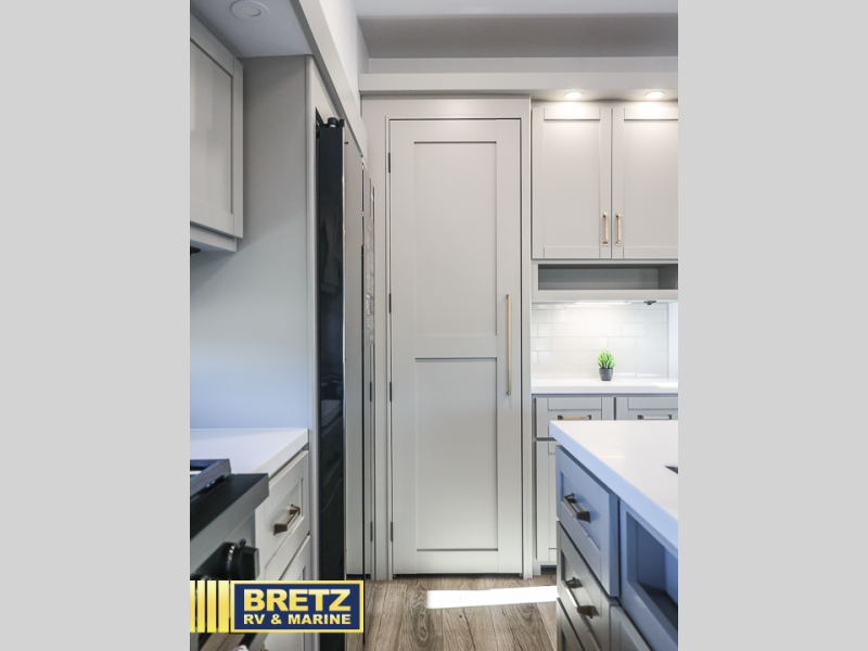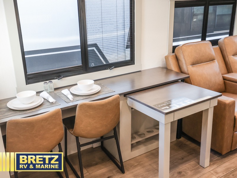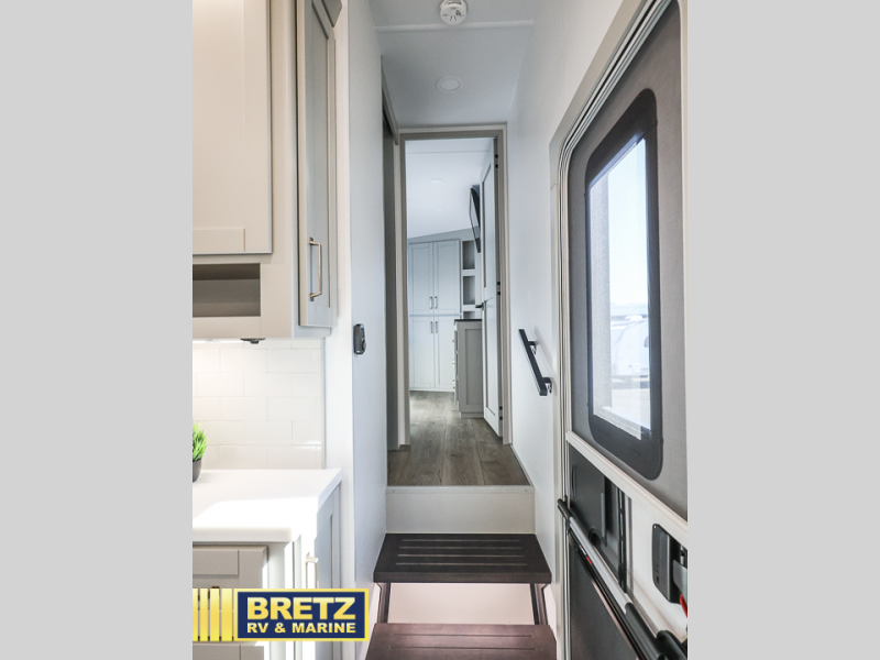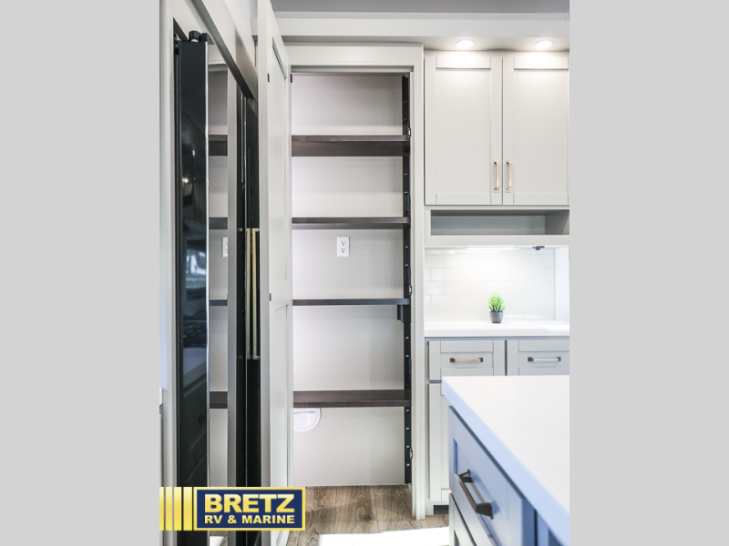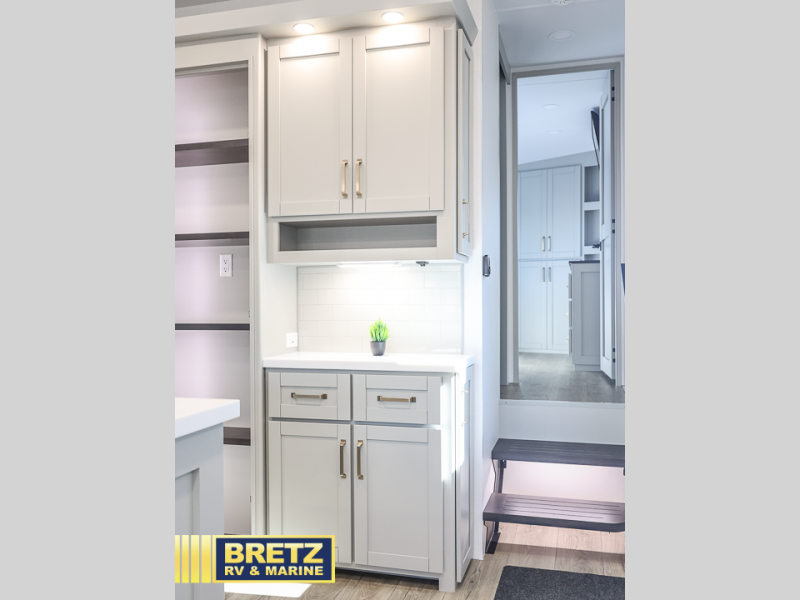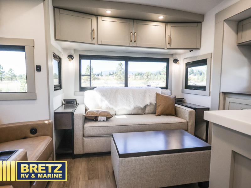 This Model Z luxury fifth wheel is bright and modern on the inside, with loads of amenities that will have you dreaming of your next trip! Enter and find a spacious combined living/kitchen space thanks to dual opposing slides. There is ample seating with a sliding desk/dining table, 62" theater seating, and a 72" tri-fold sofa along the rear wall. You can easily relax and enjoy the 50" Smart telescoping TV with a cozy fireplace below. The kitchen offers all that you need to prepare and cook meals just like home with a 16 cu. ft. refrigerator for your perishables, a 30" microwave oven, and three burner range top and oven. You will love the integrated spice rack, and the kitchen island all outfitted with dog bowls and double pull out trash bins with an integrated Stow 'N Go paper towel holder. There is also an 84" pantry with adjustable shelves for all of your canned and dry goods. Head up the steps to a private master suite with king bed slide. You can opt for the queen bed if you like. A sliding dresser top features hidden storage which is perfect for jewelry and other personal belongings. The front wardrobe features mirrored doors and the corner closet has been prepped for a stackable washer and dryer if you choose to add that option. Relax and enjoy a large bath featuring a linen cabinet, a 30" x 42" shower, and vanity with sink, plus medicine cabinet.