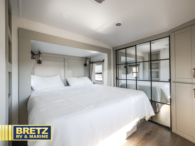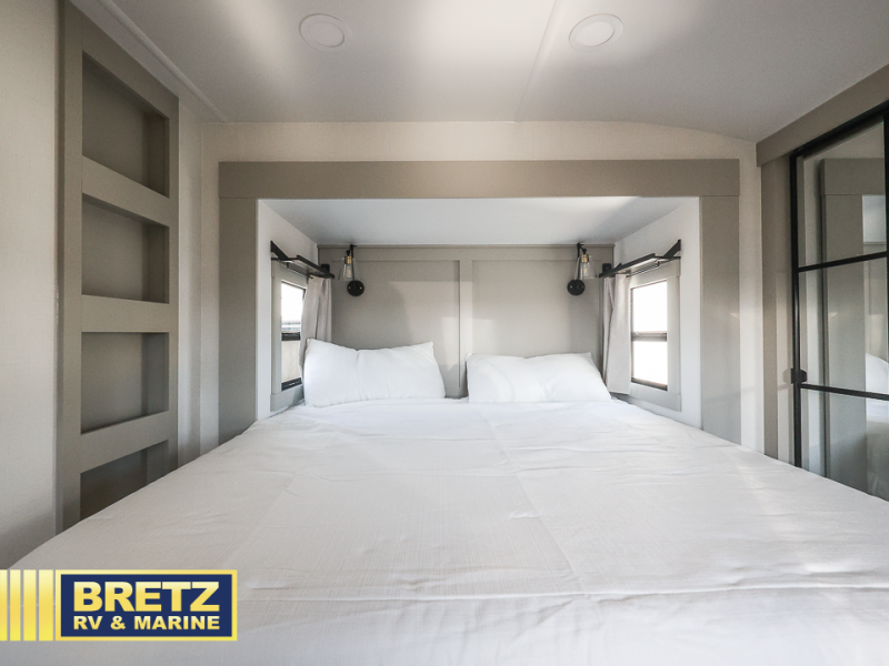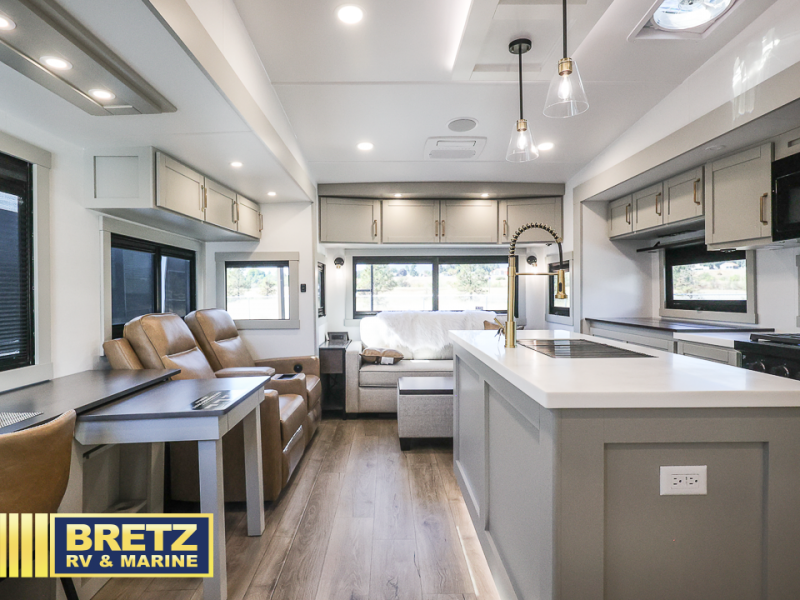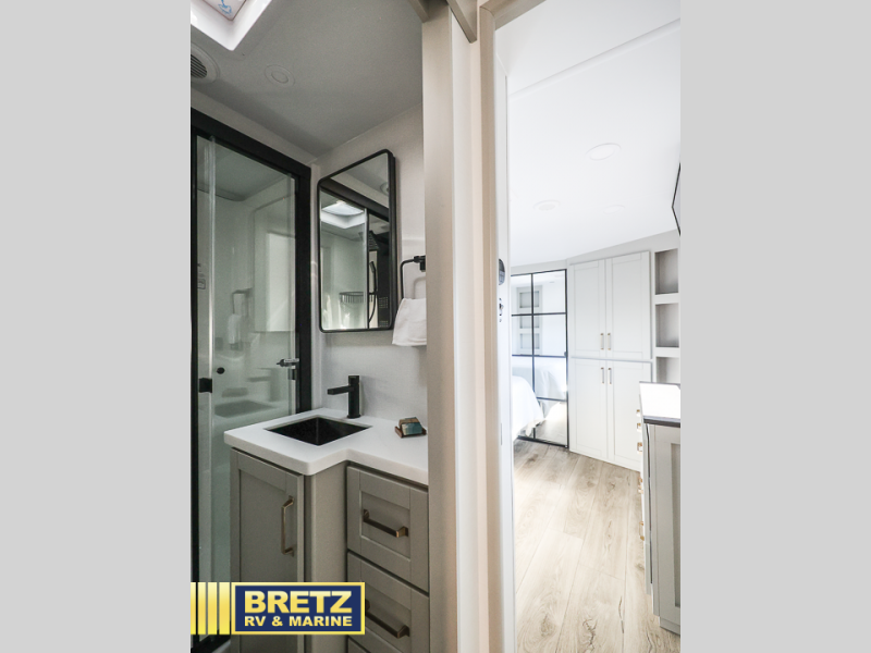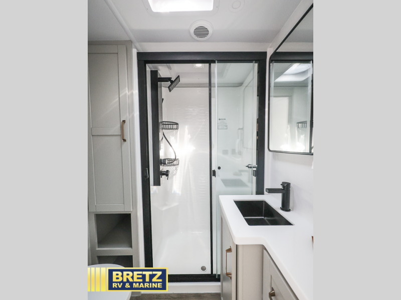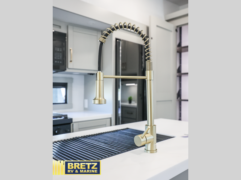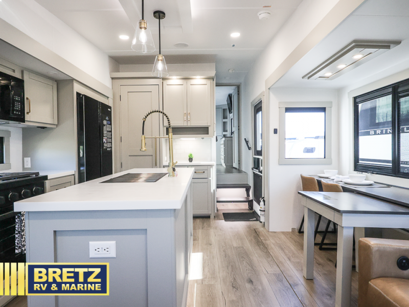 The Brinkley mid-profile Model Z fifth wheels bring you clean lines and an upscale look with plenty of style and exciting new features like the industry first brass plumbing connections. These units also feature an automotive grade front cap, plenty of exterior storage, dual exterior hot and cold showers, and wide stance leveling jacks for easy set up. Residential frameless windows provide a clean look and beautiful views, and ample electrical outlets and 6 USB/USB-C outlets allow all of your electronics and appliances to easily be used and charged.