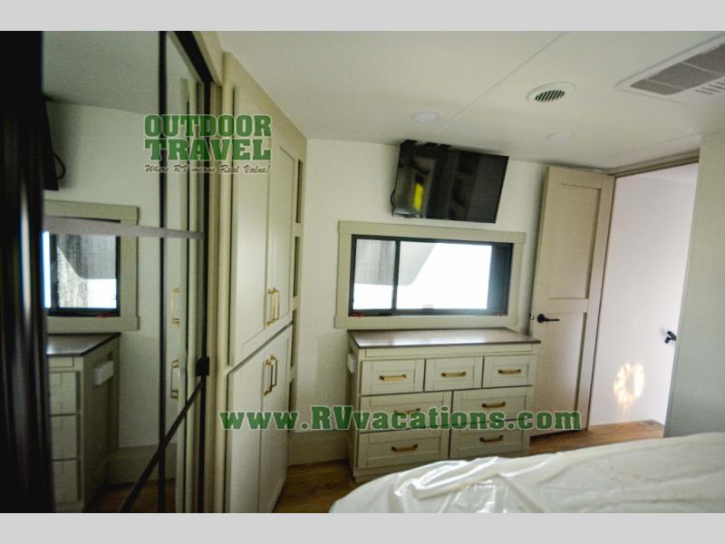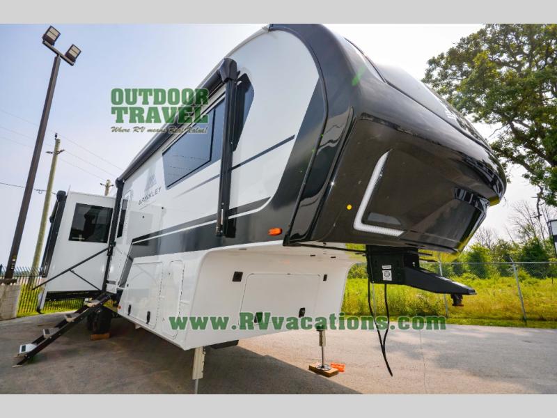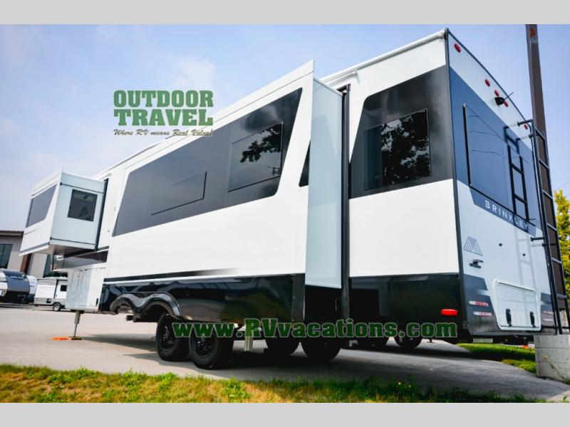The Brinkley mid-profile Model Z fifth wheels bring you clean lines and an upscale look with plenty of style and exciting new features like the industry first brass plumbing connections. These units also feature an automotive grade front cap, plenty of exterior storage, dual exterior hot and cold showers, and wide stance leveling jacks for easy set up. Residential frameless windows provide a clean look and beautiful views, and ample electrical outlets and 6 USB/USB-C outlets allow all of your electronics and appliances to easily be used and charged.
