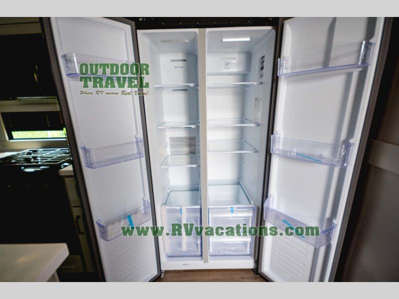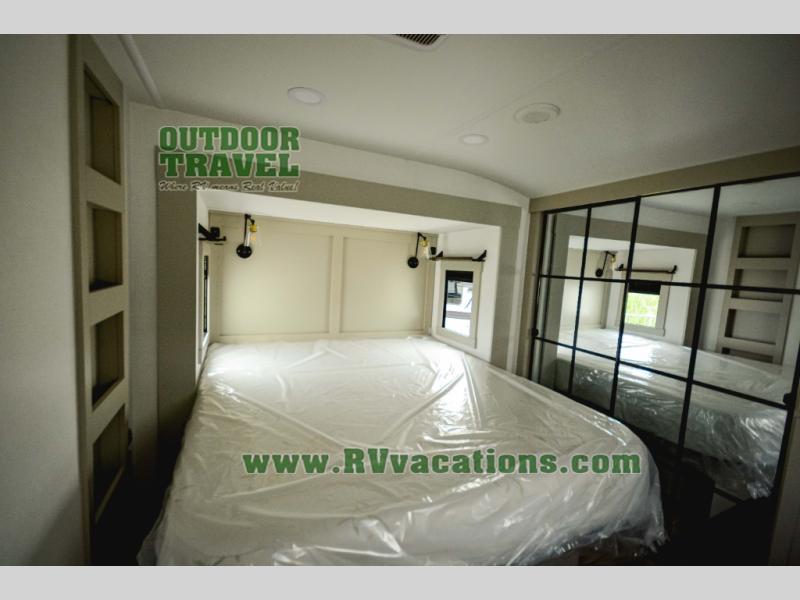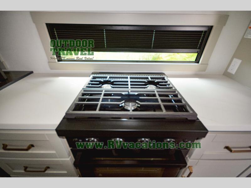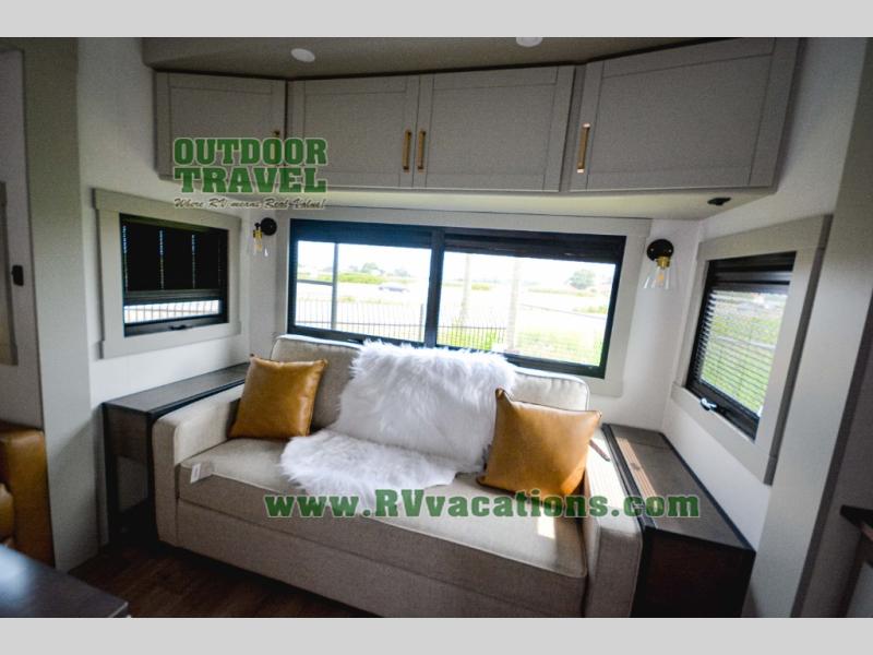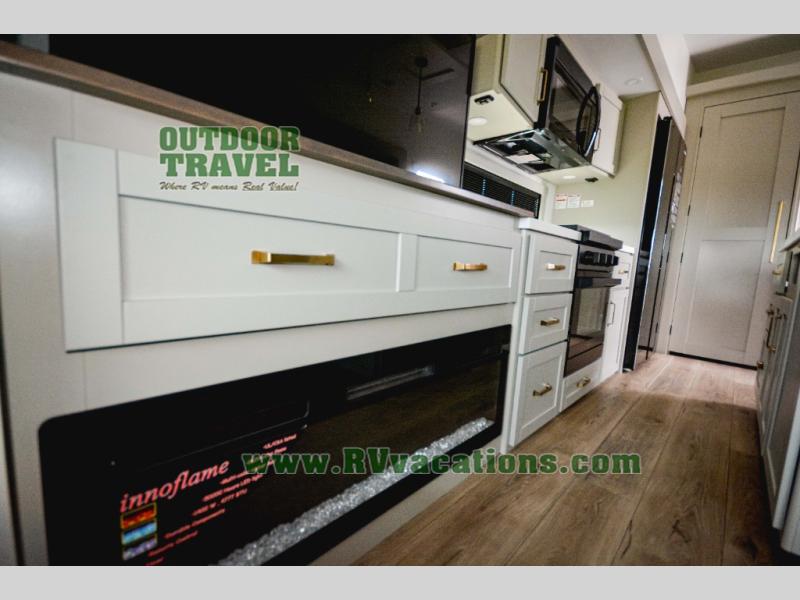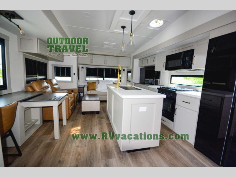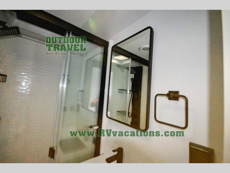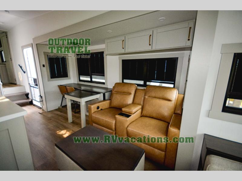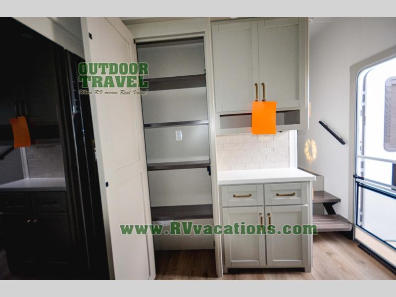 This Model Z luxury fifth wheel is bright and modern on the inside, with loads of amenities that will have you dreaming of your next trip! Enter and find a spacious combined living/kitchen space thanks to dual opposing slides. There is ample seating with a sliding desk/dining table, 62" theater seating, and a 72" tri-fold sofa along the rear wall. You can easily relax and enjoy the 50" Smart telescoping TV with a cozy fireplace below. The kitchen offers all that you need to prepare and cook meals just like home with a 16 cu. ft. refrigerator for your perishables, a 30" microwave oven, and three burner range top and oven. You will love the integrated spice rack, and the kitchen island all outfitted with dog bowls and double pull out trash bins with an integrated Stow 'N Go paper towel holder. There is also an 84" pantry with adjustable shelves for all of your canned and dry goods. Head up the steps to a private master suite with king bed slide. You can opt for the queen bed if you like. A sliding dresser top features hidden storage which is perfect for jewelry and other personal belongings. The front wardrobe features mirrored doors and the corner closet has been prepped for a stackable washer and dryer if you choose to add that option. Relax and enjoy a large bath featuring a linen cabinet, a 30" x 42" shower, and vanity with sink, plus medicine cabinet.
