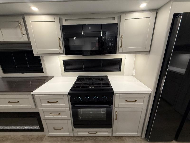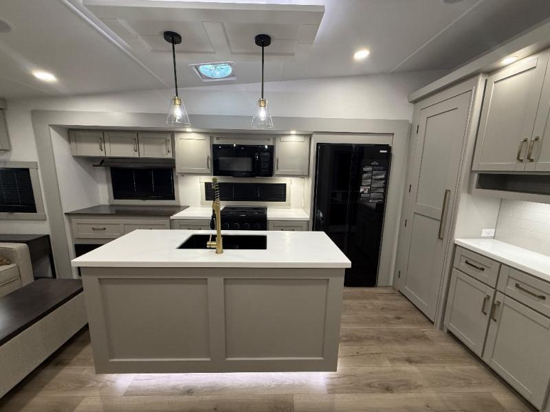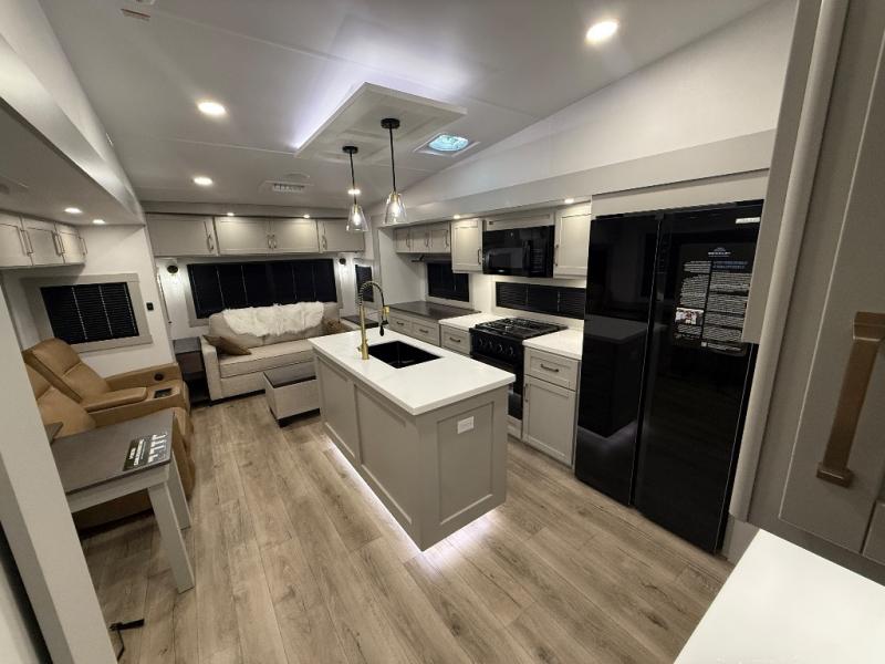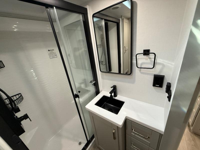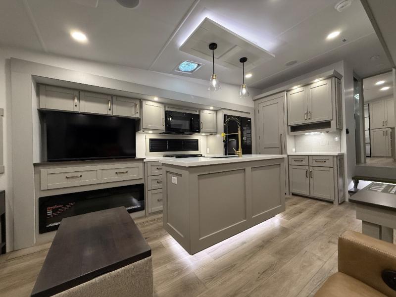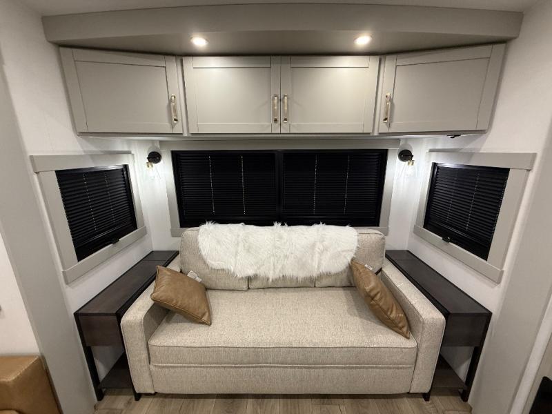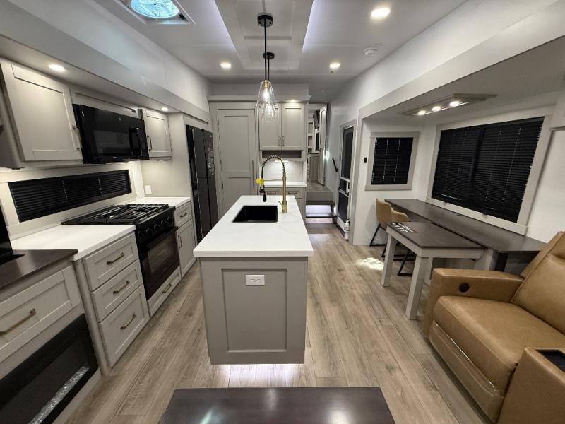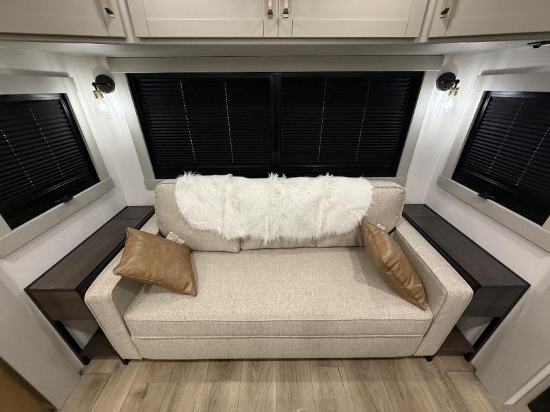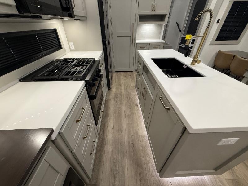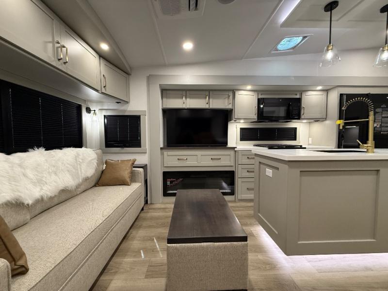 This Model Z luxury fifth wheel is bright and modern on the inside, with loads of amenities that will have you dreaming of your next trip! Enter and find a spacious combined living/kitchen space thanks to dual opposing slides. There is ample seating with a sliding desk/dining table, 62" theater seating, and a 72" tri-fold sofa along the rear wall. You can easily relax and enjoy the 50" Smart telescoping TV with a cozy fireplace below. The kitchen offers all that you need to prepare and cook meals just like home with a 16 cu. ft. refrigerator for your perishables, a 30" microwave oven, and three burner range top and oven. You will love the integrated spice rack, and the kitchen island all outfitted with dog bowls and double pull out trash bins with an integrated Stow 'N Go paper towel holder. There is also an 84" pantry with adjustable shelves for all of your canned and dry goods. Head up the steps to a private master suite with king bed slide. You can opt for the queen bed if you like. A sliding dresser top features hidden storage which is perfect for jewelry and other personal belongings. The front wardrobe features mirrored doors and the corner closet has been prepped for a stackable washer and dryer if you choose to add that option. Relax and enjoy a large bath featuring a linen cabinet, a 30" x 42" shower, and vanity with sink, plus medicine cabinet.