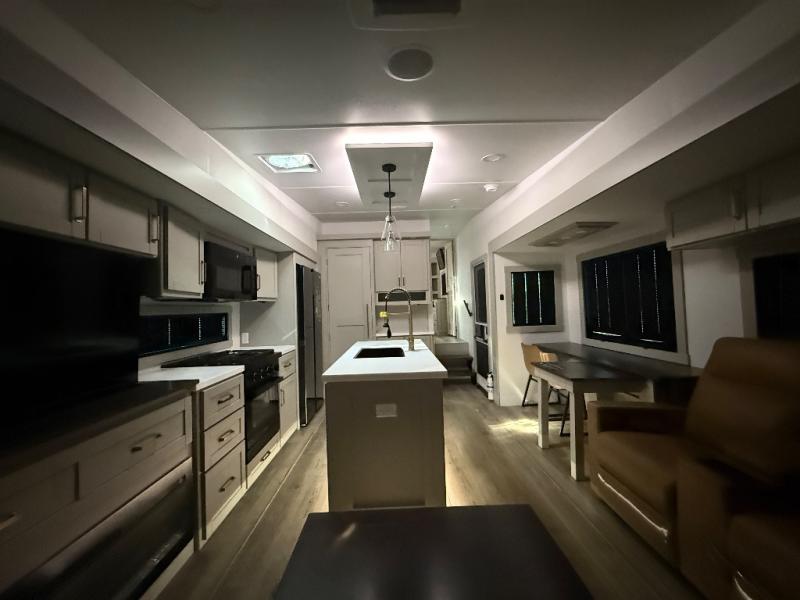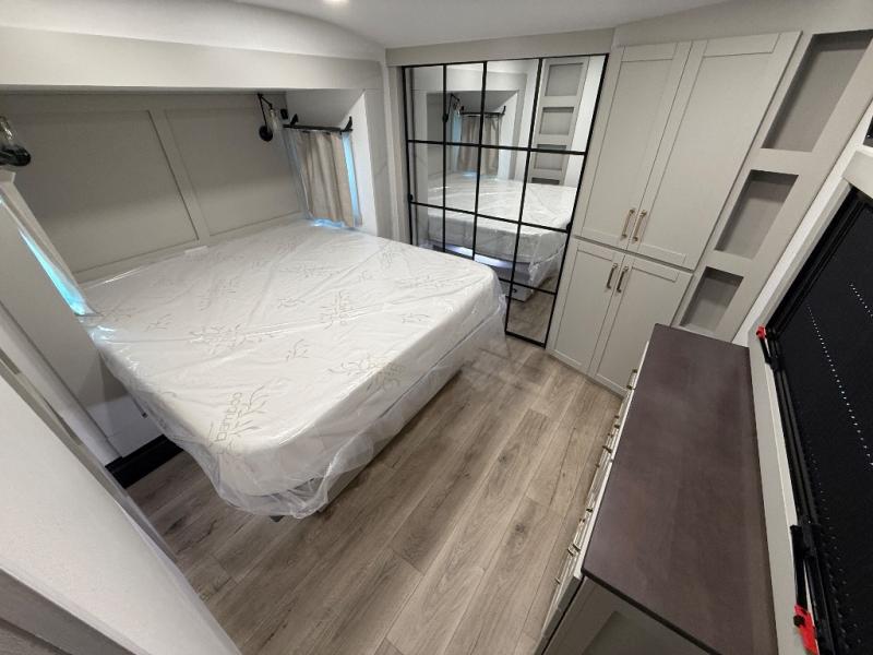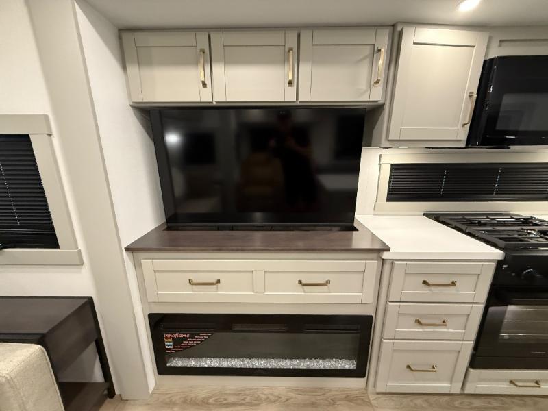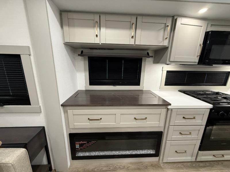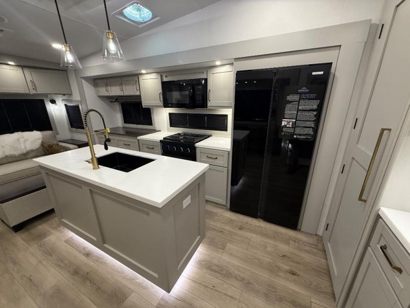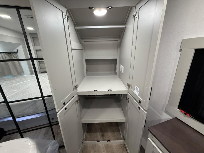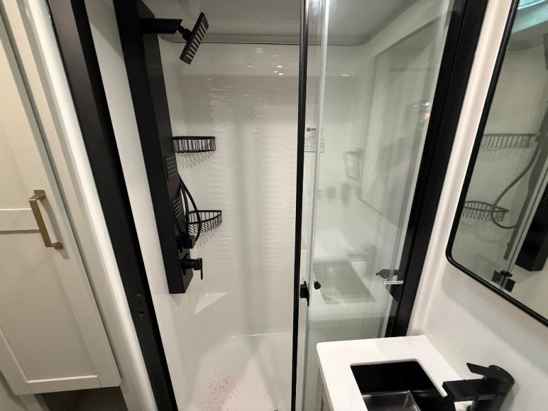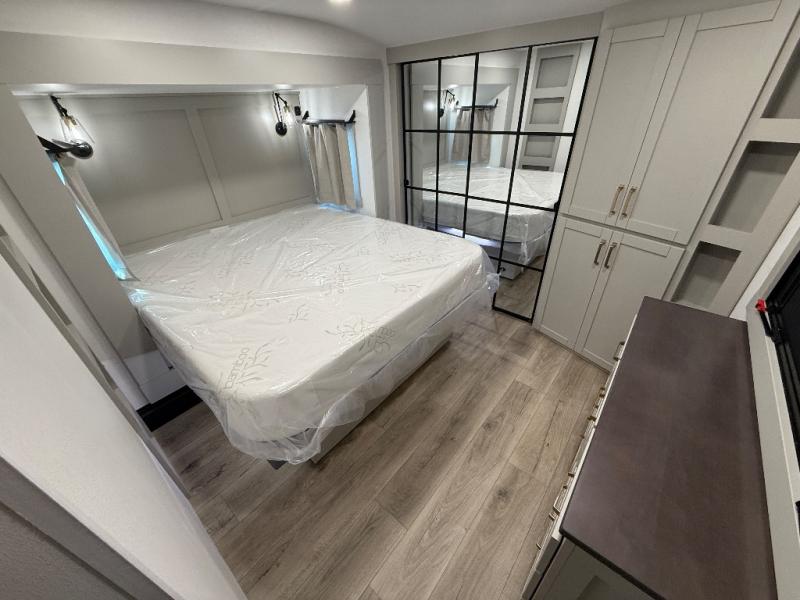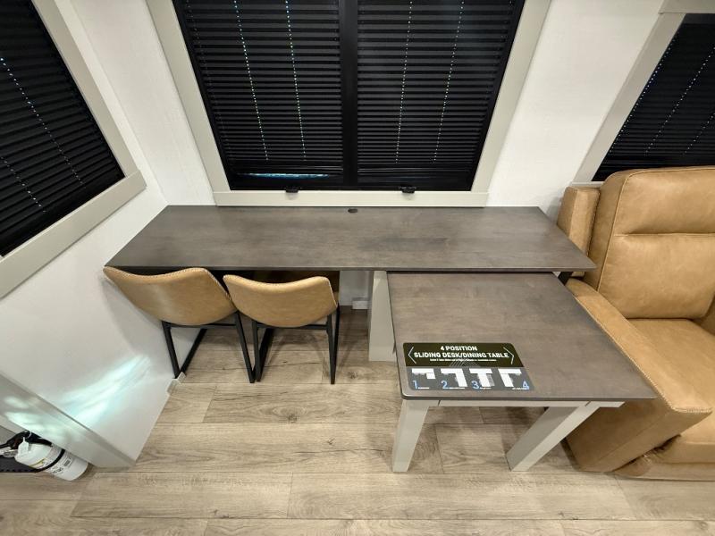This Model Z luxury fifth wheel is bright and modern on the inside, with loads of amenities that will have you dreaming of your next trip! Enter and find a spacious combined living/kitchen space thanks to dual opposing slides. There is ample seating with a sliding desk/dining table, 62" theater seating, and a 72" tri-fold sofa along the rear wall. You can easily relax and enjoy the 50" Smart telescoping TV with a cozy fireplace below. The kitchen offers all that you need to prepare and cook meals just like home with a 16 cu. ft. refrigerator for your perishables, a 30" microwave oven, and three burner range top and oven. You will love the integrated spice rack, and the kitchen island all outfitted with dog bowls and double pull out trash bins with an integrated Stow 'N Go paper towel holder. There is also an 84" pantry with adjustable shelves for all of your canned and dry goods. Head up the steps to a private master suite with king bed slide. You can opt for the queen bed if you like. A sliding dresser top features hidden storage which is perfect for jewelry and other personal belongings. The front wardrobe features mirrored doors and the corner closet has been prepped for a stackable washer and dryer if you choose to add that option. Relax and enjoy a large bath featuring a linen cabinet, a 30" x 42" shower, and vanity with sink, plus medicine cabinet.