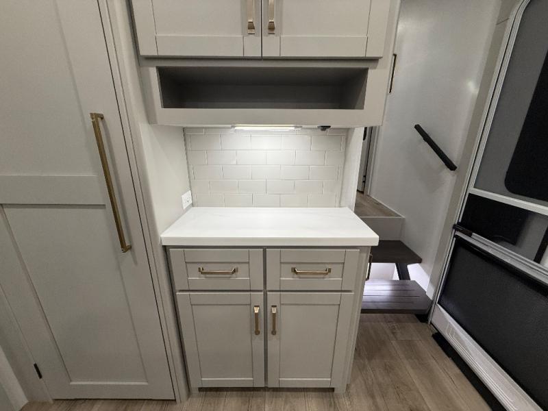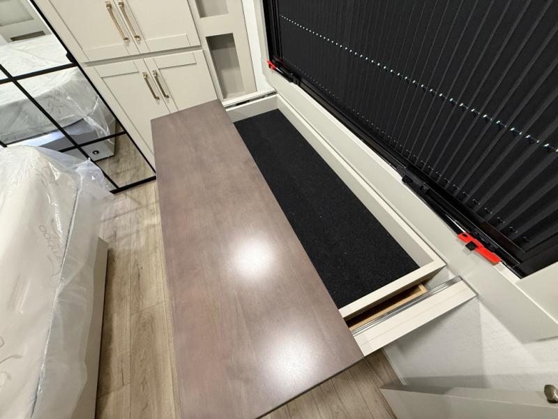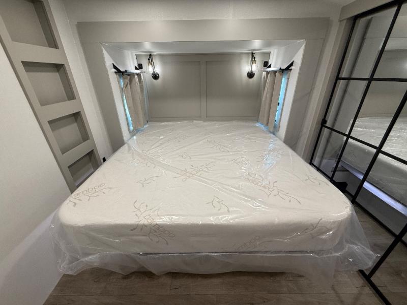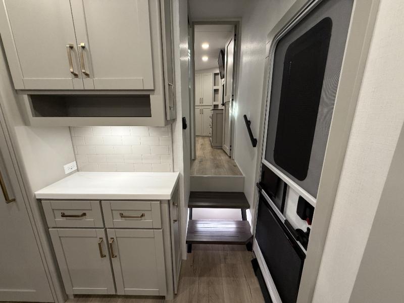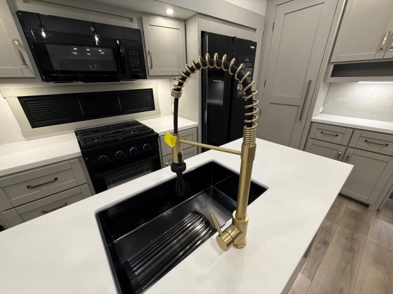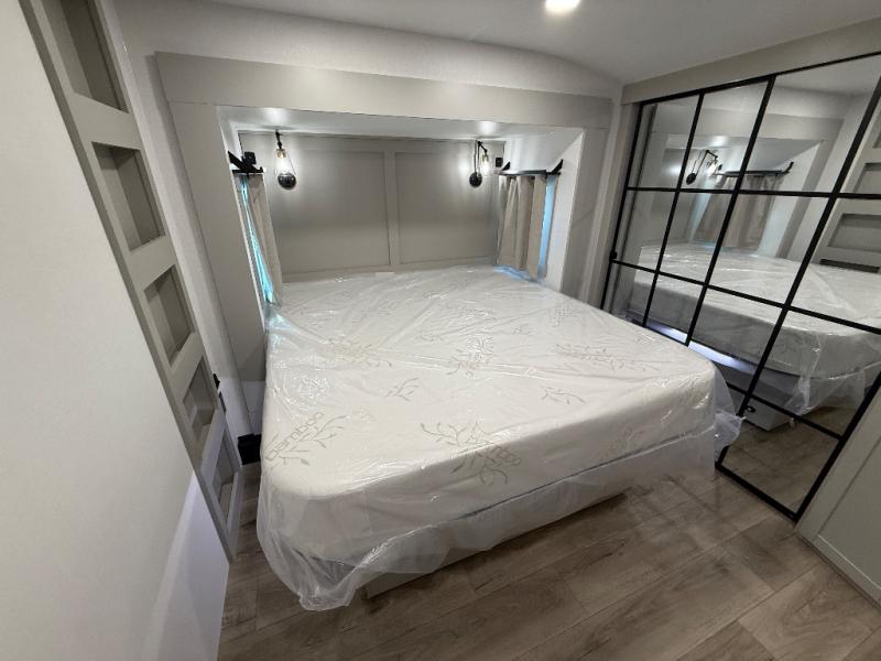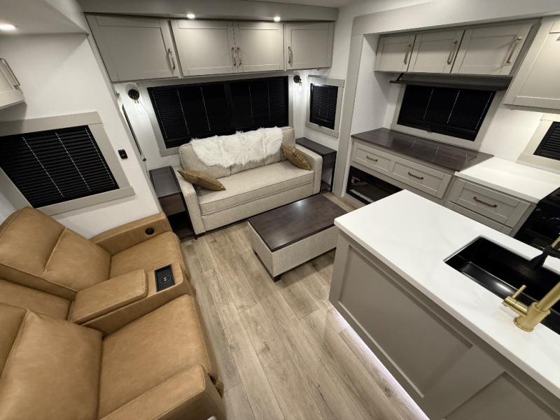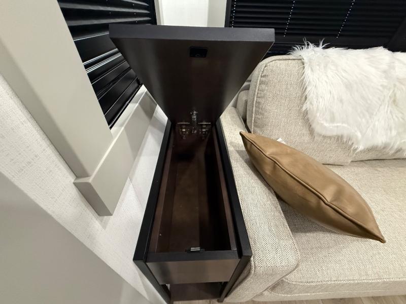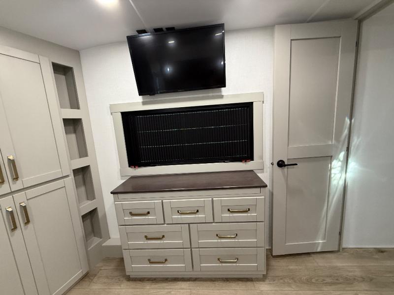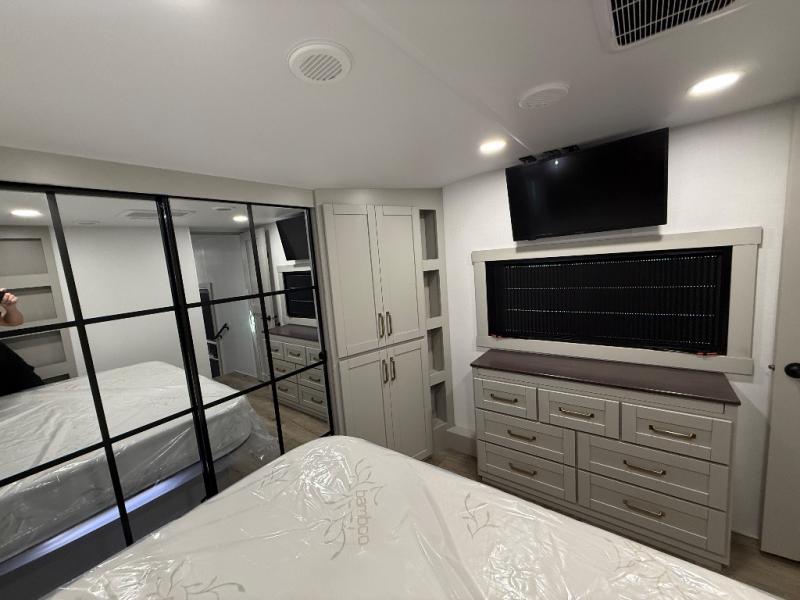This Model Z luxury fifth wheel is bright and modern on the inside, with loads of amenities that will have you dreaming of your next trip! Enter and find a spacious combined living/kitchen space thanks to dual opposing slides. There is ample seating with a sliding desk/dining table, 62" theater seating, and a 72" tri-fold sofa along the rear wall. You can easily relax and enjoy the 50" Smart telescoping TV with a cozy fireplace below. The kitchen offers all that you need to prepare and cook meals just like home with a 16 cu. ft. refrigerator for your perishables, a 30" microwave oven, and three burner range top and oven. You will love the integrated spice rack, and the kitchen island all outfitted with dog bowls and double pull out trash bins with an integrated Stow 'N Go paper towel holder. There is also an 84" pantry with adjustable shelves for all of your canned and dry goods. Head up the steps to a private master suite with king bed slide. You can opt for the queen bed if you like. A sliding dresser top features hidden storage which is perfect for jewelry and other personal belongings. The front wardrobe features mirrored doors and the corner closet has been prepped for a stackable washer and dryer if you choose to add that option. Relax and enjoy a large bath featuring a linen cabinet, a 30" x 42" shower, and vanity with sink, plus medicine cabinet.