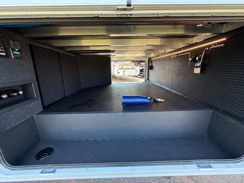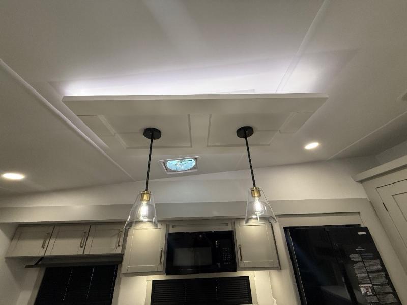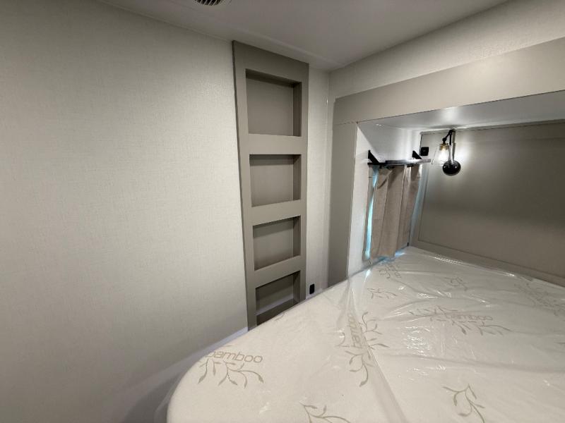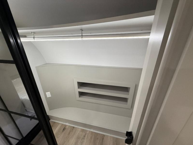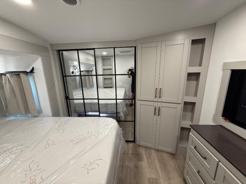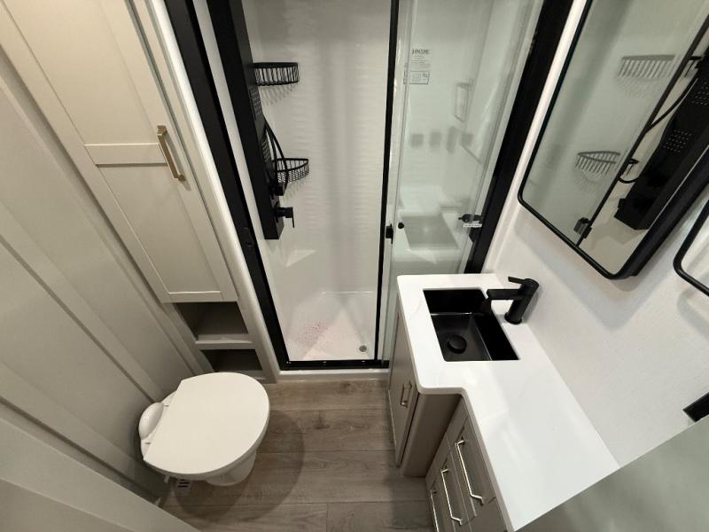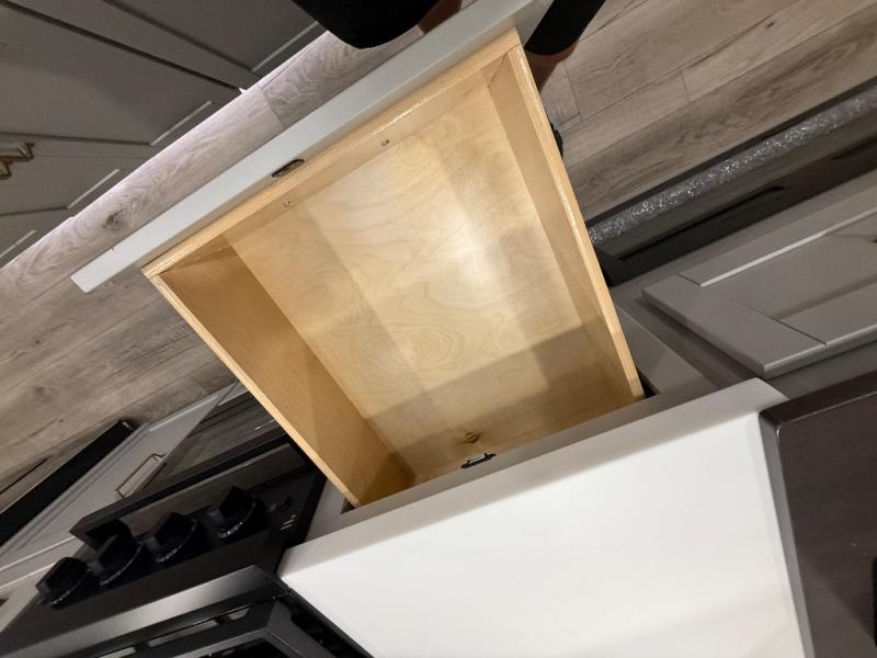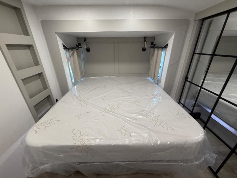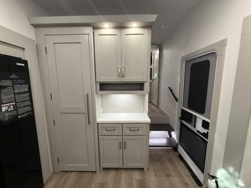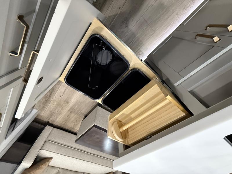 This Model Z luxury fifth wheel is bright and modern on the inside, with loads of amenities that will have you dreaming of your next trip! Enter and find a spacious combined living/kitchen space thanks to dual opposing slides. There is ample seating with a sliding desk/dining table, 62" theater seating, and a 72" tri-fold sofa along the rear wall. You can easily relax and enjoy the 50" Smart telescoping TV with a cozy fireplace below. The kitchen offers all that you need to prepare and cook meals just like home with a 16 cu. ft. refrigerator for your perishables, a 30" microwave oven, and three burner range top and oven. You will love the integrated spice rack, and the kitchen island all outfitted with dog bowls and double pull out trash bins with an integrated Stow 'N Go paper towel holder. There is also an 84" pantry with adjustable shelves for all of your canned and dry goods. Head up the steps to a private master suite with king bed slide. You can opt for the queen bed if you like. A sliding dresser top features hidden storage which is perfect for jewelry and other personal belongings. The front wardrobe features mirrored doors and the corner closet has been prepped for a stackable washer and dryer if you choose to add that option. Relax and enjoy a large bath featuring a linen cabinet, a 30" x 42" shower, and vanity with sink, plus medicine cabinet.