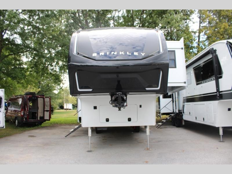 The Brinkley mid-profile Model Z fifth wheels bring you clean lines and an upscale look with plenty of style and exciting new features like the industry first brass plumbing connections. These units also feature an automotive grade front cap, plenty of exterior storage, dual exterior hot and cold showers, and wide stance leveling jacks for easy set up. Residential frameless windows provide a clean look and beautiful views, and ample electrical outlets and 6 USB/USB-C outlets allow all of your electronics and appliances to easily be used and charged.