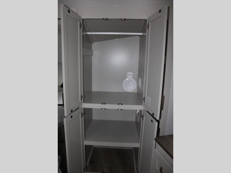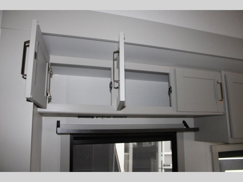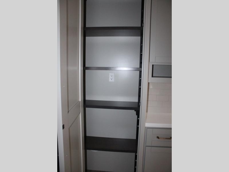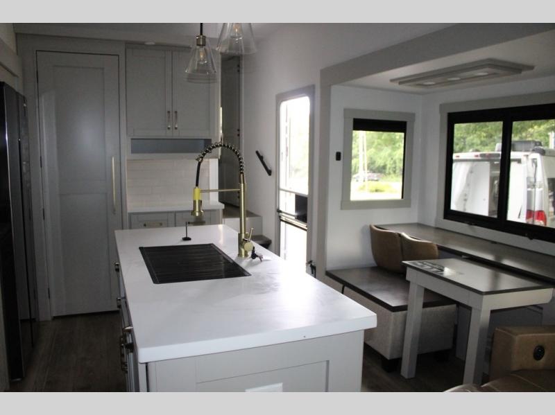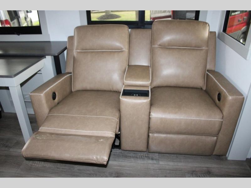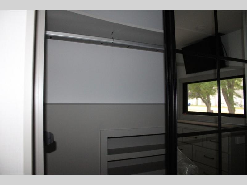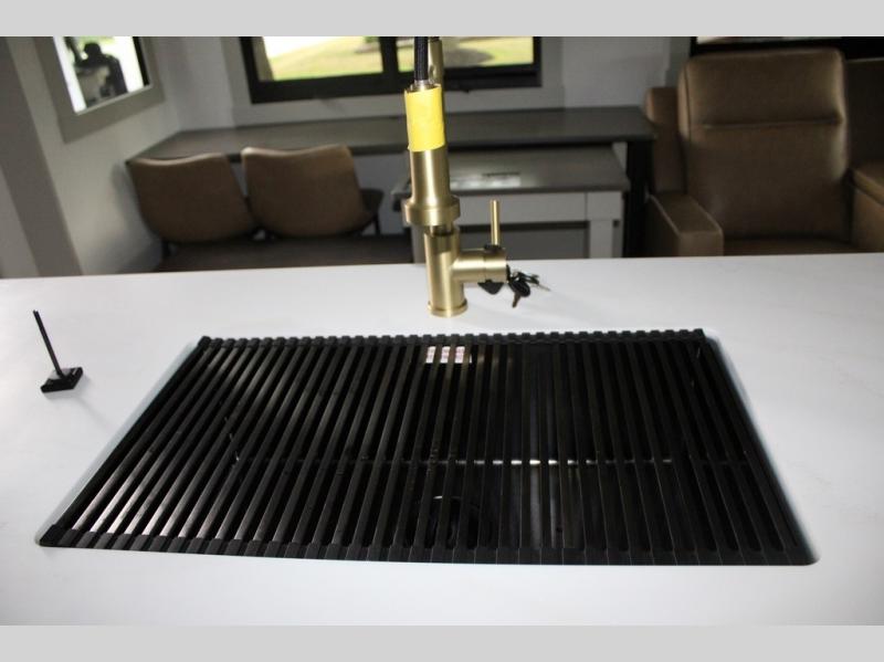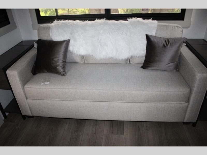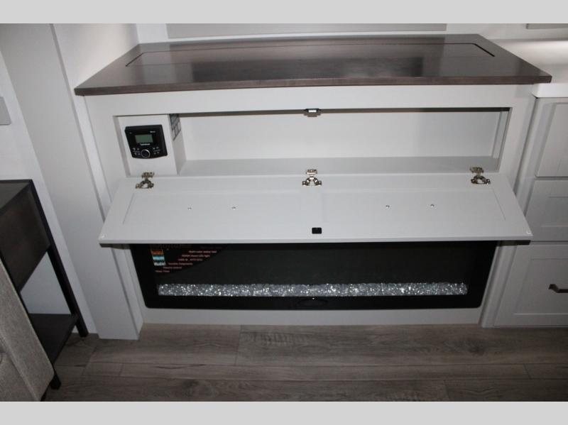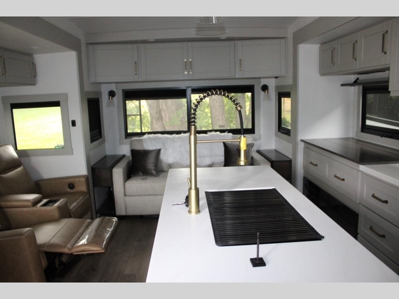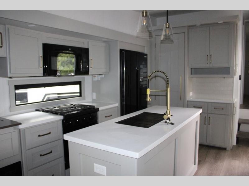 This Model Z luxury fifth wheel is bright and modern on the inside, with loads of amenities that will have you dreaming of your next trip! Enter and find a spacious combined living/kitchen space thanks to dual opposing slides. There is ample seating with a sliding desk/dining table, 62" theater seating, and a 72" tri-fold sofa along the rear wall. You can easily relax and enjoy the 50" Smart telescoping TV with a cozy fireplace below. The kitchen offers all that you need to prepare and cook meals just like home with a 16 cu. ft. refrigerator for your perishables, a 30" microwave oven, and three burner range top and oven. You will love the integrated spice rack, and the kitchen island all outfitted with dog bowls and double pull out trash bins with an integrated Stow 'N Go paper towel holder. There is also an 84" pantry with adjustable shelves for all of your canned and dry goods. Head up the steps to a private master suite with king bed slide. You can opt for the queen bed if you like. A sliding dresser top features hidden storage which is perfect for jewelry and other personal belongings. The front wardrobe features mirrored doors and the corner closet has been prepped for a stackable washer and dryer if you choose to add that option. Relax and enjoy a large bath featuring a linen cabinet, a 30" x 42" shower, and vanity with sink, plus medicine cabinet.