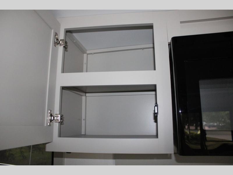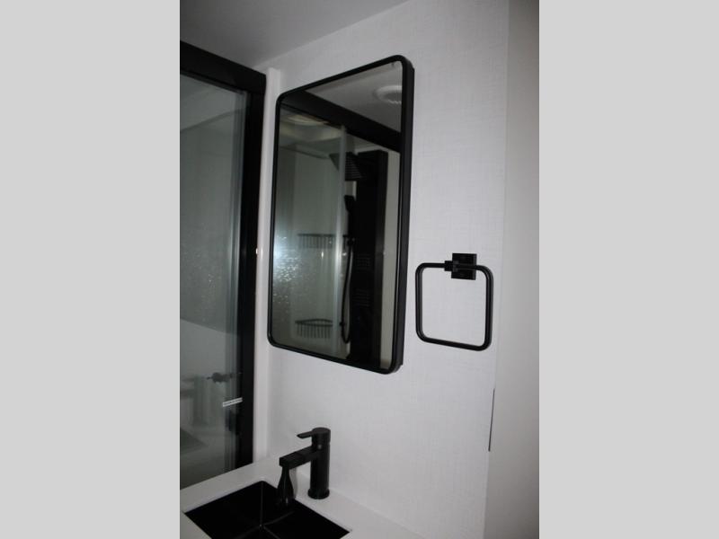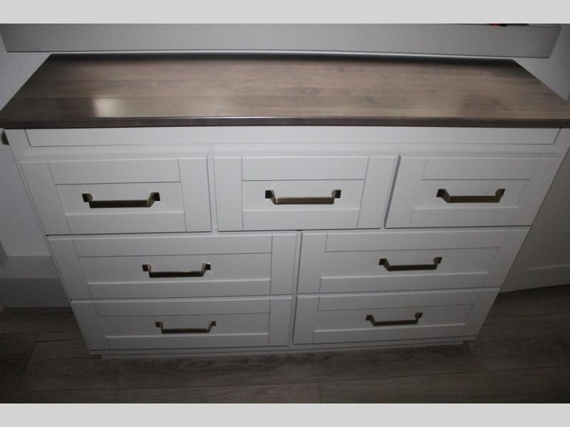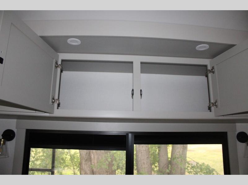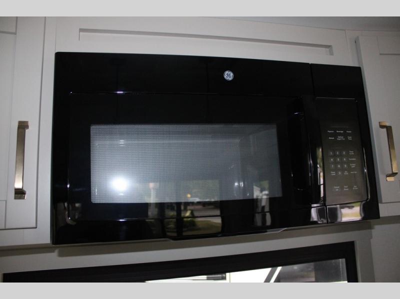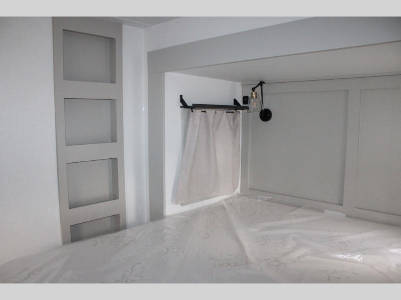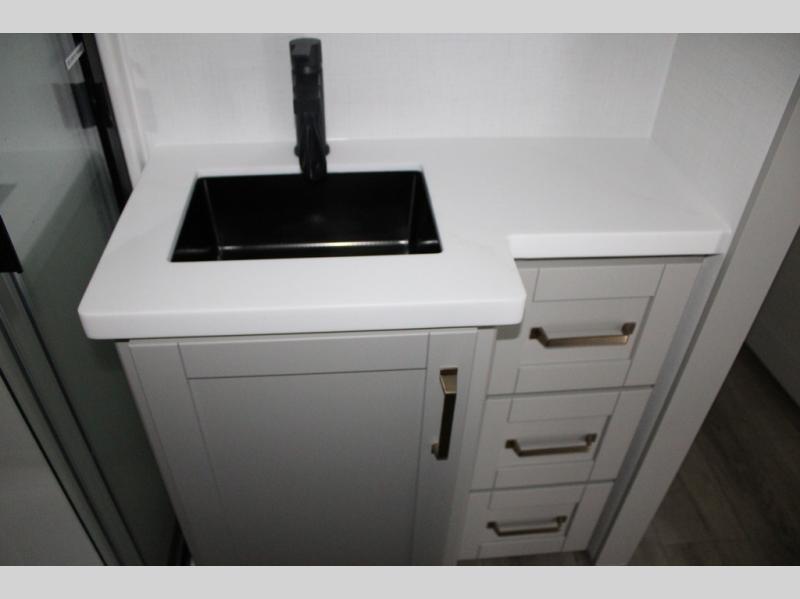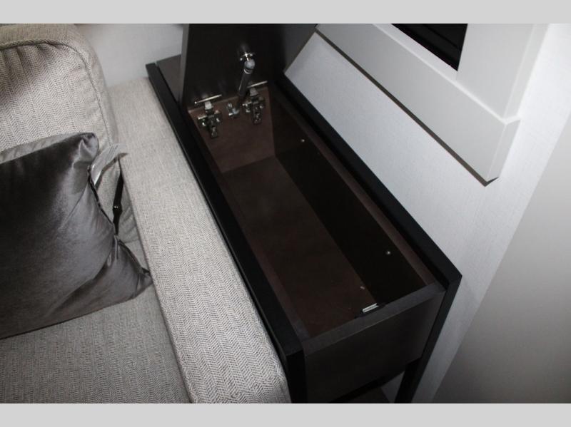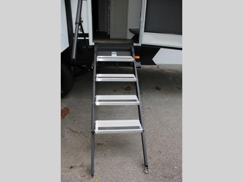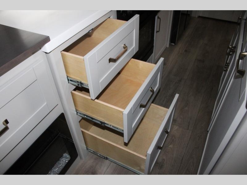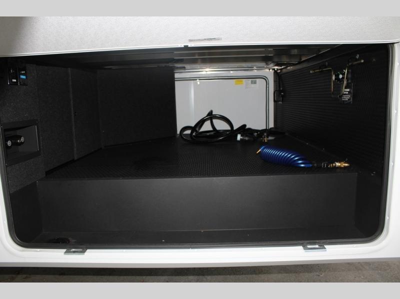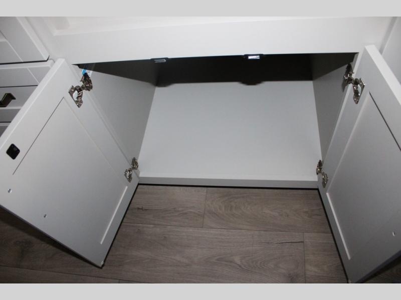This Model Z luxury fifth wheel is bright and modern on the inside, with loads of amenities that will have you dreaming of your next trip! Enter and find a spacious combined living/kitchen space thanks to dual opposing slides. There is ample seating with a sliding desk/dining table, 62" theater seating, and a 72" tri-fold sofa along the rear wall. You can easily relax and enjoy the 50" Smart telescoping TV with a cozy fireplace below. The kitchen offers all that you need to prepare and cook meals just like home with a 16 cu. ft. refrigerator for your perishables, a 30" microwave oven, and three burner range top and oven. You will love the integrated spice rack, and the kitchen island all outfitted with dog bowls and double pull out trash bins with an integrated Stow 'N Go paper towel holder. There is also an 84" pantry with adjustable shelves for all of your canned and dry goods. Head up the steps to a private master suite with king bed slide. You can opt for the queen bed if you like. A sliding dresser top features hidden storage which is perfect for jewelry and other personal belongings. The front wardrobe features mirrored doors and the corner closet has been prepped for a stackable washer and dryer if you choose to add that option. Relax and enjoy a large bath featuring a linen cabinet, a 30" x 42" shower, and vanity with sink, plus medicine cabinet.